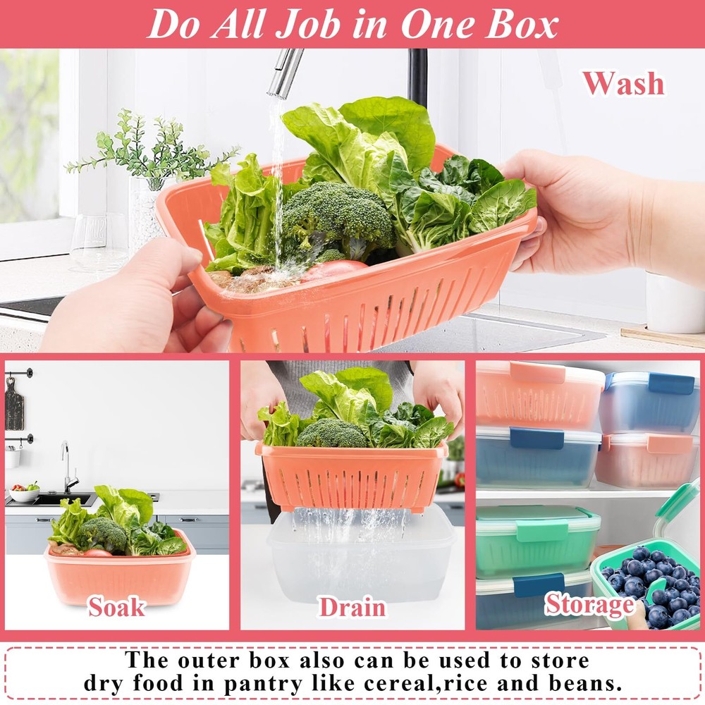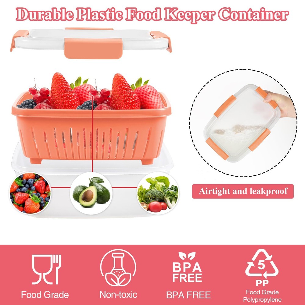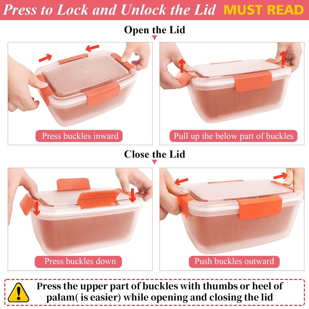 NOTE: !!!!!!!!!!You need to PRESS THE BUCKLES with fingers or the heel of palm to LOCK(Press outward) and UNLOCK (Press inward the lid), with heel of palm is easier, please check with the video to understand more clearly. 【Airtight & Leakproof Berry Containers】The better the air tightness, the better the preservation effect. So, we designed the berry keeper lid with a sealing ring and unique buckle design to be tight and keep food fresh. But it requires you to open and close by PRESSING. 【Durable & Food Fruit Storage Containers】Our refrigerator organizers and storage bins are made of high-quality food-PP material that is BPA-free. Durable and stackable to save space and easy to carry. 【Powerful Berry Drainer Basket】The inner fruit colanders have elongated holes that drain more efficiently than colanders with round filter holes. High feet keep the berry basket promote airflow, so your food will not retain redundant moisture and thus spoil. The raised handle in the middle makes it easier to hold during use Always keep your fruit and vegetables cool, crisp and fresh with this berry drainer basket. 【Multiple Fresh Food Containers】As fruit strainer container with lid, it’s perfect for berries like blueberries, grapes, strawberries, lemons, mangos, avocados, and cherry , cut fruits like watermelons, and small-size vegetables like asparagus, cabbages, brussels sprouts, carrots mushrooms, arugula, asparagus, onions, potatoes, carrots, etc. It is also suitable for meat preservation and storage such as steaks waiting to thaw. 【Also is Food Storage Organizer 】Not only is vegetables/ fruit storage container for fridge to keep produce fresh, the outer box also can be used to dry food in pantry, like cereal, rice, and beans. 【Dishwasher & Microwave & Freezer Safe 】The lettuce keeper for refrigerator is easy to wash with dishwasher, which can help you free of complex housework. They are also microwave and freezer safe to meet your daily use.