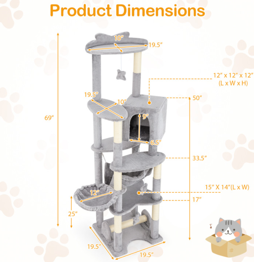 Material Engineered Wood, Sisal, Teddy Fleece Overall Height 69" Base Size 19.5" x 19.5" Top Perch Size 19.5" x 10" Condo Size 12" x 12" x 12" Each Tier Weight Capacity 11 lbs Net Weight 30 lbs
