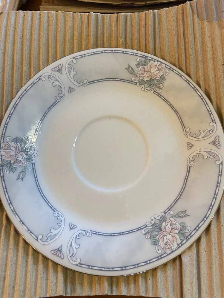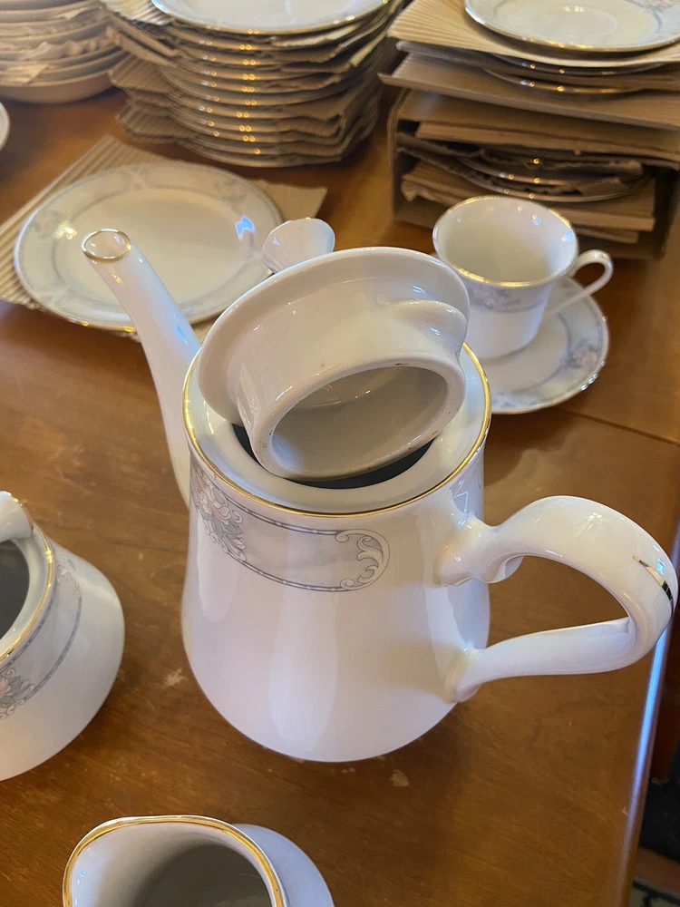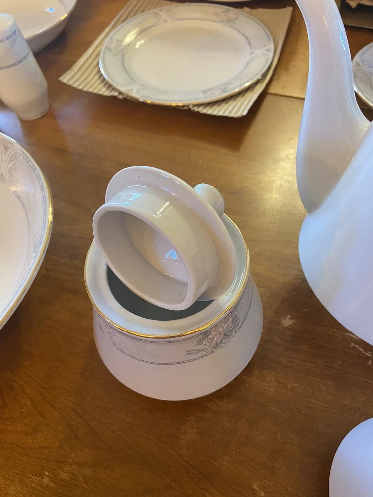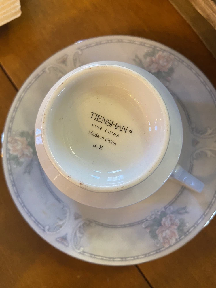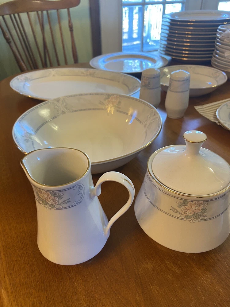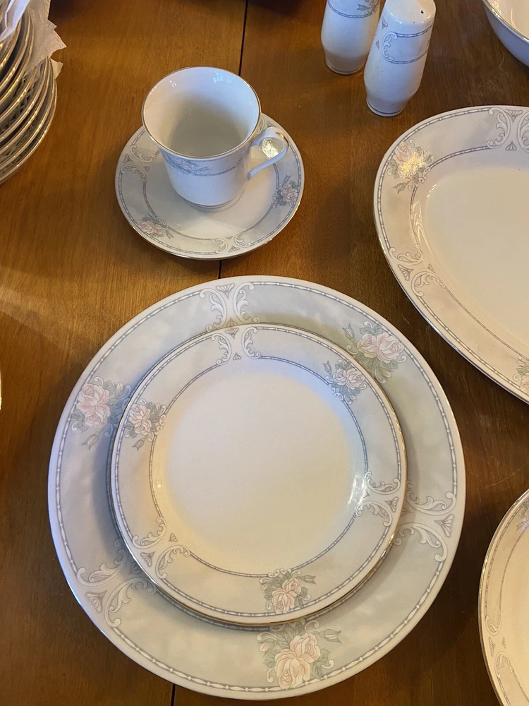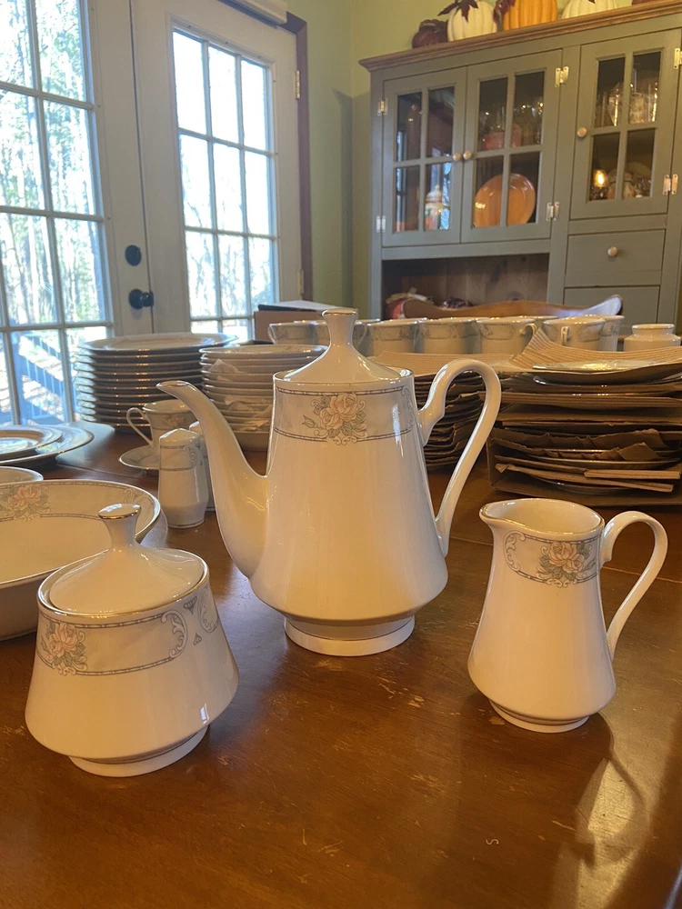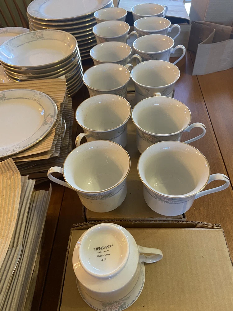 This is a 69 piece set of Tienshan roses with gold trim ‘Regency’ pattern fine bone China in great condition - not a single chip or crack anywhere. (salt & pepper shakers even have the original stoppers) 12 Dinner Plates 10 1/4” 12 Salad Plates 7 1/2” 12 Bowls 7 1/2” 14 Footed Tea Cups and 12 Saucers 6” 1 Coffee (or tea) Pot with lid 1 Creamer, 1 Sugar Bowl w/lid 1 Set of Salt & Pepper Shakers 1 Serving Bowl 9 1/4” 1 Serving Platter 9 3/4” x 14” Prefer to sell as a complete set, but open to offers on individual pieces.