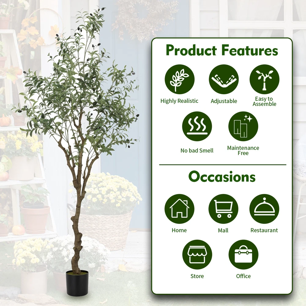 Other | | | | | | 6.9FT Faux Olive Tree, Artificial Tall Olive Tree Plants, Fake Potted Olivek > > > > > > < < < < < < < < < < < < < > > > > > > > > > > > > > Description: Realistic Simulation: This 6.9 feet faux olive tree is carefully crafted to mimic the appearance of an olive tree, looking as close to reality as possible. Single trunk splits into several stems, adorned with dozens of olive fruits, which is made of rubber silk fabric. Clearly textured olive leaves and vivid color makes this fake tree a timeless seasonal home decor and will definitely make you feel the existence of nature. Free Maintenance: This olive tree artificial indoor doesn't need sunlight, and fertilizing and watering it will save you from the trouble of falling leaves. Make sure artificial olive trees are realistic, evergreen, and require no pruning. No need to water every day or pay special attention, just wipe it off with a damp cloth when it gets dusty. You will love how it brings life to your room without the added maintenance of a live plant. Safe Materials: This faux olive tree is made of sturdy and premium material (real touch, waterproof). The nursery pot is made of hard plastic material with cement poured inside which to prevent children, pets to knock it down. We suggest to placing it in bigger decorative planter to make the faux tree be more perfect. All materials are flame-retardant treated, without any odor, so it is no problem even if placed in a sealed environment. Easy to Assemble: The artificial olive tree is easy to install, just loosen the black straps on the trunk and insert the corresponding numbered branches into the trunk. And the main tree trunk come pre-assembled in heavy-duty pots made of plastic and concrete, so each tree can stand on its own. Perfect Size for Decoration: This 6.9ft tall olive tree artificial is perfectly sized for interior decoration, which is a great ideal decorating for living rooms, bedrooms, study room, dining rooms and offices, and is also perfect for entryways, patios and commercial locations such as bookstores and coffee shops. Item Name: Simulated Olive Tree Material: Faux Leather Features: Realistic Looking, Vivid Appearance, Clear Texture Size Details: L: 15cm/5.91", W: 15cm/5.91", H: 210cm/82.68" (Approx.) Notes: Due to the light and screen setting difference, the item's color may be slightly different from the pictures. Please allow slight dimension difference due to different manual measurement. Package Includes: 1 x Simulated Olive Tree Payment Shipping Return Contact Us 1. We acceptPayPal,Credit card,Debit card,Apple Pay,Google Pay ect as payment. 2. Please be sure your shipping address is correct before make a payment. 1. We ship to your eBay or Paypal address. Please make sure your eBay and Paypal address is correct before you pay. 2. Items will be shipped within 1-7 business days when we received payment. 3. Delivery time depends on destination and other factors. 4. International buyers please note: a. Import duties, taxes and charges are not included in the item price or shipping charges. These charges are buyer's responsibility. We will try our best to reduce the risk of the custom duties. b. Please check with your country's customs office to determine what these additional costs will be prior to buying. 30 DAY RETURN POLICY Customer Satisfaction is our main goal, all items are quality checked prior to being listed and sent out. Please contact us prior to leaving any Negative Feedback and allow us to make things right! If you not satisfied with it please include the original packaging and return form & tracking number otherwise the return may take longer to process the refund. Once we have received the item and inspected it we will issue the refund or resend within 1-7 business days. Please contact us in time if any enquriy under any circumstances. We greatly appreciate your positive feedback and we'll do the same to you. We care about our valued customers, and will always try our best to help you, if you have any problems. Working time: Greenwich Mean Time+8 / 9:00-18:30 in normal we will reply you in one working day.