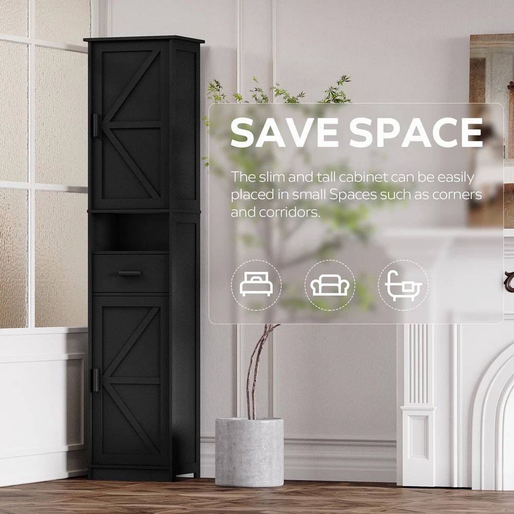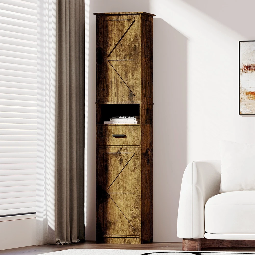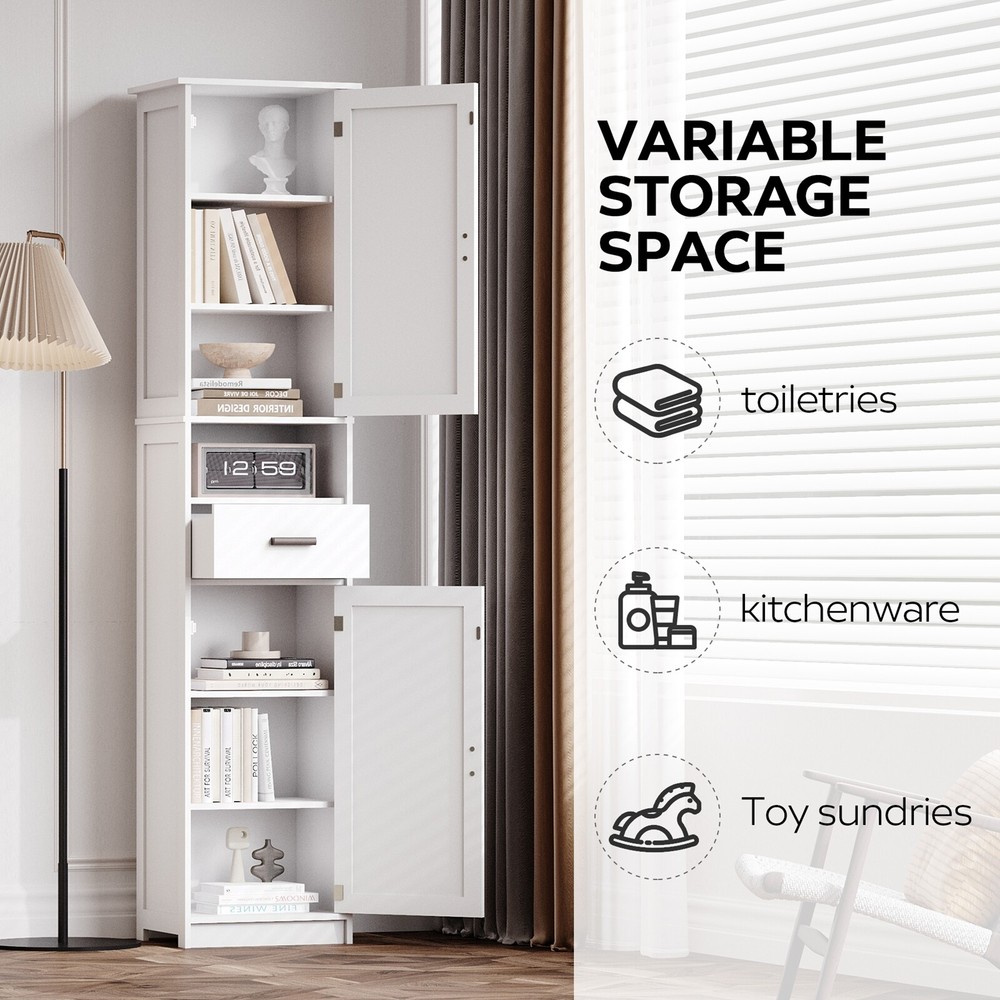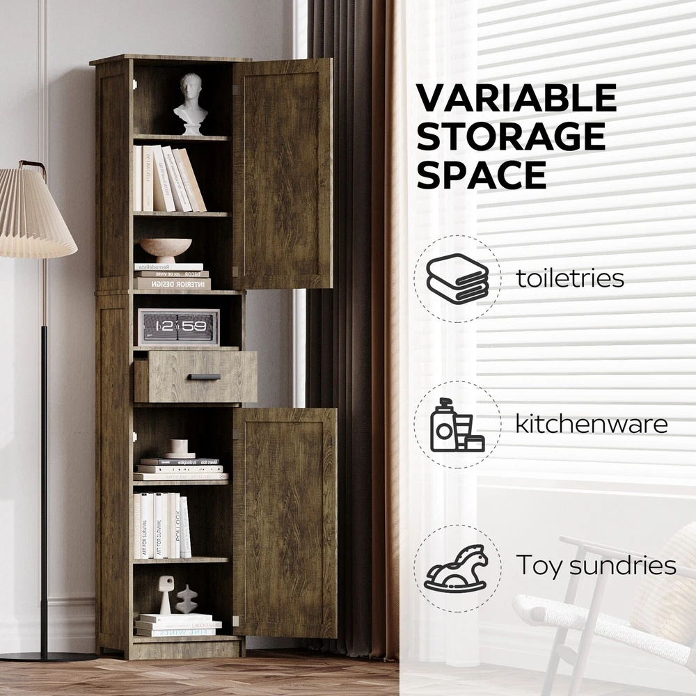 69" Tall Storage Cabinet with 2 Doors, 1 Drawer and Adjustable Shelves, Bathroom Product Features 【Large Storage Space】This tall storage cabinet cleverly combines adjustable shelf space and hidden cabinets to provide ample storage space. It has 2 doors 1 drawer 7 storage spaces. The upper cabinet can store your beauty products, the lower cabinet can store heavy objects and sundries. 【Multipurpose】This floor storage cabinet is very practical, not only can be used as a sideboard suitable for kitchen, but also can be used as bathroom storage cabinet, living room floor cabinet, or even a bookcase in your home office, it depends on you. 【First Choice for Small Spaces】Slim design of narrow storage cabinet, small footprint, only 15.75"W X 11.81"D X 68.9"H, perfect for narrow corners, and is a great choice for urban small apartments and small spaces. 【Stable and Durable】This narrow tall cabinet is made of high-quality particleboard, giving you long-lasting durability and extraordinary experience. Meanwhile, 4 solid wood legs on the bottom and an anti-tip kit on the back add extra stability. Description