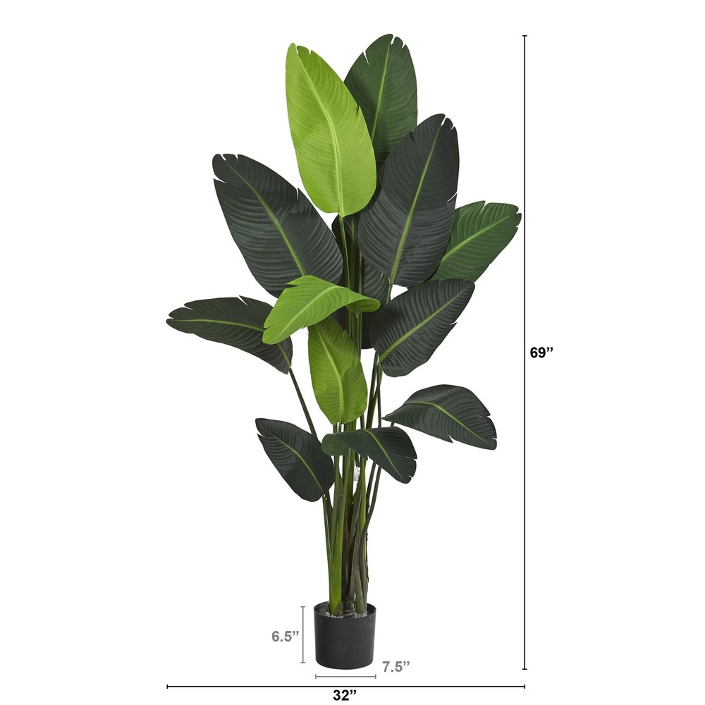 Incorporate year-round freshness throughout everyday interiors without the need for maintenance with the help of this artificial tree boasting a stunning array of realistic looking travelers palm foliage in bright vivid hues. Standing 69" high from an accompanying nursery planter, this tropical-inspired fake tree can handsomely breathe life into tight spaces throughout your home or office. Free Shipping Over $49.99* Details 69" Traveler's Palm Artificial tree Product Description: Incorporate year-round freshness throughout everyday interiors without the need for maintenance with the help of this artificial tree boasting a stunning array of realistic looking travelers palm foliage in bright vivid hues. Standing 69" high from an accompanying nursery planter, this tropical-inspired fake tree can handsomely breathe life into tight spaces throughout your home or office.