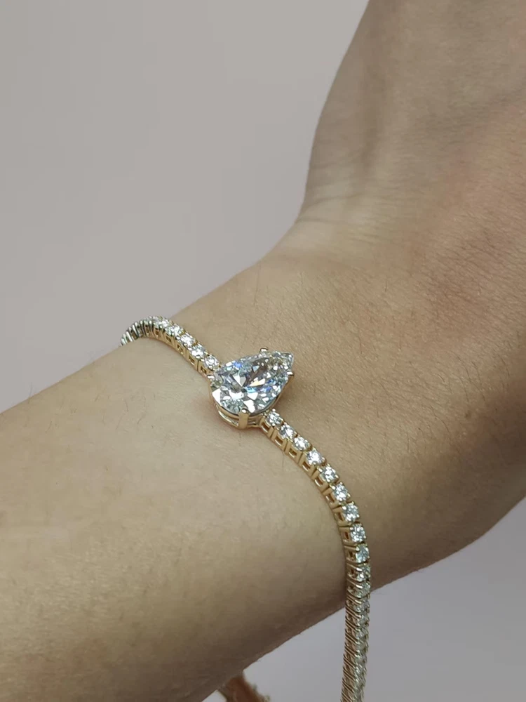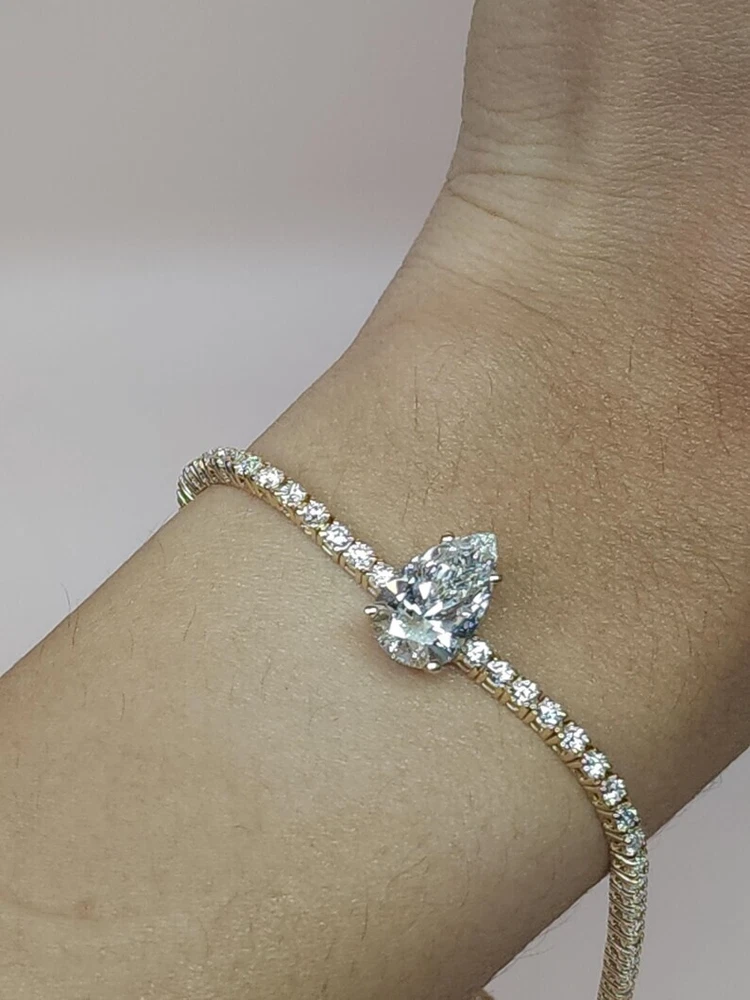 This 6Ct Pear Cut Simulated Diamond 925 Yellow Sterling Silver Women's Tennis Bracelet is a stunning piece of jewelry suitable for various occasions like engagements, weddings, birthdays, and more. The bracelet features a pear-cut simulated diamond in a yellow sterling silver setting with a secure snap closure. It is handmade and adjustable, with a length of 7.5 inches and a charming design that can be personalized as per the buyer's requirements. The tennis link style and eye-clean gemstone clarity grade make this bracelet a beautiful and elegant accessory for any outfit.