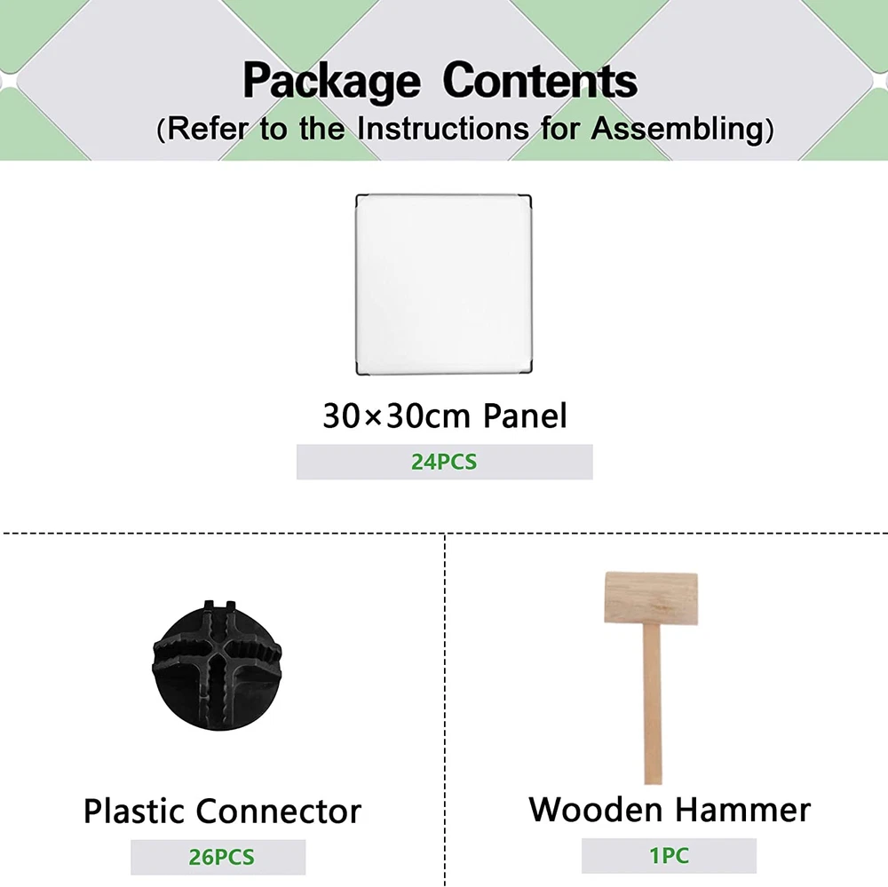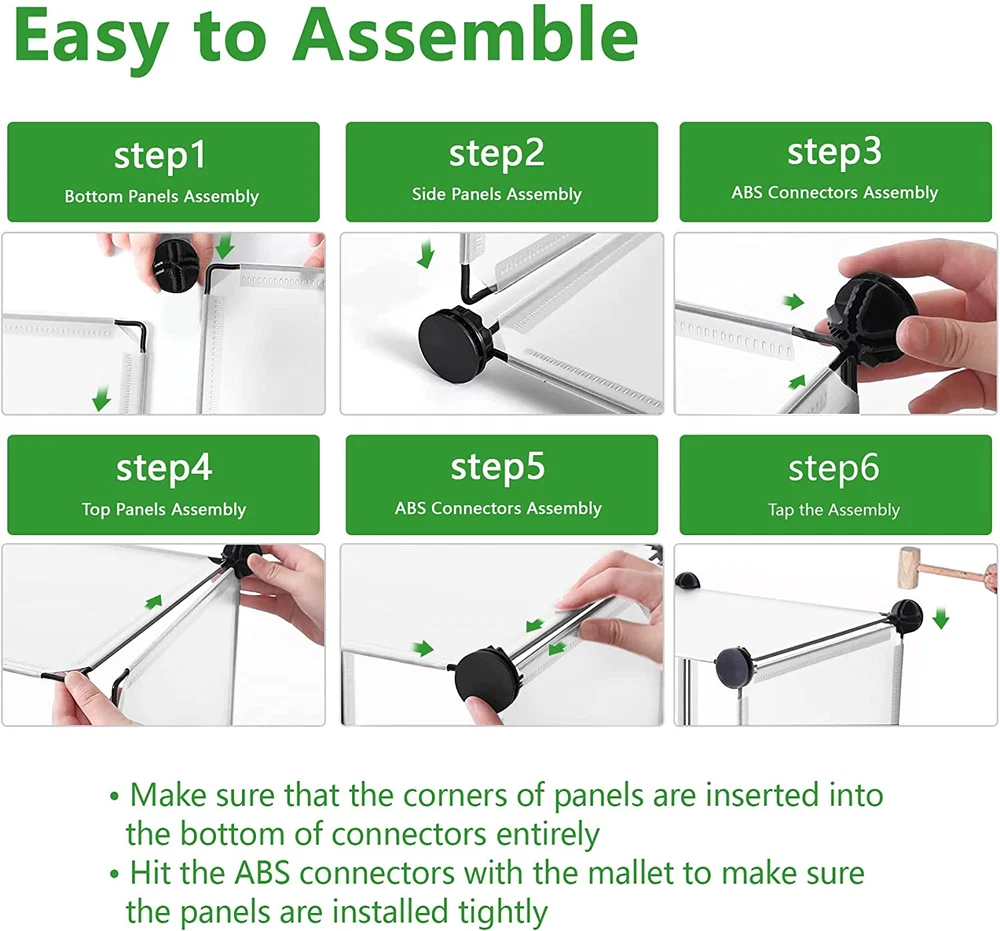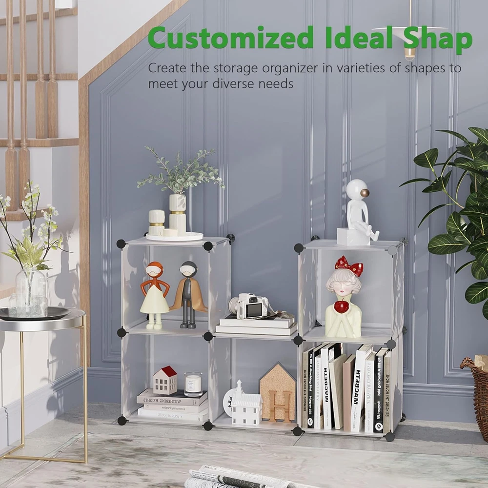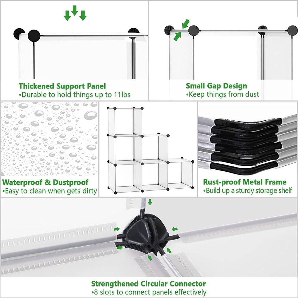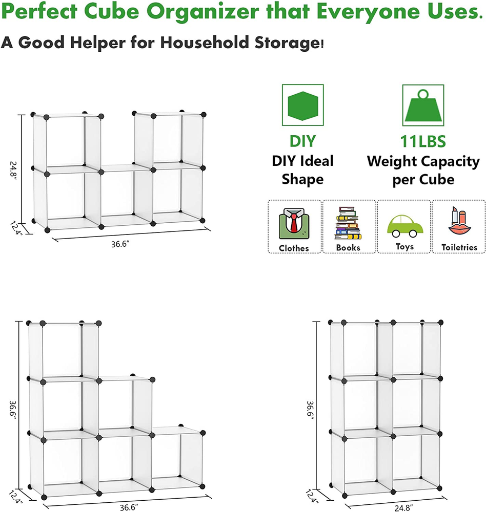 VERSATILE DISPLAY SHELF: This versatile display shelf can store all sort of items what you want: such as books, clothes, toys, decorations and more. A multi-functional storage shelf to display your daily essentials HIGH QUALITY MATERIAL: This cube shelf is made up of high quality PP panels, sturdy metal frame and ABS plastic connectors. Stable structure ensures that each cube can withstand a maximum weight of 11 lbs LARGER STORAGE SPACE: Each cube size is 11.8"L X 11.8"W X 11.8"H, the overall product size is 36.6”L x 12.4" W x 36.6" H. Please note: it fits storage bins that is smaller than 11" x 11". Large capacity to meet your different storage needs EASY TO ASSEMBLE: Simple modular structure makes it easy to assemble and disassemble. With the help of the instructional manual and wooden mallet, you can easily assemble the whole product CREATIVE & CUSTOMIZABLE: You can design different configuration according to your scene and usage. On the basis of the number of accessories we provide, you can assemble it in any way you want Product Description C&AHOME AIMS C&AHOME is committed to the development of home products. This storage cube combines modern design concepts and aesthetics, simple and elegant, stylish and beautiful is ideal for living room, bedroom, home, study, office, etc . ENJOY YOUR LIFE 6-Cube Storage Organizer Transparent White By displaying some books, photos, toys, bags, potted plants in your bedroom or living room, this amazing cube organizer will make your house romantic and fashionable. It will create a peaceful corner for you in a quiet afternoon. Well-organized home makes you being at home more enjoyable. The modern fashionable plastic cube organizer by displaying multiple items, such as books, photos, toys, bags, potted plants, CDs make your house organized and neat. Modern style meet your various needs Elegant, neat and pleasant Life is more convenient More Details Only for the Pursuit of Close to Perfection High Quality Material This storage organizer features premium plastic connectors , rust proof metal frame and thick plastic panels for long-term use. More Stable The panels should be inserted into the very bottom of the connectors so that the gap between adjacent panels is smallest , make the display rack assembled more beautiful and stable . Waterproof & Dustproof The high quality PP material has the function of waterproof and easy to clean , which is easy for your daily cleaning. Wooden Mallet Wooden mallet makes installation no longer difficult. Applicable to More Scenes Only for the Pursuit of Your Satisfaction In the Study Room A Bookshelf in your study room In the Living Room A Display Shelf in your living room In the Bedroom A Clothes Organizer in your bedroom In the Bathroom A Collection Shelf in your bathroom Specification: Color: Translucent White Material: PP Plastic Panel, Rust-proof Metal Frame and ABS connectors Each Cube Size: 11.8” x 11.8” Overall Product Size: 36.6”L x 12.4”W x 36.6”H Each cube Max hold up to: 11 lbs Package Contents: Translucent White Panels: 24 pcs Black ABS Connectors: 26 pcs Wooden Mallet: 1 pc Instruction Manual: 1 pc C&AHOME Notes: Our accessory content can simultaneously satisfy a combination of these 3 variations, DIY according to your preference. Our products are made of PP materials. If it's odorous after opening the box, it will be dissipated for 1-2 days, you can use it without any worry. 1. Don't allow children to climb or play on the product to avoid body injury caused by tilting. 2. To ensure a longer lifespan of this product, please avoid abrupt forces or placing sharp items inside. 3. Protect the product from exposure to direct sunlight or rain. 4. Keep it away from heat sources.