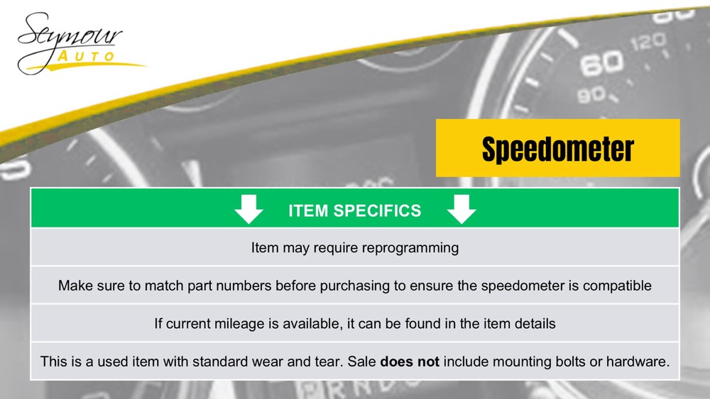Hollander Welcome to our eBay store! Speedometer MPH Cluster 6 Cylinder Green Illumination Fits 04-06 SOLARA 1121616 Description Donor Vehicle Model : SOLARA Year : 2004 Mileage : 182000 (0 = not available or unknown) Stock Number : 027645 Notes : This Part Will Fit These Makes And Models With These Options SOLARA 04-06 MPH (cluster), 6 cylinder, green illumination About Us Payment Shipping Returns Warranty About Us We are a locally owned business with over 70 years of experience in the automotive industry with an extensive collection of used car parts and accessories for thousands of different vehicles. Our knowledgeable and caring staff work hard every day making sure all of our parts are high quality and functional to fit your needs. We are happy to verify fitment for you prior to purchase via your vehicle’s VIN (Vehicle Identification Number). Please contact us with any questions prior to purchasing. Orders are sent to the shipping department throughout the day therefore we cannot guarantee adjustments to orders after payment is received. Payment Payment details: Please contact us with any questions prior to purchasing. Orders are sent to the shipping department throughout the day therefore we cannot guarantee adjustments to orders after payment is received. All orders must be paid in full prior to shipment. Payments are processed through eBay by eBay. If payment is not received within a reasonable time from when the order is placed, it will be cancelled without notice. All purchase prices are final. No price match or discount can be made while an item is awaiting payment. Shipping Shipping Details: Items are shipped after being paid in full. We only ship to US addresses within the continental 48 states. Shipping to AK, HI and PO Box's require a special rate and are subject to additonal charges. All parts listed with Free Shipping have a one day handling time and may not be picked up by the carrier the same day the part is ordered. Any estimated delivery dates provided are only estimates and are not guaranteed to be accurate. We are not responsible for any delays with UPS, Fed-Ex or USPS. We must be contacted same day if an item is received damaged. All address changes must be completed before the part is shipped. Address changes that take place after the part has been shipped are subject to an address change fee. Overnight and expedited shipping options are available for an additional cost. All parts listed as, Pick Up Only , can be shipped if the shipping cost is covered by the buyer. All parts listed as, Pick Up Only , will be held at Seymour Auto Wrecking (107 New Haven Rd, Seymour CT 06483) for the buyer. International orders are shipped via eBay’s Global Shipping Program. We are not responsible for any shipping charge associated with eBay's Global Shipping Program. We are unable to change the delivery address on all orders shipped through eBay's Global Shipping Program. eBay must be contacted directly. We are not responsible for any delays or issues reagrding any item purchased and shipped through eBay's Global Shipping Program. Returns All parts sold have a standard 30-Day return window. Return Details: We must be contacted within 30 days of the carrier provided delivery date for the return to be accepted. No return wil be accepted if contacted after 30 days from the carrier provided delivery date. We may require more information reagrding a return request. ex: pictures, receipts, videos, etc. A free return label will not be provided for remorse return reasons. ex: changed mind, ordered by mistake/by accident, didn't like it The buyer must ship the return within 21 days of receiving a return label or starting a return. All returns must be sent in the appropriote sized box with adequate packaging. Any return received damaged may be eligible for a refund deduction. All returns made must be occompanied with a return reason. All returns that are received without a reason will not be processed. If a return label is issued by eBay, we are not responsible for reimbursing the buyer for the cost of the label. In the event the part returned does not match the original part sent, a case will be opened up with eBay. Warranty All parts come with our standard 6-month warranty. Please contact us for more details prior to ordering. The warranty begins as soon as the buyer takes possession of the part. Standard 6-Month Warranty: If a part is proven to be defective within the 6 month warranty period, a replacement or refund will be sent at our discretion. We are not responsible or liable for any incidental or consequential loss or damage. We will require more information reagrding a warranty request. ex: pictures, receipts, videos, etc. No warranty claims or reimbursement on labor. All body parts are sold as is. Any part that is damaged or altered by the buyer will not be eligible for warranty or return. No warranty claim can be made based on color or trim package. We are not responsible for the buyer's error. ex: Accidental orders, late address changes. We do not offer an extended warranty with eBay. If you experience any issue with your part, please contact us prior to attempting to repair or remove the part. Failure to do so will void the warranty. We make no claim as to the suitability of any part for any particular purpose. The buyer is responsible for determining the suitability of the part purchased for its intended purpose. In the event an incorrect part is shipped, please contact us immediatley so an exchange can be processed. Copyright © 2022, All Rights Reserved. Template Design & Developed By: Copyright © 2022, All rights reserved. Design & Developed By : eFusionWorld