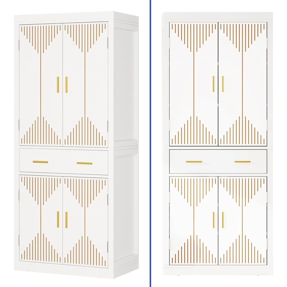 72" Tall Cupboard Storage Cabinet with a Drawer & Adjustable Shelves 4 Doors Freestanding Buffet Food Organizer Carved Design Door for Kitchen, Dining Room, Living Room, White Product Description NOTE: Professional Installation would be Highly Recommended. Description: 1. Color: White 2. Material: Engineered Wood 3. Handle Material: Steel 4. Room Placement Recommendation : Entryway, Kitchen, Living Room, Hallway, Dining Room 5. Special Features : Adjustable Shelf, Anti-tipping, Magnetic Suction, Guide Rail Design, Metal Handle Features: 1. Spacious pantry with lots of storage: This pantry provides generous storage with two large cabinets, one sliding drawer, and six door shelves, offering ample space to organize everything from food supplies to dinnerware and kitchen tools, making it versatile for placement anywhere. 2. Moveable Shelves For Different Sized Things: This modern, freestanding tall kitchen cabinet offers customizable storage with four adjustable shelves. Each of the top and bottom shelves includes dividers that can be set to three different heights, allowing for flexible storage of items in various sizes. 3. Durable Sideboard with Safety Features: This sideboard is constructed from high-quality engineered wood, ensuring durability and stability with a weight capacity of 300 lbs. It features magnetic supports for easy door operation, water-resistant coatings for longevity, and an anti-tip kit for safety, making it a robust and secure storage solution. 4. Multi-purpose Storage Cabinet with Stylish Design: This versatile storage cabinet serves multiple purposes: it can be a pantry in the kitchen, a bookcase in the study, or even a TV stand in the living room. Its unique triangle carvings and modern gold handles add style and functionality, making it a stylish and practical addition to any space 5. Stylish and Practical Pantry Cabinet: This artistic pantry cabinet features a unique inverted triangle carving and modern gold handles, adding style and character to your space. Its design not only enhances the look of your kitchen but also makes cleaning the floor easier. 6. Easy to Assemble: The cabinet is easy to assemble with clear, step-by-step instructions and numbered parts. For quicker setup, it is recommended that two people work together to assemble it. Dimensions: 1. Product Dimensions: 30.1"L x 15.7"W x 72.4"H 2. Drawer Dimensions: 25.6"L x 13.8"W x 4.7"H 3. Top Larger Door Dimensions: 13.4"L x 34.3"H 4. Bottom Door Dimensions: 13.4"L x 25.2"H 5. Weight Capacity Each Shelves : 60 lb 6. Weight Capacity: 300lbs Package Included: 1 x Storage Cabinet 1 x Accessory Kit 1 x Instructions Tips 1. Select the appropriate size for your needs prior to purchase. 2. The actual product's color may be a little different compared to website photos. Shipping 1. Normally the item will be dipatched within 1 business day if payment is cleared before 12pm PST. 2. Please verify the correct shipping address in your PayPal account before making the payment. We only dispatch the item to the address that is sent to us at the time of checkout. 3. We don't ship to Hawaii, Alaska, Puerto Rico, APO/FPO/PO Boxes. 4. We don't provide local pick-up service. 5. Normally we will use USPS, UPS, FedEx & LTL to dispatch items. Payment 1. We accept PayPal and credit card. 2. We will ship to the confirmed Paypal shipping address that is provided with the payment only. Return 1. 30 days Money Back Guarantee. 2. Please contact our customer service to receive a RMA form first if want to return the item. 3. All returned items MUST in new condition with the original package. Contact If has any problem, please contact us by sending an ebay message. Our customer service will resolve the problem as soon as possible. On Aug 7, 2024 at 01:12:17 PDT, seller added the following information: On Mar 10, 2025 at 23:38:03 PDT, seller added the following information:
