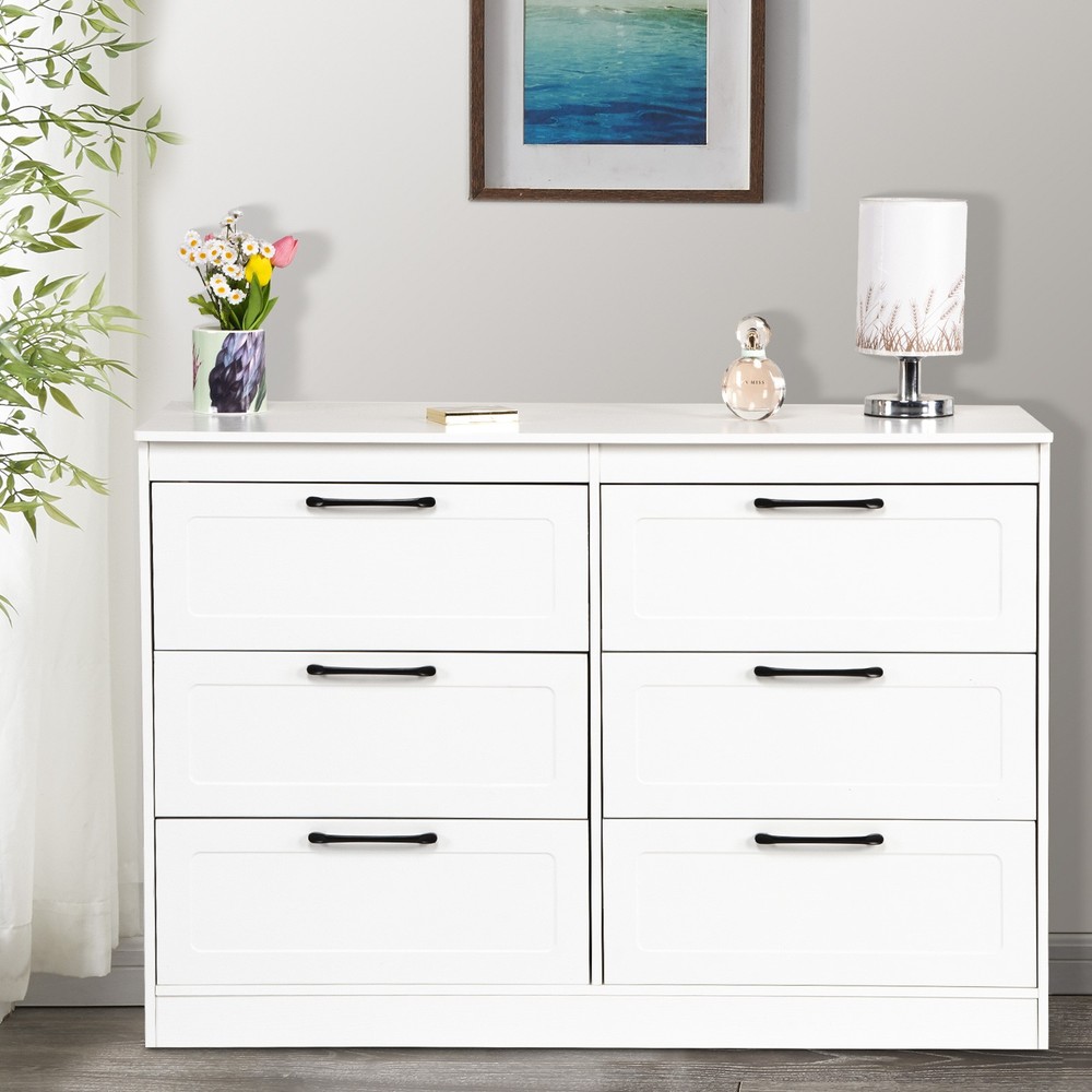 Double Dresser for Bedroom with 6 Drawers Storage Chest of Drawer Organizer US Features: · [Fashionable appearance]: This innovatively designed multifunctional with black handle drawer storage cabinet has an elegant white finish, which perfectly matches your home furnishings. · [6 drawer storage space]: The white drawer's 6 drawers are very suitable for storing daily necessities. The spacious space can store your belongings and keep your home tidy. · [Top storage space]: Put some albums, collectibles and decorations on the top of the white cabinet, which will become a beautiful scenery in your home. · [Smooth slide rails]: The drawers of this bedside table use smooth slide rails, which can easily push in and pull out 6 drawers. · [Smooth surface]: The surface is spray-painted, so that the surface of this dressing table can be easily cleaned without water, and it can be used for a long time by keeping it dry. · [Safety and fall prevention]: The fall prevention device can protect you and your family. The cabinet will be very stable and safe to use. Specification: Color: White Material: Wood Overall size: 47.1 x 14.9 x 31.4 inch Drawer size: 21.7 x 7.8 inch Package Contents: 1 x 6-drawer white storage cabinet 1 x Accessory 1 x Instruction If you have any problem towards the order you received,please feel free to contct us,we promise will serve you and give you a satisfying solution.