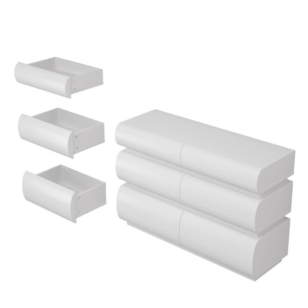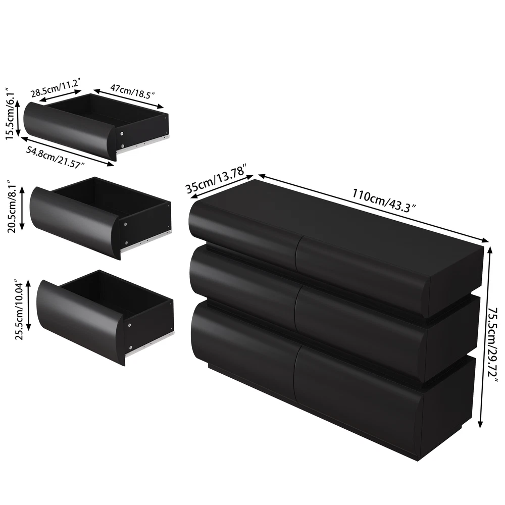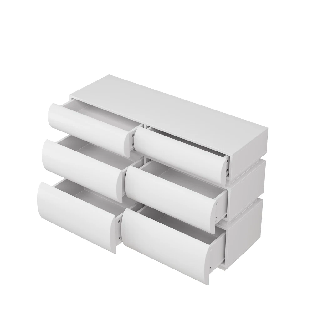 Product Features MINIMALIST MODERN: Showcase a minimalist modern style for your bedroom with thispull-less dresser. The dresser, handle-less slide drawers, crisp vertical and horizontal lines, and graceful curved lines are perfect for your home's theme. MULTIFUNCTIONAL ORGANIZATION: 6 different sized drawers provide ample storage space for both personal essentials and household items. The water-resistant surface can be easily cleaned of dust, making it ideal for use in the bedroom, living room or entryway. THICK AND STRONG: This chest of drawers is mainly composed of density fiberboard material, which is stable and durable. The drawers are connected by metal slides to form a stable structure that perfectly meets the storage needs of large and heavy items. There is also an anti-tipover device on the back panel to prevent tipping over, adding more safety to your home. REASONABLE WEIGHT-BEARING CAPACITY:In order to meet a variety of requirements in your daily life, the load-bearing capacity setting of this dressing table is reasonable and practical. The load-bearing capacity of the tabletop is 265 lbs. In that case, you can put most of daily sundries on the tabletop without worried about the load-bearing issues. The six drawers have the same load-bearing capacity, that is 22 lbs/per. EASY TO ASSEMBLE: The dresser comes packaged with all the necessary hardware, tools and clear instructions for easy assembly.