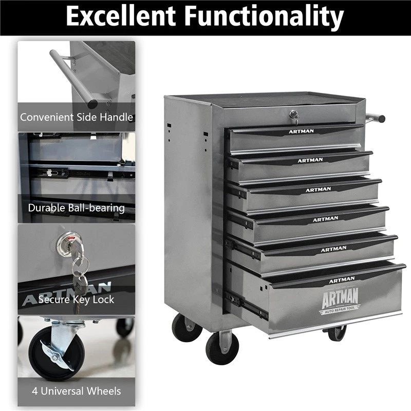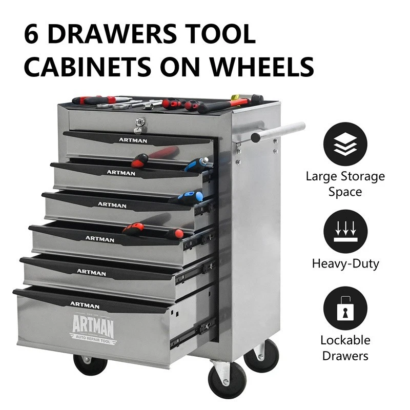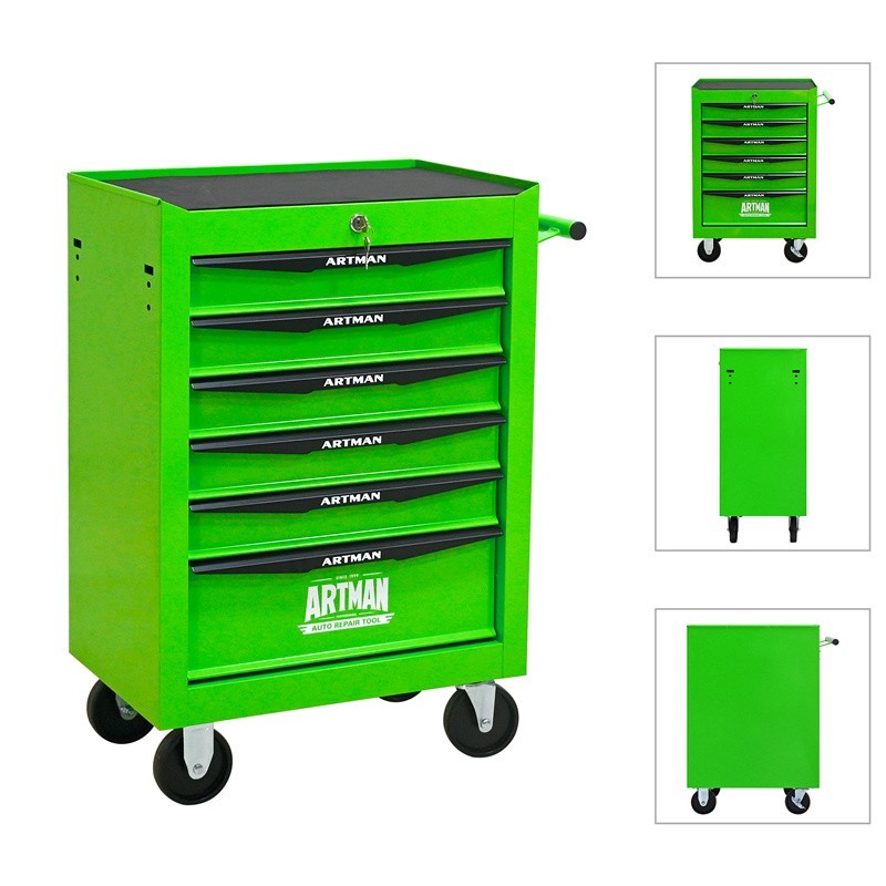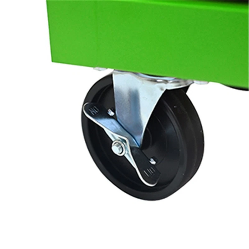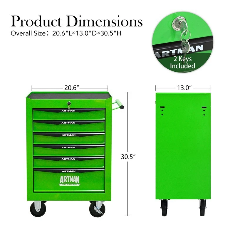 Features and Details: 6 drawers with wheels multi-purpose tool car, black and blue color with more durable The tool box is also lockable and can be used as a removable, attachable and mobile case The opening and closing of the drawers of the tool cabinet is very gentle thanks to the ball-bearing drawers The robust and powder-coated steel construction is used for high wear resistance. This assembly trolley has 4 steering wheels, 2 of which with parking brakes, so you can move the trolley freely in the garage, but also stop in one place Smooth steel countertops are cleaner and more durable. Specification: Color: Green / Silver Metrail:Cold Rolled Steel Surface Finish: Powder Coating Casters: 4" Casters (2PCS with brake and 2PCS without brake) Product Size (with wheels):20.63"L×12.99"W×30.59"H Product Dimensions:20.63"L×12.99"W×25.83"H Product Weight (lbs.): 51.59LBS