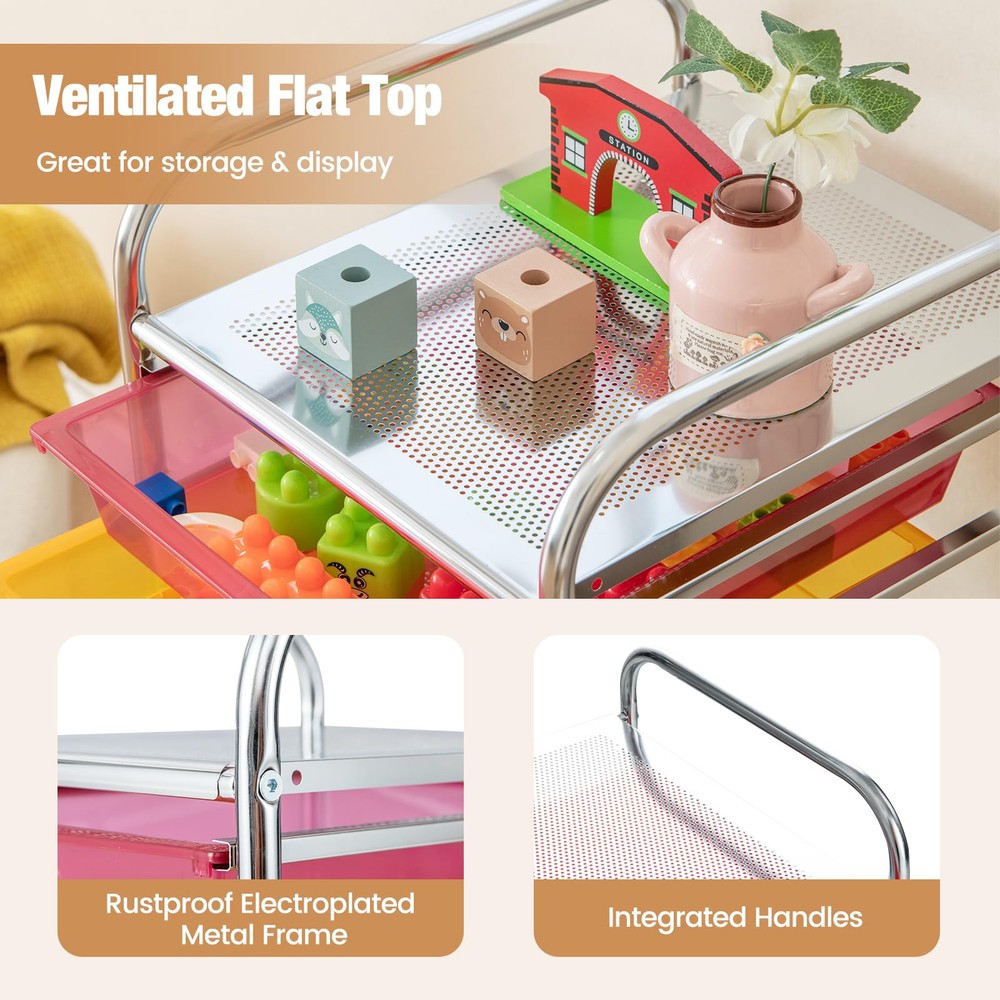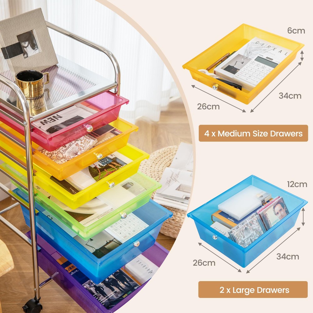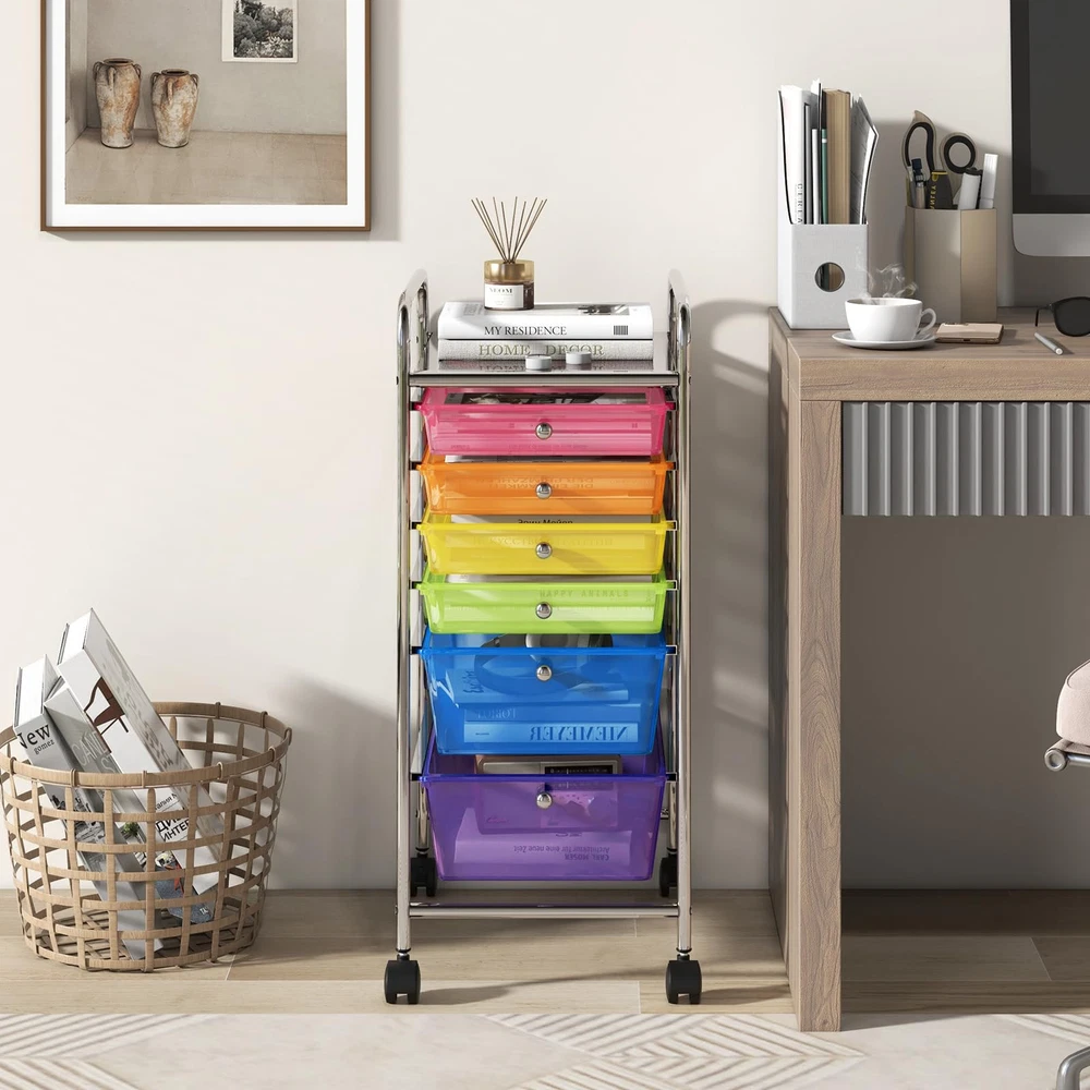 Description: Are your room all in a mess? The compact rolling storage cart is perfect for your office, home, school or kitchen. The utility cart features a chrome steel frame and high-quality plastic drawers for solid construction and durability. 2 large drawers and 4 small drawers provide plenty of storage space for all your daily necessities, and are a perfect addition to your living space. Besides, equipped with 4 universal wheels, the storage cart is easy to move and secure. Come and buy ! Features: 4 removable drawers for storing and sorting items 4 universal wheels for easy movement Steel frame ensures structural stability of the cart Metal knob for easy opening and closing of drawers Colorful drawers are a decorative addition to your space Perfect storage for home, office, kitchen, etc. Easy to assemble and disassemble with detailed instructions Specifications: Material: Steel + PP Drawer Size: 13.5" x 9" x 4.5"/2" (L x W x H) Overall Size: 14.5" x 13" x 29.5" (L x W x H) Package includes: 1 x 6 Drawers Rolling Cart 1 x Instruction 🌈【Large Storage Space with 6 Drawers】: This 6-drawer rolling storage cart includes 2 large drawers and 4 small drawers, providing you with enough space to different categories of things, keeping your office supplies, cosmetics, handicrafts and tools free from dust and your room neat. 🌈【Sturdy Metal Frame & Durable Drawers】: Our storage rolling trolley is made of chrome-plated steel, which is rust-resistant and corrosion-resistant for long service life. And 6 drawers are made of high-quality plastic, ensuring great load capacity and durability. 🌈【4 Flexible Wheels】: Four universal wheels (2 are lockable) can swivel 360 degree and help you move the storage cart anywhere you needed easily. Moreover, the mute wheels won’t make any noise and can also protect your floor from scratches. And handles on the top of the cart are for easy moving. 🌈【Convenient Knob for Easy Access】Each drawer is equipped with a round knob which brings great convenience to hold. Besides, the space between each drawer allows you to easily open the drawer to get what you need. The smooth surface is easy to clean and maintain, bringing convenience to daily use. 🌈【Versatile Rolling Storage Cart】: Weighing only 6 lbs, the storage organizer cart is an ideal choice for your workplace, entryway, bathroom, garage, or home to be more organized. Meanwhile, its compact size won’t take up too much floor space, which makes it suitable for corners. Different colors offer you much convenience to classify your stuff.