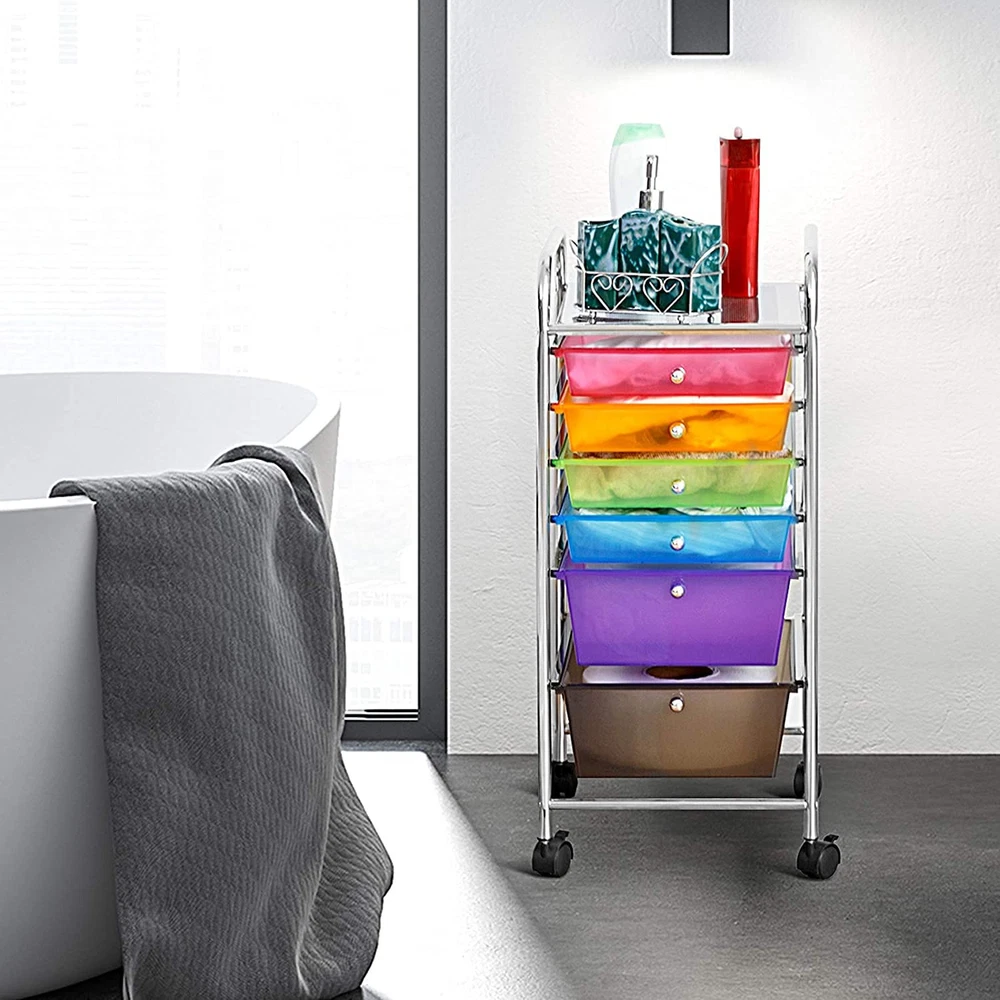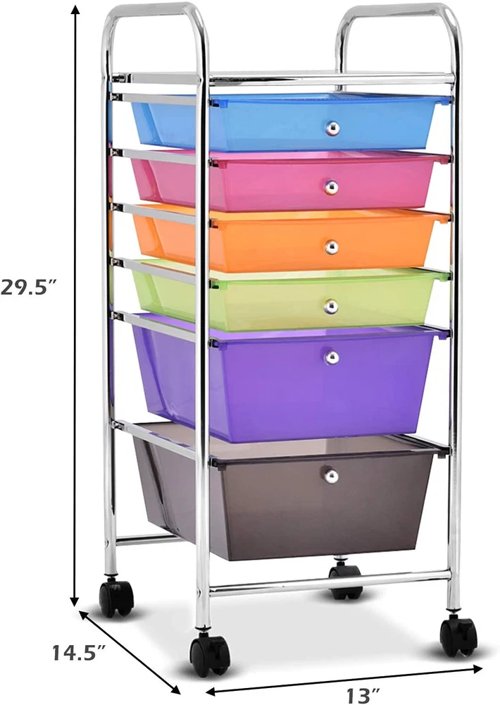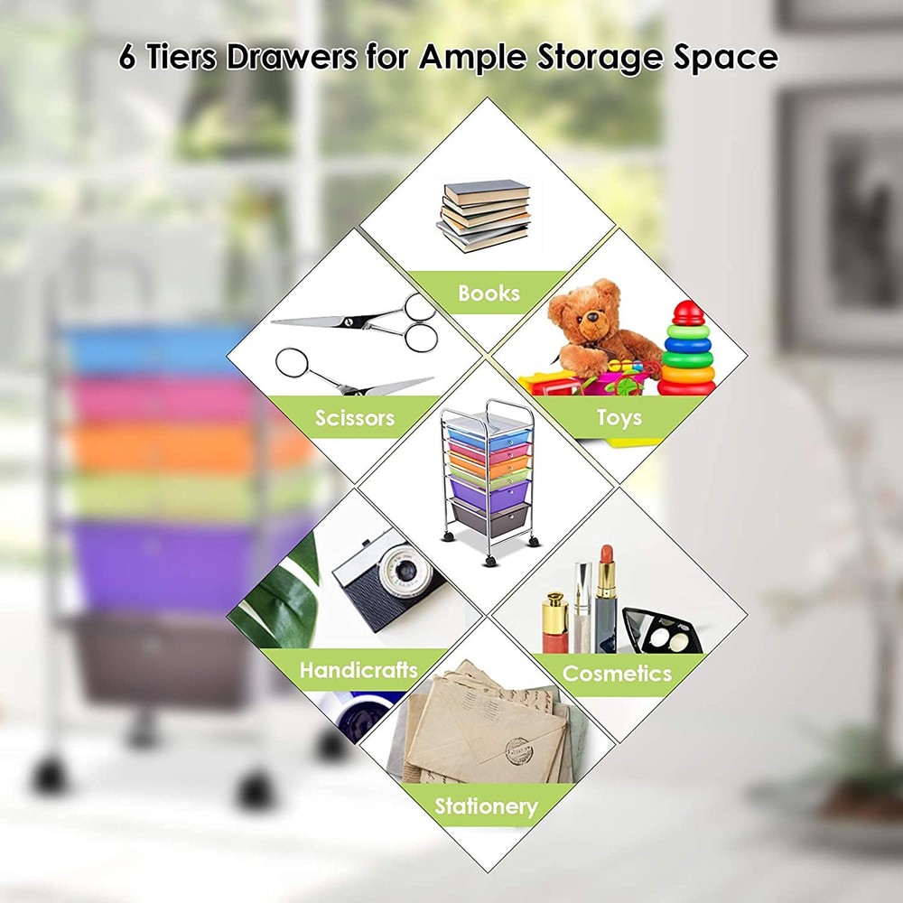 đăSmart 6-Drawer Storage OrganizerăThis storage cart with drawers has 6 drawers, of which are large. It provides plenty of space for keeping your home office supplies tidy and close, organizing makeup and cosmetics, storing arts and crafts supplies, and arranging tools for use in the garage. đăMobile Storage Solutionă Our storage trolley with drawers equipped with 4 castors that you can easily move where you want. Since it is equipped with foot brakes, this rolling cart ensures its stability if you want it stay at some certain place. đăSturdy Construction with Steel FrameăOur craft storage organizer cart with drawers features a heavy-duty iron frame, which gives it a superior stable construction to withstand a high weight capacity. Reinforced electroplated finish has a higher resistance of corrosion and rust without deformation for longer use. đăUser-friendly DesignsăRemovable drawers ensure a better user experience. The drawer slide rail is well fixed on the metal channel to make the movement more stable. With convenient handles on each drawer, you can easily pick and place things when you need them. đăVersatile CartăThis is an ideal storage solution to make your workplace or home more organized and tidy, because this storage trolley can perfectly place its practical role in various occasions, such as office, home, living room, entrance passage, bathroom, Schools, garages, etc.