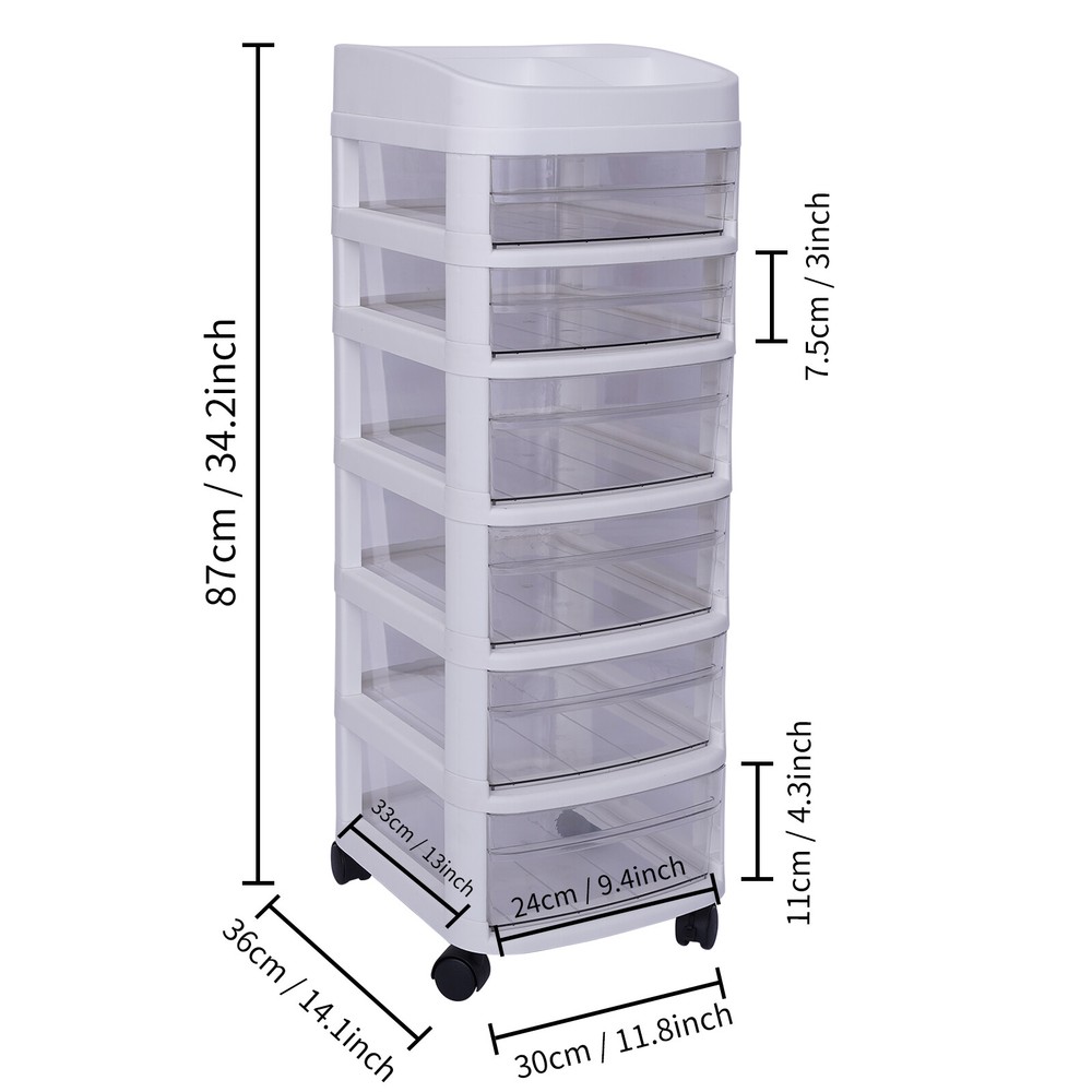 This rolling cart is a game-changer for organization! The six spacious drawers hold all my makeup, skincare, and even art supplies neatly. The smooth-gliding wheels make it easy to move around, and the sturdy white plastic fits perfectly in my bathroom. Love how the deeper bottom drawers store bulkier items while the top ones keep smaller essentials within reach. Super versatile for any room—highly recommend!