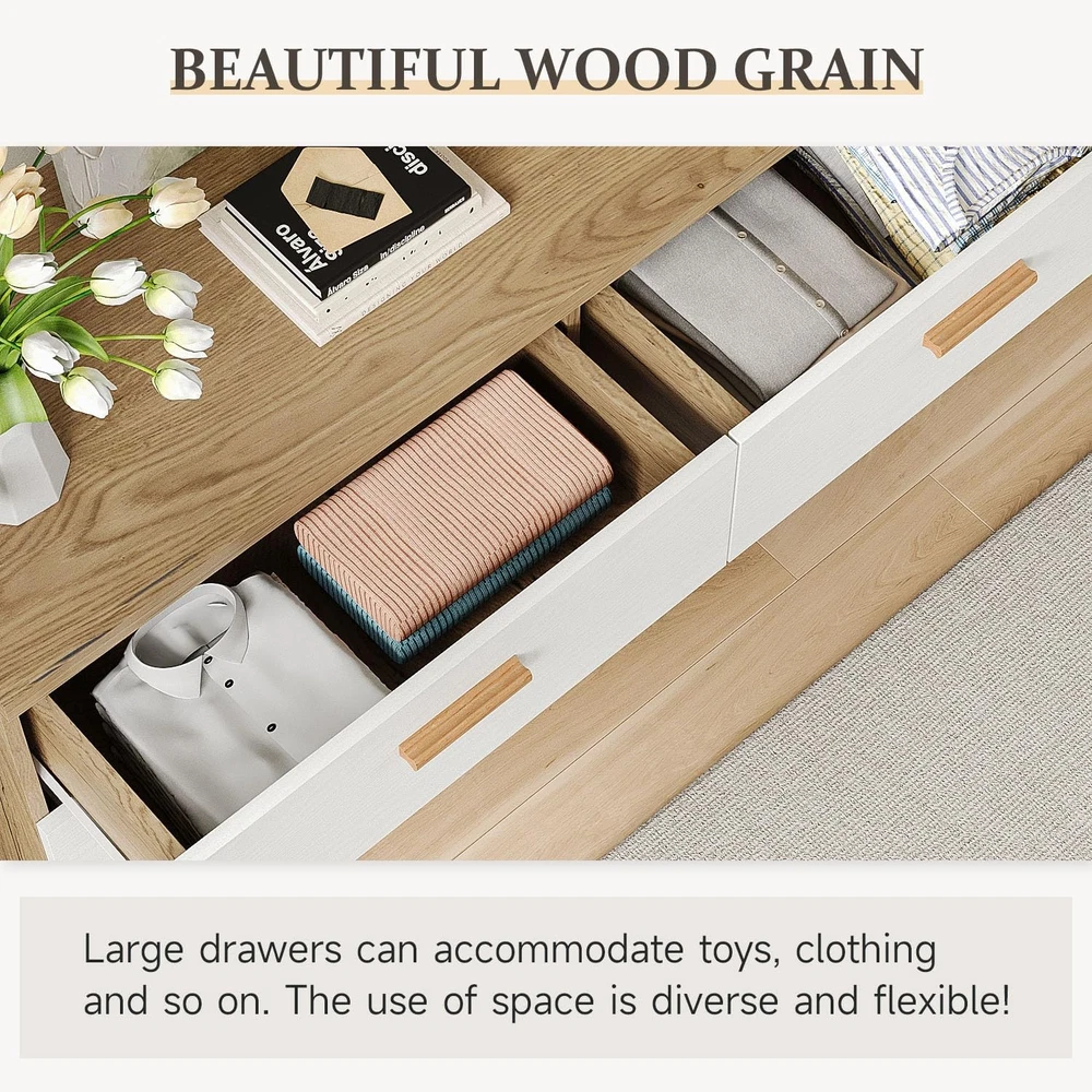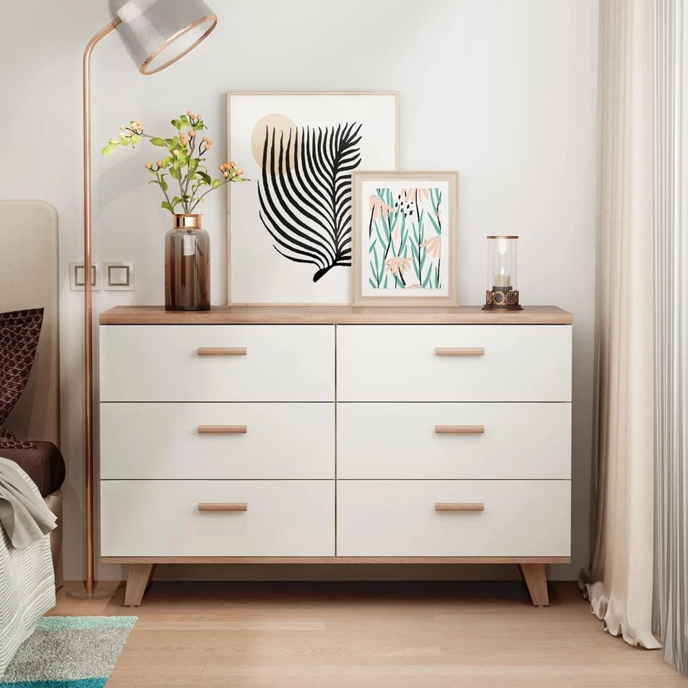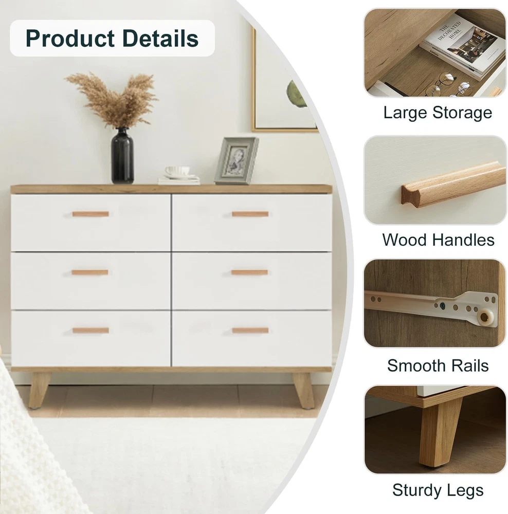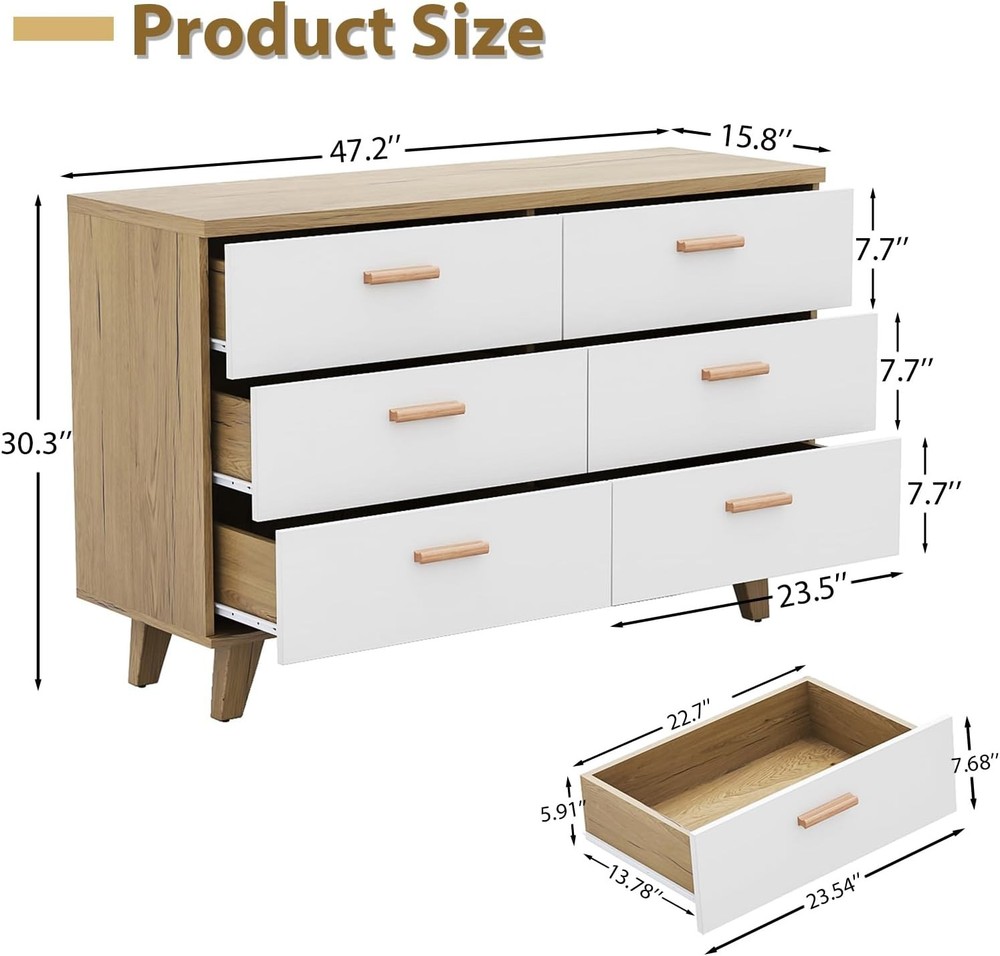 Product Description About this item 【Modern White Dresser】The 6-drawer modern dresser for the bedroom features a modern design accented with beech solid wood handles. The clean lines and elegant white color will blend with any bedroom décor or furniture. Smooth guides allow drawers to be pulled out and closed quietly and easily. 【Large Storage Space】 The height of the drawer is 5.91". Large drawer box design can accommodate toys, clothing, magazines, red wine, bowl spoon and so on. All can be accommodated, the use of space is diverse and flexible! 【Stable & Durable】The white dresser is made of E1-grade particle board and solid wood, which is thicker than similar products. And it's waterproof and scratch-resistant, easy to clean. Solid wood thickened feet provide more stable support, a stable and sturdy structure to accompany you for many years. 【Multi Use】This wide chest of dressers can be used in closets, bedrooms, nurseries, playrooms, entryways, churches, and offices. Very beautiful and generous, match your other furniture attractively, ideal for home furniture. 【Details of the Dresser】2 Packages in total. The top panel of the drawer cabinet used environmental protection particle board 25mm(9.8") thick, which is 10mm(4")thicker than that of similar products. This product is strong, and the bearing capacity is up to 220 pounds. White 6-Drawer Dresser for Bedroom White Dresser for Bedroom The white dresser features solid wood, wood grain with warm white matched, sophisticated and very elegant. The top panel of the drawer cabinet used high-quality particle board, which not only adds durability but is also resistant to water & scratches. It can be used in closets, bedrooms, nurseries, playrooms, entryways, churches, and offices. The bearing capacity is up to 220 pounds. 6-Drawer Nursery Bedroom Dresser Modern Design Wide Wood Table Top 6 Large Drawers for Storage Sturdy Legs Bedroom, Nursery Room, Kids Room, Living Room, Entryway Product Details Color: White+Wood Material: MDF+Solid Wood Weight Capacity: 220lbs Assembly Required: Yes Specification Product Dimension:47.2"L x 15.7"W x 30.3"H Package Size:52.36"L x20.87"W x8.46"H Package Weight:111.33lbs Number of Packages: 1 On Aug 6, 2025 at 23:21:55 PDT, seller added the following information: