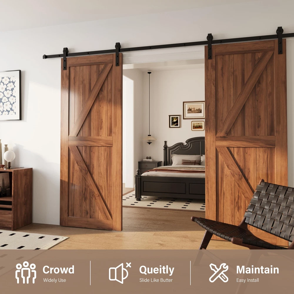 Sturdy and durty barn door hardware: The side-mounted sliding barn door kit is made of high-quality carbon steel, that can ensure durability and studity to support barn door weight up to 277 lbs. The surface of barn door track is adhered to a fine black powder coating by high temperature to ensure that it can be used for a long time. How to choose the Double barn door hardware kit: The sliding door track length should be at least double the door width. And there should be a minimum of 5.1" gap between the barn door and the ceiling.Fit door panel width: 32", door panel thickness: 1 3/8" - 1 3/4". It can be paired with wood barn door, closet door, MDF barn doors, and more.(If you have thicker door, contact us and longer pipe clamp screws can be supplied) Quiet and smooth sliding door hardware: The high-quality carbon steel track kit ensures barn door slide smoothly. J-Shape barn door rollers can provide smoother rolling. With carbon steel anti-hopping block and stopper for stable movement and long useing. Easy to install: The barn door hardware kit package include:(1) 2 X 3FT Tracks (5) Wall Connectors (4) Rollers (4) Door Stoppers (2) Floor Guide (1) Installation manual; All necessary hardware is included. And we can provide installation video to make you easier when install the barn door kit.This sliding door hardware takes up to 2 people to install in 40 minutes. If you have any issues, please let us know, and we will do our best to assist you.(DOOR NOT INCLUDED) Versatile sliding barn door hardware: The black barn door track provides a sleek, modern look that can complement various interior design styles, from rustic to industrial, including residential homes, offices, and commercial spaces. Barn door hardware kit allow doors to slide parallel to the wall, saving valuable floor space compared to traditional swinging doors. This makes them ideal for smaller rooms or areas with limited space.