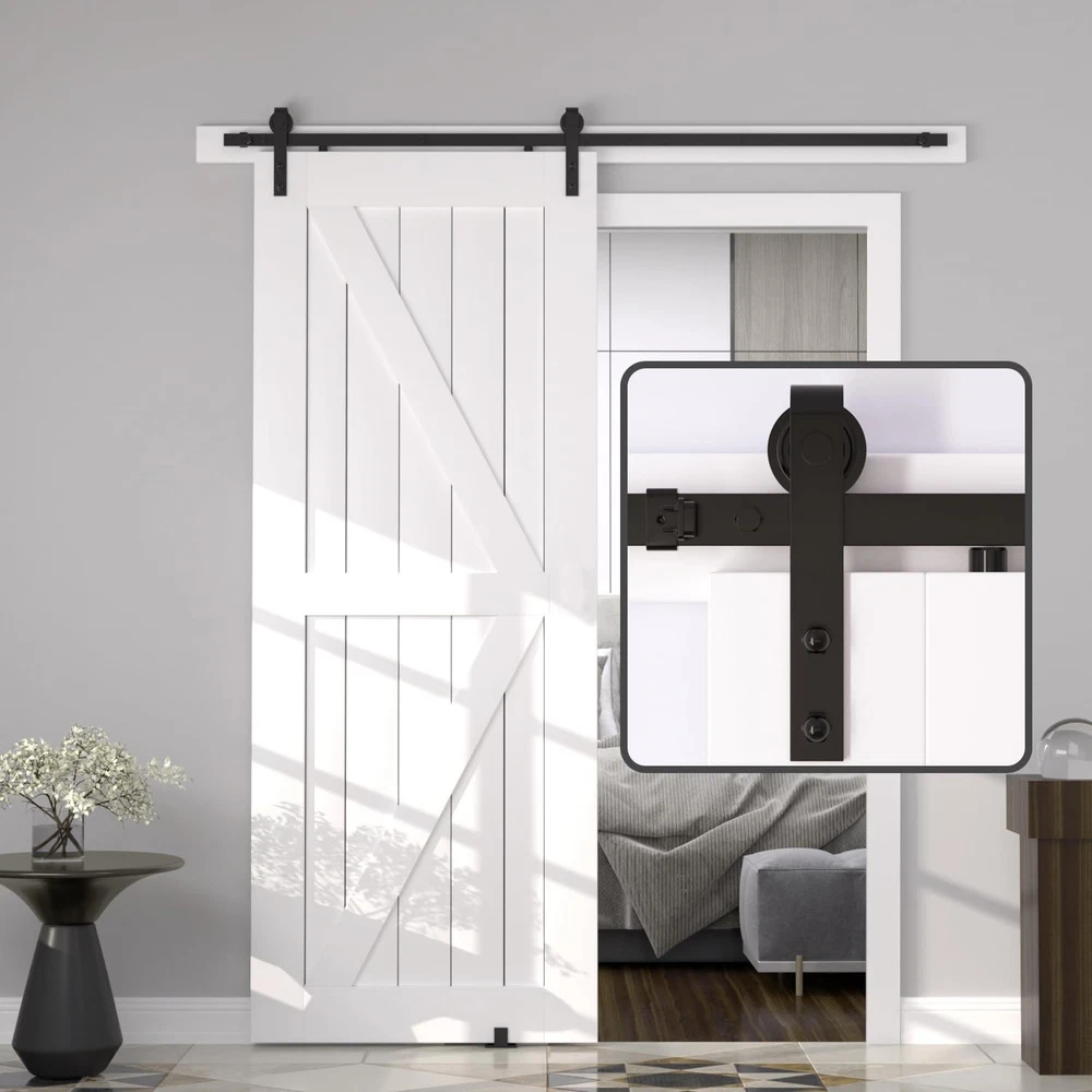 Basic Info: Barn door hardware kit maximum hold barn door for 265 lbs, Fit for door panel thickness from 1.375" to 1.75", Fit for door panel width up to 36"(door not included). Strong and Durable: Barn door track are made of high standard carbon steel with black powder coating, This greatly increases the robustness of the barn door track and makes it water, dust and rust resistant, all attributes that allow the entire barn door hardware kit to maintain long-term stable operation. Smooth and Quiet: Sliding door kit is based on the POM made wheels(2 bearings inside wheel), which allows the barn door system to slide more silky smoothly and quietly and does not easily cause wear and tear on the track. Less Space Ocuupy: Compared with normal sliding doors, barn doors and hardware included are more space-saving, the space behind your door is not bound, you can easily stack items behind the door, it is your space becomes more neat, this is the biggest reason why we choose barn door system. What Included: 5* barn door track(combine to 6ft), 2* barn door rollers, 2* door stoppers, 2* anti-jump pads, 1* floor guide, 1* maunal. Incase you get any confusion on installation or missing parts ,kindly contact us via amazon ,we may get back to you in 24 hours. "ONLY BARN DOOR HARDWARE KIT FOR SALE, BARN DOORS ARE NOT FOR SALE."