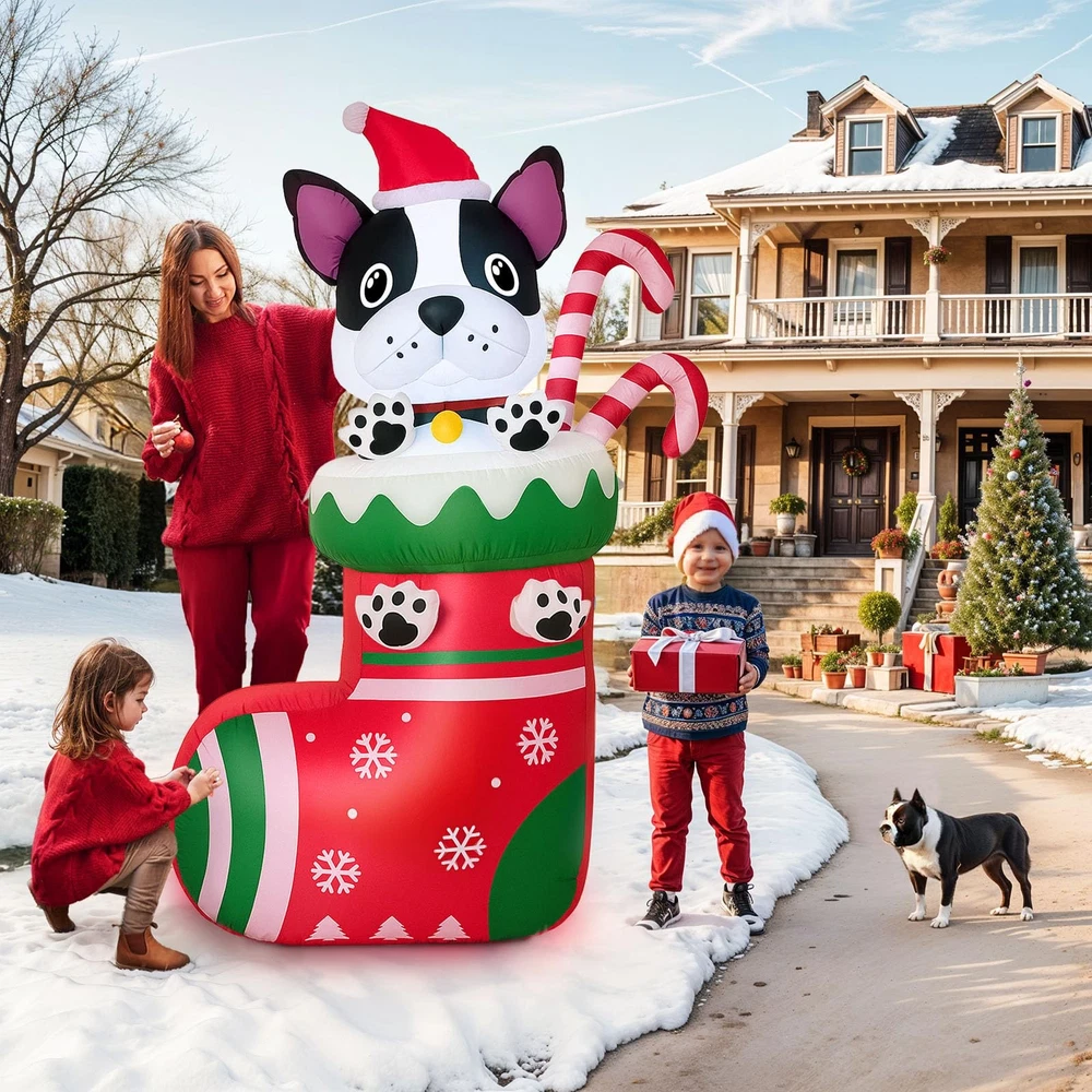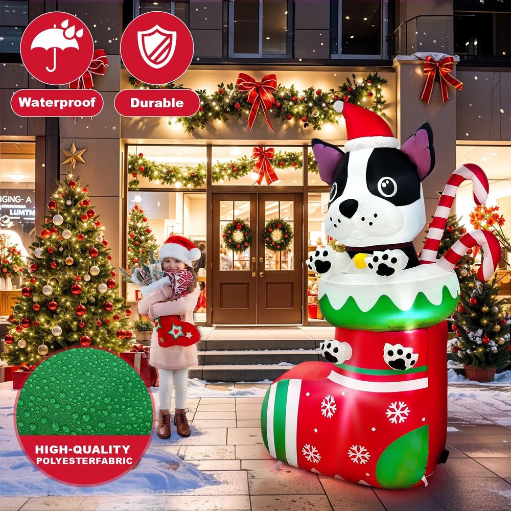 AerWo 6 FT Christmas Inflatable Outdoor Decoration, Christmas Inflatables Dog in Stocking, Christmas Blow Up Yard Decorations with LED Lights, Christmas Decorations for Indoor Outdoor Party Decor Adorable Dog in Stocking Design: The 6-foot inflatable Christmas decorations feature a cute puppy wearing a Santa hat, sitting happily inside a festive Christmas stocking. The charming design is sure to capture the hearts of your family, guests, and passers-by, making this Christmas blow ups dog a delightful addition to your outdoor Christmas decorations Weather-Resistant Materials: Made from durable 210T polyester, this outdoor Christmas inflatable is designed to withstand outdoor elements. It is waterproof, tear-resistant, and built to last, ensuring that your Christmas outdoor inflatable dog remains vibrant and intact throughout the holiday season, even in unpredictable weather. Make your Christmas decorations outdoor last year after year Quick and Easy Setup: Equipped with a built-in 0.8A blower, the Christmas inflatable outdoor decoration inflates quickly and effortlessly in just a few minutes. The 1A UL-approved plug and 78.7-inch power cord eliminate the need for extension cords, providing you with a convenient setup that’s hassle-free and stress-free. You can easily place the Christmas blow ups for outside anywhere you want Stable and Secure Outdoor Christmas Decor: To ensure your Christmas blowups dog stays securely in place, the package includes 6 ground stakes, 2 sandbags, and 2 x 59-inch fastened ropes. These accessories provide stability for funny Christmas inflatables even in windy conditions, so you can enjoy your Christmas outdoor decorations throughout the season without worrying about it blowing away Eye-catching Christmas Party Decorations: The outdoor inflatable Christmas decorations are equipped with 4 energy-saving internal lights that brighten up the dog Christmas inflatable and create a warm, festive glow. Our Christmas inflatables are suitable for outdoor use, in the courtyard, garden, or at home, for gatherings, art decorations, Christmas events, and Christmas Eve activities, etc