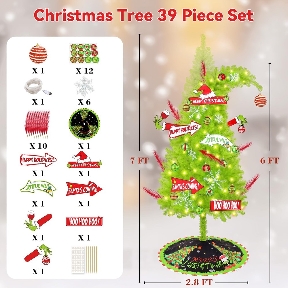 6FT Grinch Christmas Tree with Flexible Branches Green Monster Xmas Decoration 【Xmas Tree with 38 Accessories】What can you get? A 6 feet tall lime green Christmas tree with 38 accessories, including a tree skirt, snowflakes, hanging balls, etc., to decorate your Christmas tree with a surprising Greench theme 【Whimsica Christmas Tree】This artificial Christmas tree not only has a flexible top that can be bent or straightened with just a gentle twist, but also has 798 dense branches and leaves that are bright green. After the decoration is completed, it will present a particularly plump and pleasing appearance. 【High Quality】This Christmas tree is made of high-quality PVC material, which has excellent fire resistance and can effectively enhance the safety during use. Among them, the trunk is sturdy and durable, while the base is stable and reliable, effectively ensuring the long-term use of the overall structure. 【Multi-scenario application】A lemon green medium to large Christmas tree with a height of about 6-7 ft, which can be placed flexibly in bedrooms, living rooms, and courtyards. It is also suitable for holiday gatherings or gatherings with friends, making your life full of festive joy. 【Easy to install】A foldable base, three bolts, and three sections of tree trunk. You only need to install the three sections of tree trunk from the base upwards and tighten the bolts on the base. Then tidy the tree up as fluffy and beautiful as possible. This may take some time, but when you tidy it up perfectly, you will be amazed by the beauty of the tree 【Kind Reminder】The 7 Christmas cards in the accessories, including 5 with holes, need to be tied with hemp ropes and hung on trees. For the other two cards, we have prepared bamboo sticks and nano glue. We need to use nano glue to stick the bamboo sticks to the cards and then insert them into the tree. 6 Ft Lime Green Christmas Tree, Whimsical Xmas Tree with 38 Accessories, Unique Christmas Tree for Indoor Office Home Christmas Decorations Shipping We offer FREE shipping on all orders! We ship within Three business days of payment, usually sooner. We use a selection of shipping services such as UPS, FedEx, USPS etc. We only ship to the lower 48 states, no APO/FPO addresses or PO Boxes allowed. Local pickups and combined shipping options are not provided at this time. Return You can return a product for up to 30 days from the date you purchased it. Any product you return must be in the same condition you received it and in the original packaging. Please keep the receipt. Payment We accept payment by any of the following methods: PayPal Please pay as soon as possible after winning an auction, as that will allow us to post your item to you sooner! Feedback Customer satisfaction is very important to us. If you have any problem with your order, please contact us and we will do our best to make you satisfied. Contact Us If you have any queries, please contact us via ebay. We usually respond within 24 hours on weekdays. Please visit our eBay store to check out other items for sale! Thank you for shopping at our store.