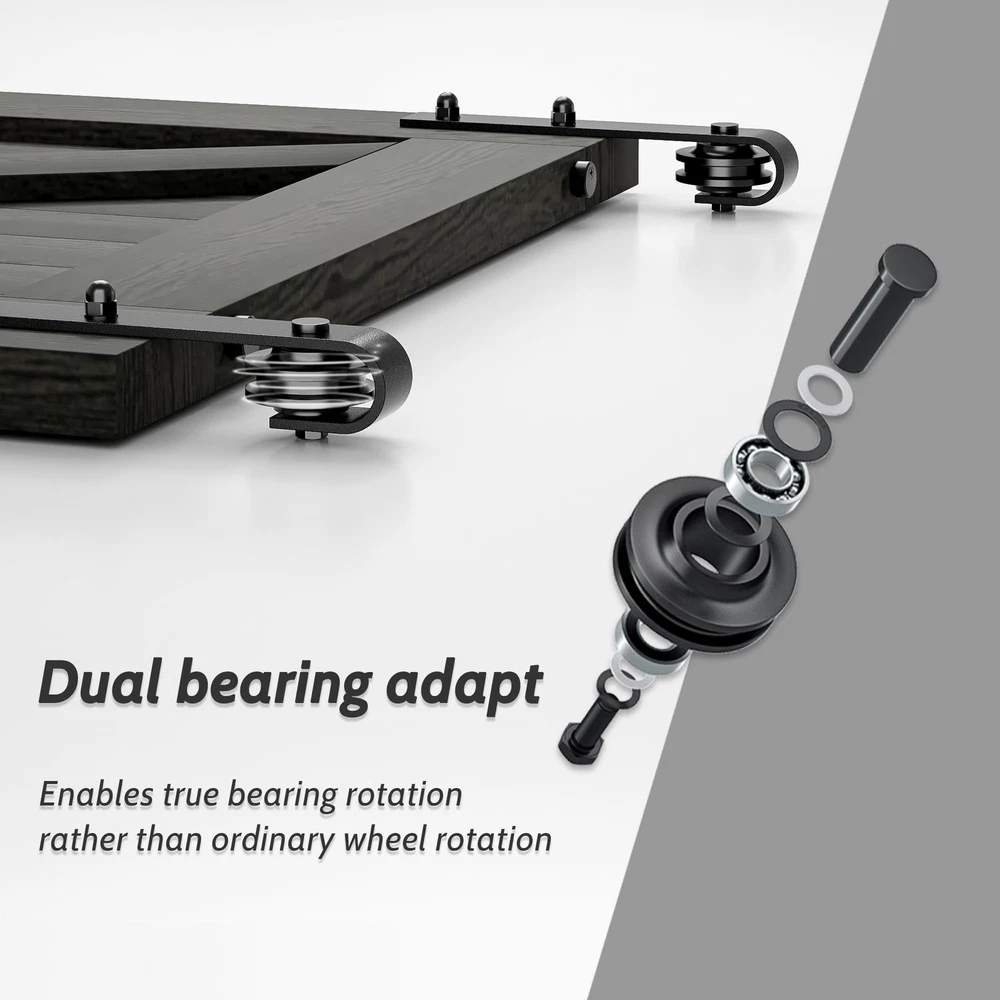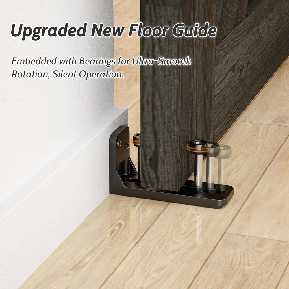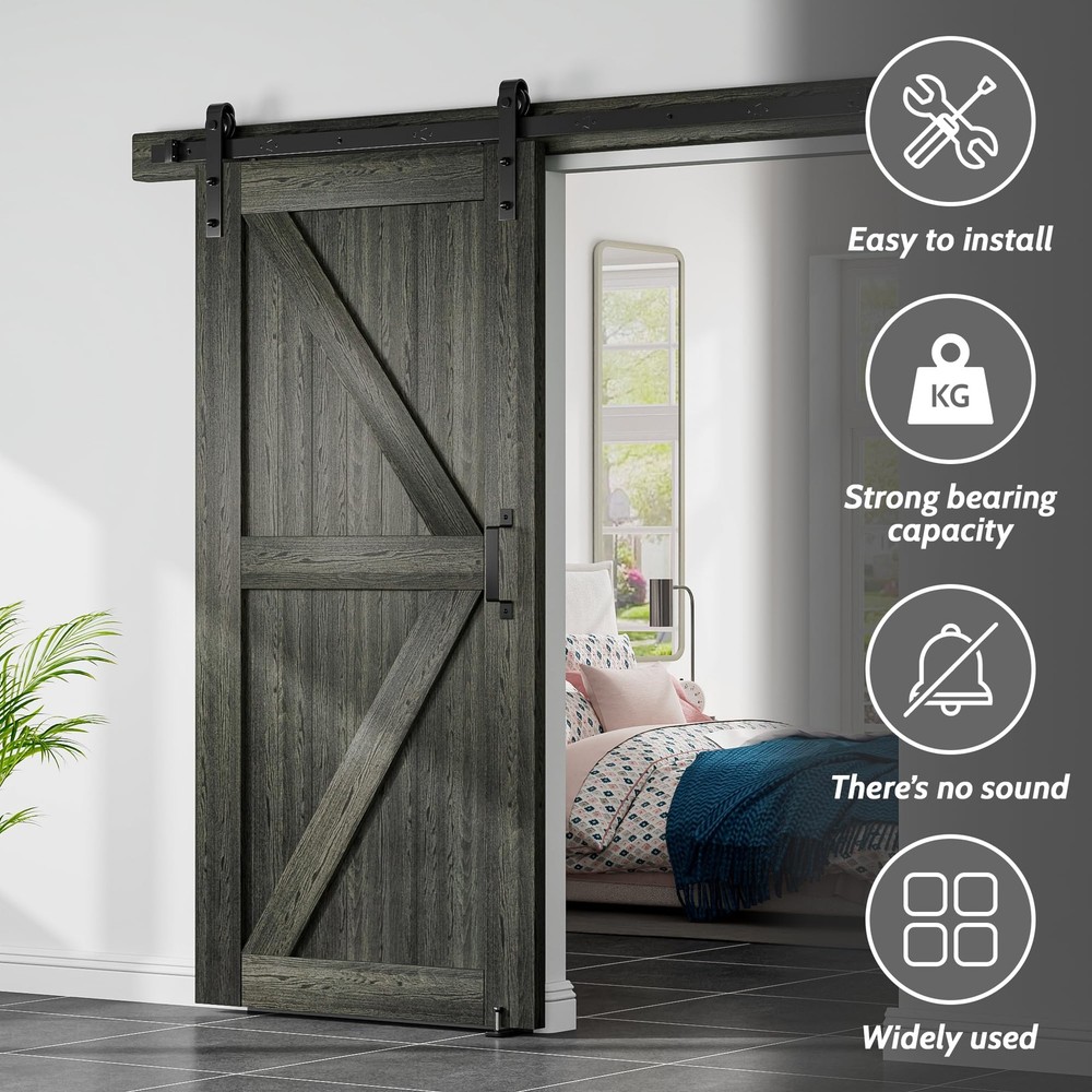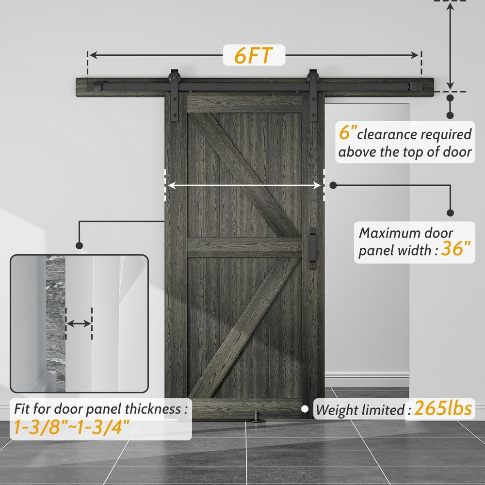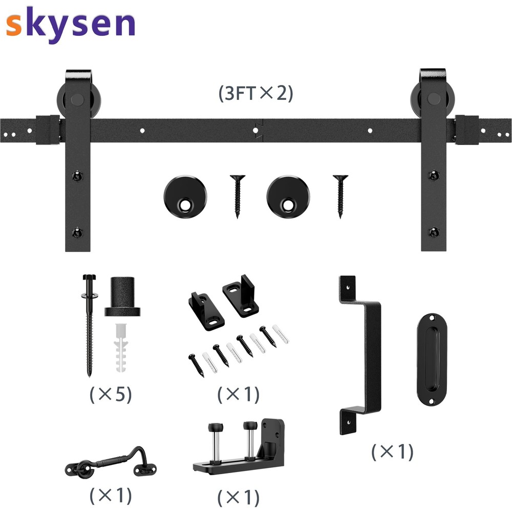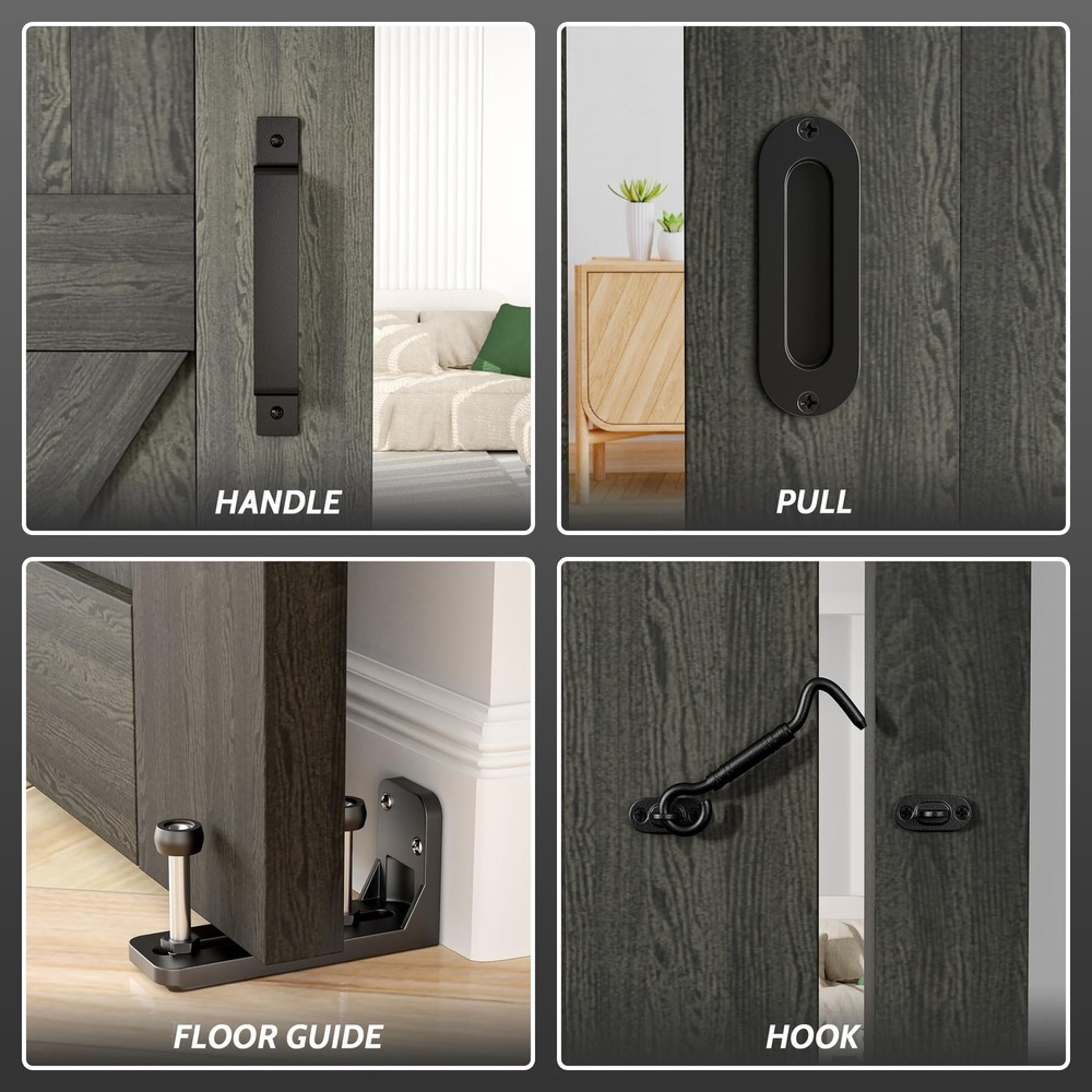barn door hardware kit set including handle pull,hook,wall mounted floor guide. [SUPER QUALITY RAW MATERIAL] Barn door hardware kit are made of 1/4” thick carbon steel (Maximum load 265lbs). Barn door wheel are made of POM (Stronger than plastic or nylon). Barn door spacer is also made of carbon steel (More stable than other plastic spacer). The bolts and leg screws are 8.8 grade (Keep the barn door hardware system last for long). The surface is spray black powder coat (Anti-rust, Looks smooth). [EASY TO INSTALL] Barn door track pre-drilled hole space is 16", Step by Step Instruction included. Our Instruction is listing every step for installation from A to Z. You can finish the installation of barn door hardware kit in half an hour if you get 2 workers. In case you get any problem or missing parts during installation, please free feel to via . [IF MY BARN DOOR FIT THIS SIZE] The maximum barn door width is 1/2 of barn door track, Fit for door thickness from 1-3/8" to 1-3/4"(If you your barn door panel is too thin, then you can using the 5mm black spacer pad inside package, if your barn door is too thick, then you need to buy longer bolt extra). If you have a door way trim, then you need to buy an extra trim board to install the barn door track or just remove your trim. [WHY US] Get super quality barn door hardware kit from us, All the barn door track and barn door roller have been inspected in factory before delivery, Also they have been Passed 100,000 times opening and closing test to ensure the barn door hardware kit you get will works fine. Get a barn door hardware kit with a manufacturer price, why not? [SPACE SAVING] Sliding barn door hardware kits provide an excellent solution for space utilization. Unlike traditional sliding doors, barn door systems don't impose limitations on the space behind the door, enabling you to conveniently organize items there. The key benefit of opting for a barn door system is the significant enhancement in spatial efficiency, which ultimately contributes to a neater and more organized space.ONLY BARN DOOR HARDWARE KIT INCLUDING ,BARN DOORS ARE NOT INCLUDED.