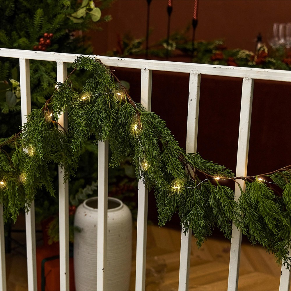 Seasonal Artificial Christmas Garland Pine Needle Cypress Red Berry Mini Garland for Holiday Winter Indoor Outdoor Decor with string lights 【Much Denser】 - Lush and full 144 cedars on a rattan. Each accessory is handmade, they are layered on top of each other, and the whole vine looks very layered. The Xmas garland is much lush and full of a Christmas atmosphere. 【Dimensions】 - The packaging includes an artificial Christmas pine garland. The length of the Christmas garland is 190cm/6ft. 【Applications】 - Place it anywhere to add charm, such as mantelpieces, dining tables, stair railings, railings, walls, doorways, windows, archways, etc. The garland can also be randomly matched with other small things to increase the Christmas atmosphere, such as pine cones, Christmas balls, and so on. It is an indispensable Christmas item to add a festive atmosphere to your home! 【Reusable Garland】 - This high-quality Christmas garland is made of durable material, which is not easy to fade and has a waterproof effect, can be used to decorate outdoors. As long as you put it away after using it this year, you can continue to use it the following Christmas.
