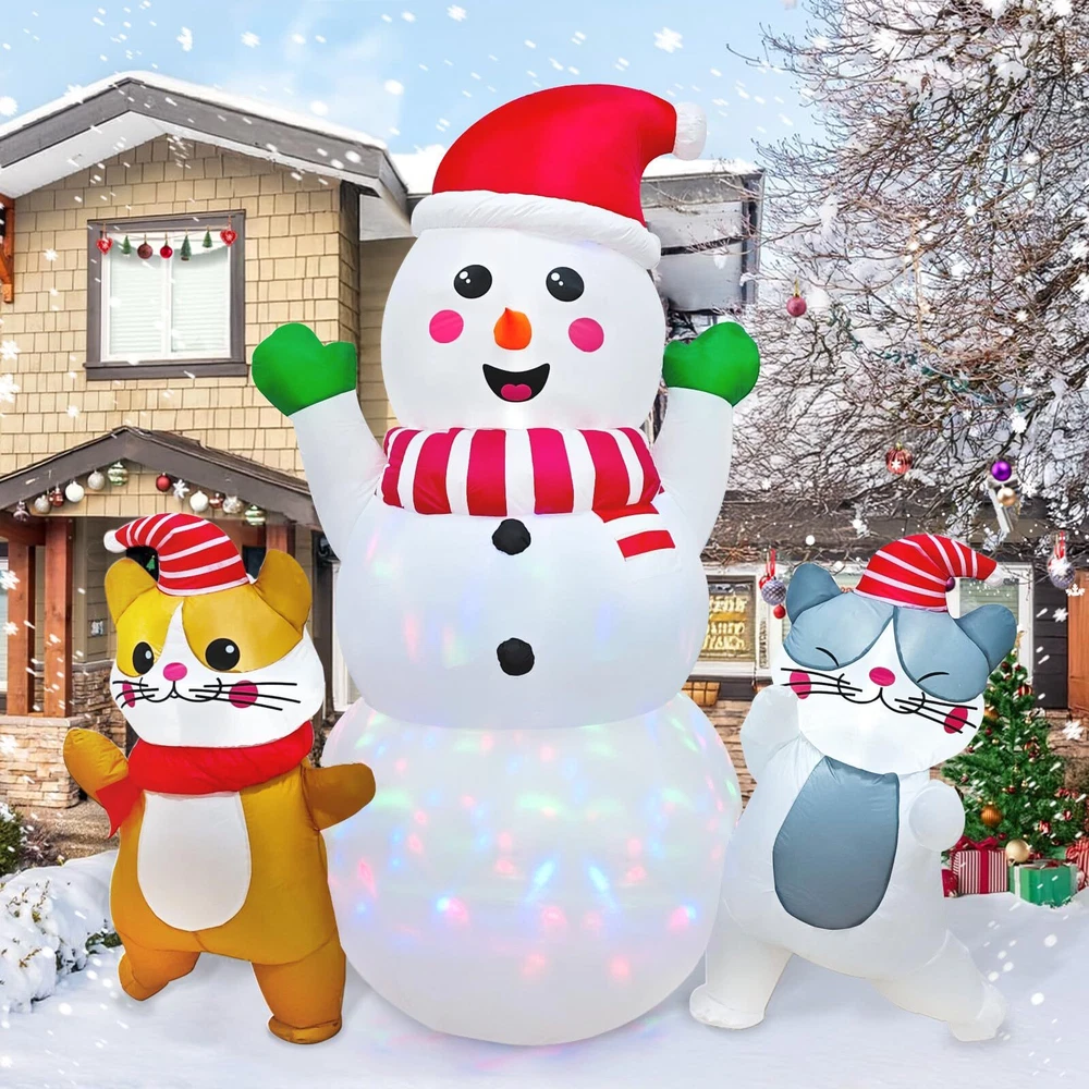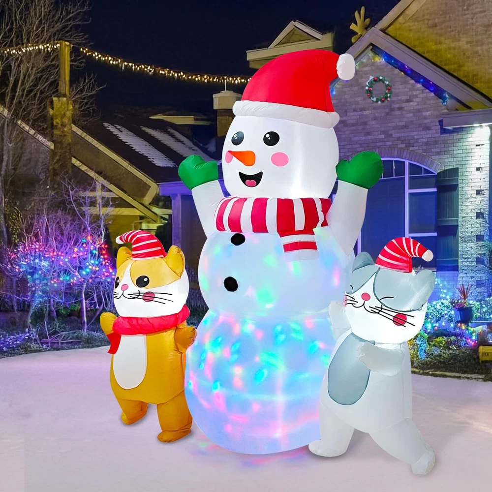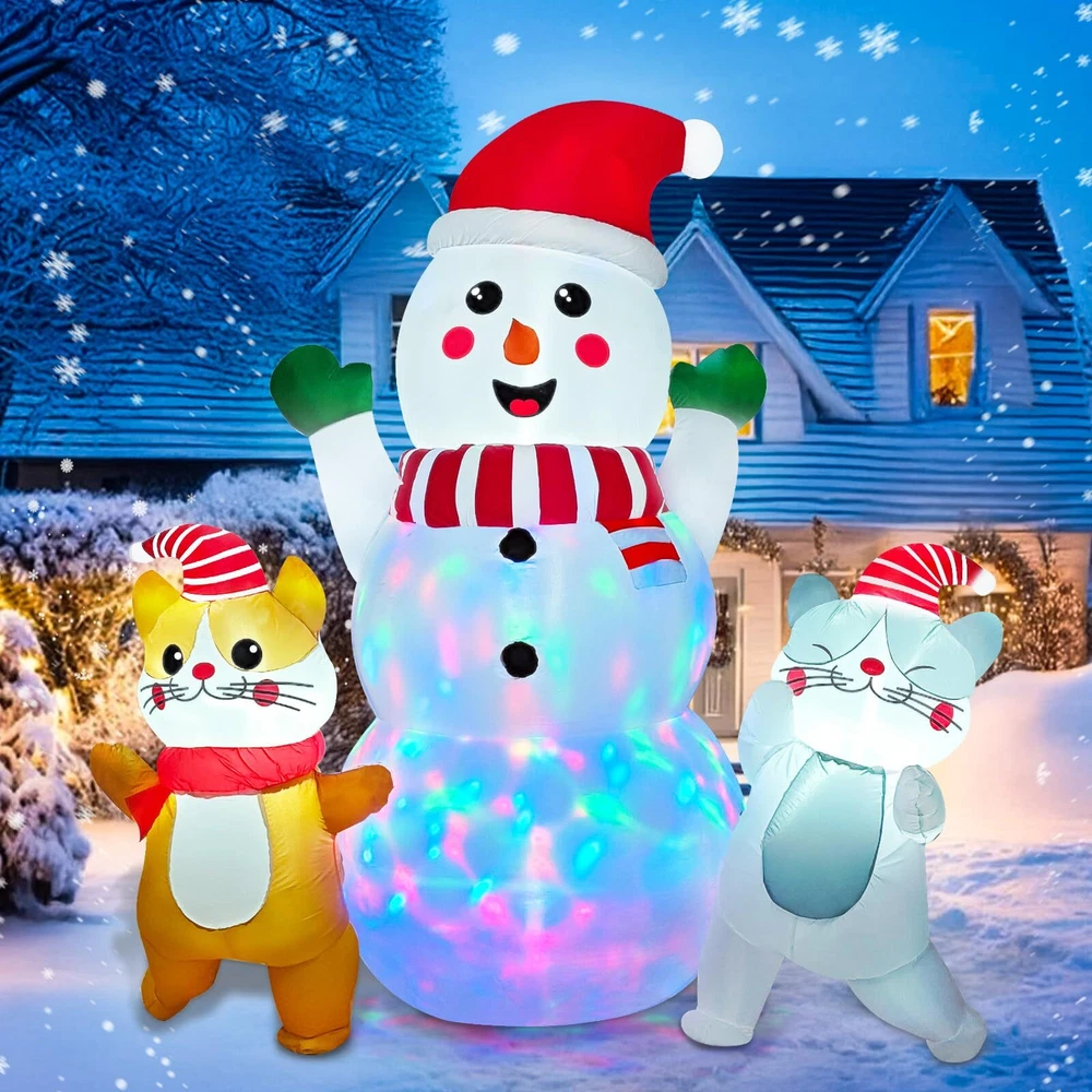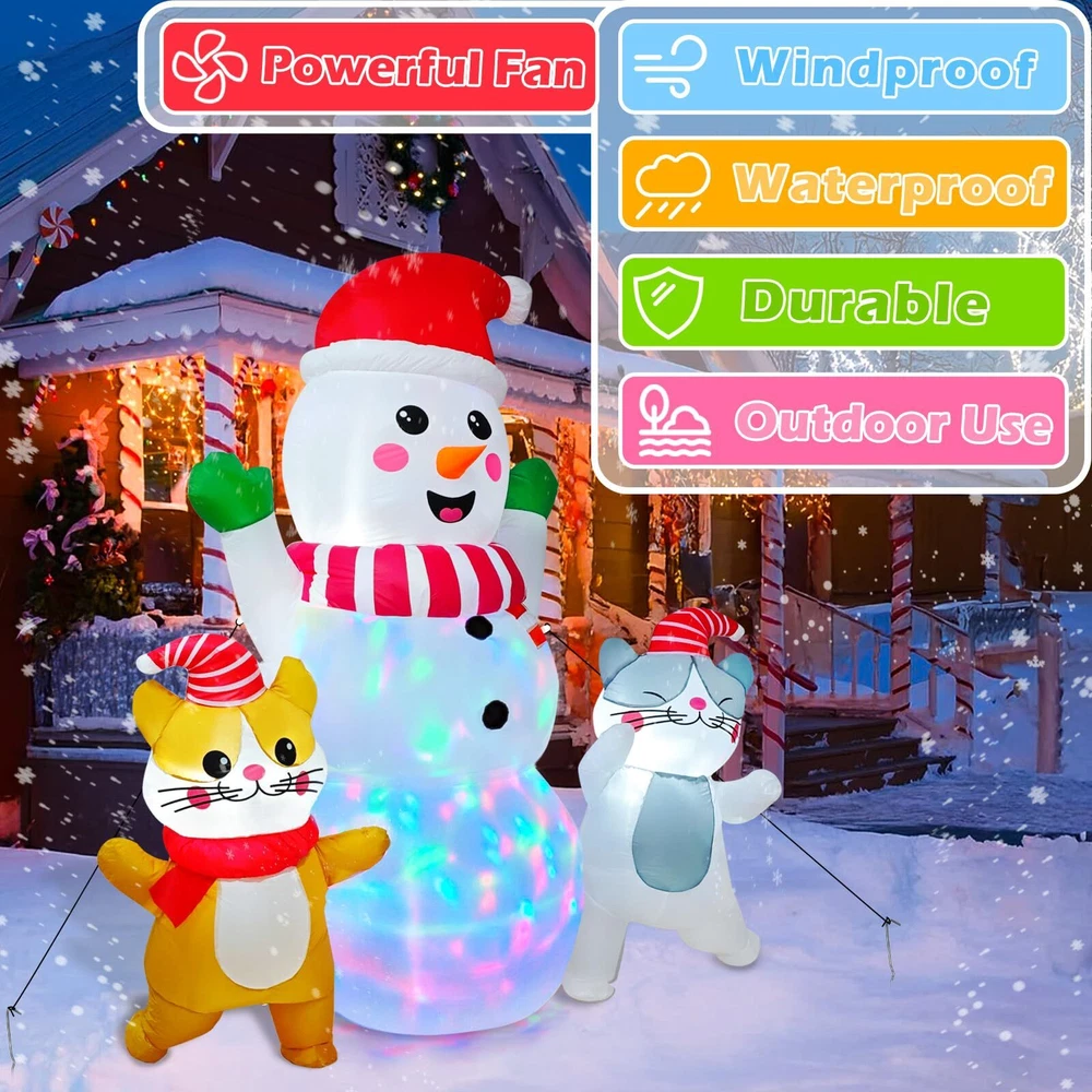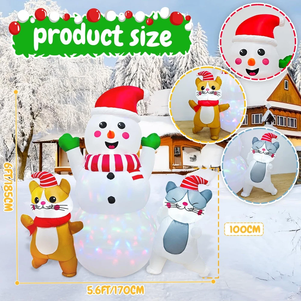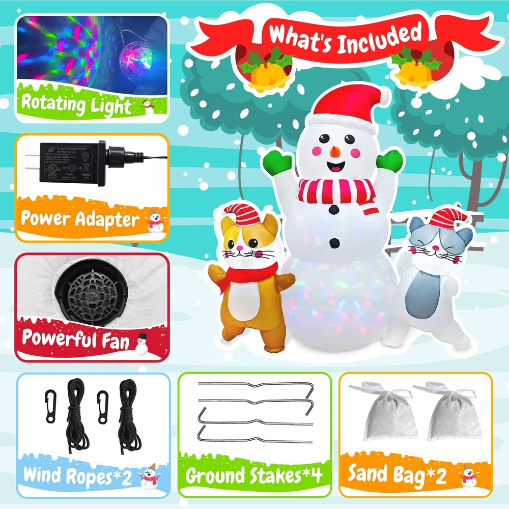 6 FT Christmas Inflatable Snowman with Cat Dancing Indoor & Outdoor Christmas Yard Decoration with Fan and Anchor Ropes Unique and Adorable Design--Our Snowman Christmas Blow Up feature a Charming snowman adorned with a red hat, with two dancing cats by his side. This festive trio is sure to captivate the attention of all, whether indoors or outdoors. Placing this outdoor Christmas inflatables in your home or yard will instantly add a joyful and festive touch to your Christmas decor Premium Quality Materials--Crafted from high-grade 190T polyester, our Snwoman Christmas decorations outside are designed to withstand the rigors of outdoor use. The fabric is waterproof, rip-resistant, and features vivid, long-lasting colors . The smooth-operating zipper adds to the overall quality and convenience. Our Christmas inflatables are great choice for your Christmas party decorations Weather-Resistant and Stable--Equipped with two sand bags, 6 ground stakes, and 2 retaining straps, our Snoman blow up Christmas decorations outdoor is designed to stay upright and secure, even in windy conditions. The sand bags provide added weight for stability, while the stakes and straps ensure the Christmas inflatable remains firmly in place, ready to brighten your yard throughout the holiday season. Built-in Rotating Colorful Lights—This Christmas blow ups outdoor come with 3 B3 white lights and 1 rotating colorful light, adding a magical and enchanting glow to your outdoor space at night. Whether placed in your yard, on the lawn, or in the park, the festive lights will transform your snowman outdoor christmas decor into a captivating winter wonderland, perfect for enjoying the winter holiday spirit under the starry sky Easy to Set Up and Inflate--Featuring a built-in powerful blower and supported by an adapter (1250mA), our Snoman Christmas lawn decorations can be inflated in just a few minutes. The simple and straightforward setup process makes it convenient for anyone to enjoy the beauty of these giant Christmas inflatables, whether as a stand alone decoration or as part of a larger holiday display