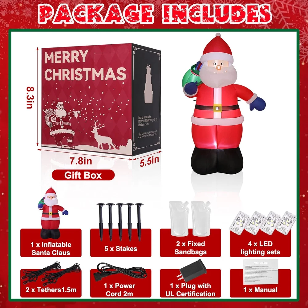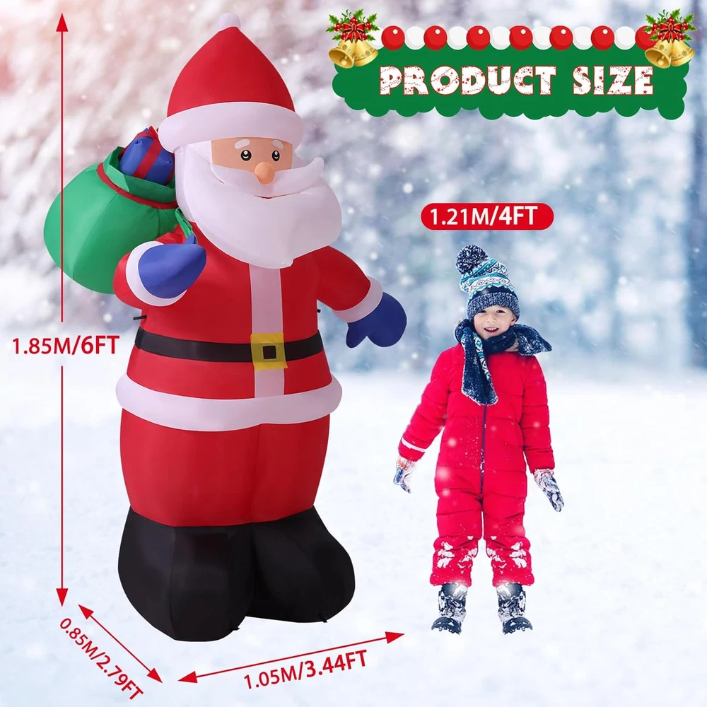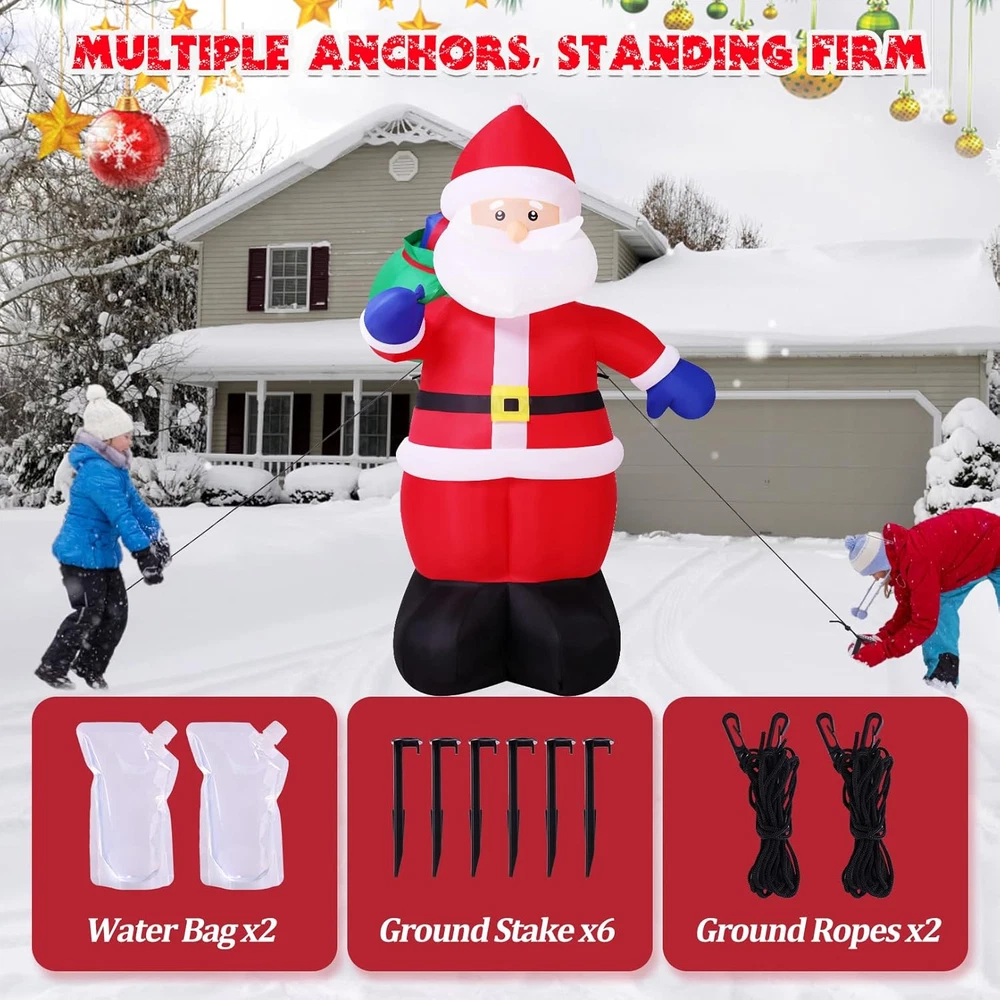 Store New Arrivals Add to Favorite View Feedback Contact Fast deliveries to the customer's home Quality customer service John Make the customers happy! 6FT Tall Christmas Inflatable Outdoor Decoration outside Smiling Santa Claus with Gift Bags, Built-In Leds Blow up Santa Christmas Decorations for Holiday Xmas Yard Patio Lawn Indoor Outdoor Decor Description CHRISTMAS FOCAL POINT & BUILT-IN LEDS:The 6FT Christmas Santa stands joyfully, waving at everyone. With a massive sack of Christmas gifts on his right shoulder, he smiles and extends the most beautiful Christmas wishes to all.Built-in LED lights make him glow at night, turning your home into the new neighborhood attraction. Kids love posing for photos with blow-up Santa, and this is a great outdoor lighted Christmas decoration that is sure to attract guests HASSLE-FREE SETUP & STORAGE: This inflatable Santa comes with a high quality blower that lasts up to 5,000 hours, and the blower is powerful enough to keep inflating without making noise. Simply zip up the bottom and plug it in, in a few minutes, the Christmas Decorations Outdoor Santa will come to life and greet your guests with a cheerful smile and warm greeting. When the holiday season is over, it easily deflates for compact storage, allowing you to enjoy its adorable charm year after year. WEATHER-RESISTANT & LONGER LIFESPAN: This Santa Claus inflatable outdoor is made of durable 210T waterproof umbrella fabric, which is not only very wrinkle-resistant but also not easy to be pierced by sharp and hard objects; The waterproof design ensures it stands strong against snow and wind. What’s more, with spraying technology, the vibrant color won't discolor. This makes it the perfect christmas outdoor decoration to your yard, bringing festive cheer to your home year after year. SUPER STABLE & SECURE ENOUGH: Santa blow up Christmas inflatables provide 5 ground stakes, 2 fastened ropes, 2 plastic bags, and a UL-approved plug to ensure safe use. "2 plastic bags" can be filled with water or sand and placed on Inflatables bottom to add weight and make it more secure and stable in windy weather. No need to worry about your Christmas inflatable santa claus will fly away by wind INSTALLATION AND PRECAUTIONS: The blower with a 13FT power cord which meaning that you can place it anywhere in your yard or garden; First to inflate the christmas inflatable outdoor decoration until there is enough air inside; Then fix the inflatable decoration by the stakes and make sure it is secured on the ground; Moreover, zip up the bottom zipper to avoid air leakage, otherwise, open the zipper for fast deflate. TIPS: do not put anything into the blower and decorations PERFECT FOR ANY CHRISTMAS BASH: Outside Christmas Decorations for Yard, Garden, Christmas Event, Shopping Mall. Whether you're hosting a holiday party, decorating a retail display, or beautifying your outdoor landscape, whubefy outdoor santa decorations make a charming focal point and spread holiday cheer. Its vibrant and adorable appearance makes it a great gift for kids and families to play with and take pictures. Product Description Whubefy 6FT Christmas Santa Claus! Bringing Holiday Blessings to Your Home! Want to make your yard the neighborhood's highlight this Christmas? Our Santa decoration with ultra-bright LED lights will instantly illuminate your outdoor space, creating a festive atmosphere. Watch as kids and adults flock to take pictures, making your home the ultimate holiday photo spot! Get ready to have the most festive house on the block with Christmas Santa inflatables decorations! Built-In Multiple Ultra Bright LEDs That Will Instantly Light Up Your Yard Brighten up your yard with our Christmas inflatables! Featuring waterproof, colorful LED lights, they'll turn your space into a festive wonderland, rain or shine! Securely Anchored , Not Afraid Of Windy Conditions No need to worry that this santa claus inflatable decoration will fly away with the wind!4 Ground stakes and 2 tethers are provided for tie-down. Built-in 2 water bags, an opening at the bottom with a zipper provides space for adding water bags to make it more secure and stable. Blow up Outside Christmas Decorations for Yard, Garden, Party, Shopping Mall Great for Christmas decorations indoor, Christmas decorations outdoor yard, Christmas party decorations, Christmas vacation decorations, holiday season decorations, etc. The Packaging Box Includes Everything Necessary For Quick Installation With this well-designed huge inflatable Santa Claus, your yard will impress your neighbors, and bringing joy and happiness to your kids. Style 6FT-Santa's Mysterious Gift Item Dimensions 41.34 x 33.46 x 72.83 inches Color 6FT-Santa's Mysterious Gift Material Type Polyester Theme Christmas Occasion Christmas Additional Features Long Lasting Subject Character Santa Claus Cartoon Character Santa Claus ABOUT US We offer the best prices around on high quality products. Our E-store includes media such as books, movies, music and games while offering electronics, toys, sporting apparel, clothing, tools, general home, garden items and more. SHIPPING We are always working hard to ensure your package arrives as soon as possible. Please understand that some factors like weather, high postal traffic, and the performance of shipping companies are outside of our control. We offer free shipping to the lower 48 states and ship within 2 business days of payment, usually sooner. We do not accept P.O. Boxes. Please provide a physical address. For shipping outside of the continental USA, we only use eBay's Global Shipping Program. The item is shipped to KY and then sent to the rest of the world. International customers are responsible for all duties and taxes. Continue to 'check out' to calculate costs for shipping the item to your country. Messages regarding eBay's Global Shipping Program MUST be directed at eBay EXCLUSIVELY. RETURNS We offer a 30-Day Return Policy on items in which you are not complet
