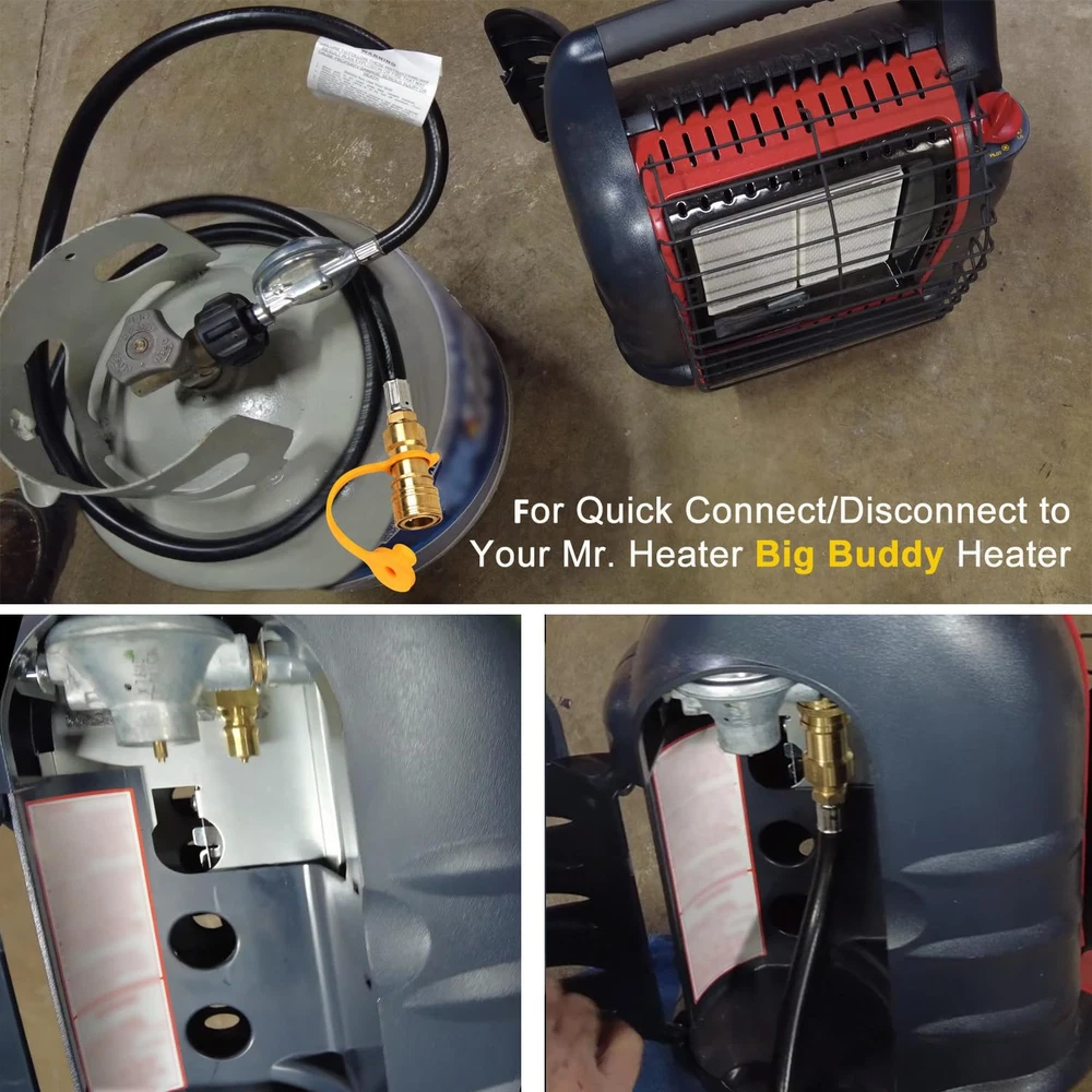 Perfect and Use Only for Mr. Heater Big Buddy Heater. The propane regulator hose assembly replacement for use on Mr. heater MH18B & F274830 Big Buddy indoor & outdoor heater. This is exactly the hose you need for you Mr. Heater Big Buddy, don’t need filters using a direct connect hose. 3/8” Quick Connect & QCC1 connection (Type 1) & Regulator. Female quick connect fits standard 3/8 male quick connect (SAE fitting). QCC 1 connection hook to a 5lb-40lb propane tank cylinder. Easy to Connect. Enjoy your Big Buddy Heater by using 20lb propane tank as quickly as the 1lb canisters, but no more worrying the 1lb tanks are running out of heat. 3/8 inch female quick connect fitting for easy hook up your Mr. Heater Big Buddy propane appliance. High-Quality Material and Construction. CSA certificate passed. Hand wheel and solid brass fitting provide tight connection between propane tank and appliances. Enough Lengthy & Flexible to Get Job Done. 6-Feet length delivers the gas in a steady flow, expands your ability to take propane device anywhere.