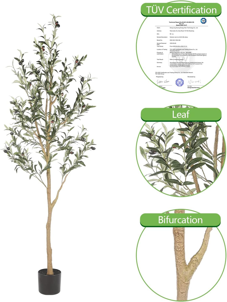 This faux olive tree is stunning—lifelike leaves and realistic fruits make it a perfect touch of nature for any modern space. The 6ft height and full branches add elegance, while the premium silk material looks incredibly real. Easy to place and no maintenance needed; it brightens up my living room effortlessly. Highly recommended for a chic, hassle-free greenery vibe!