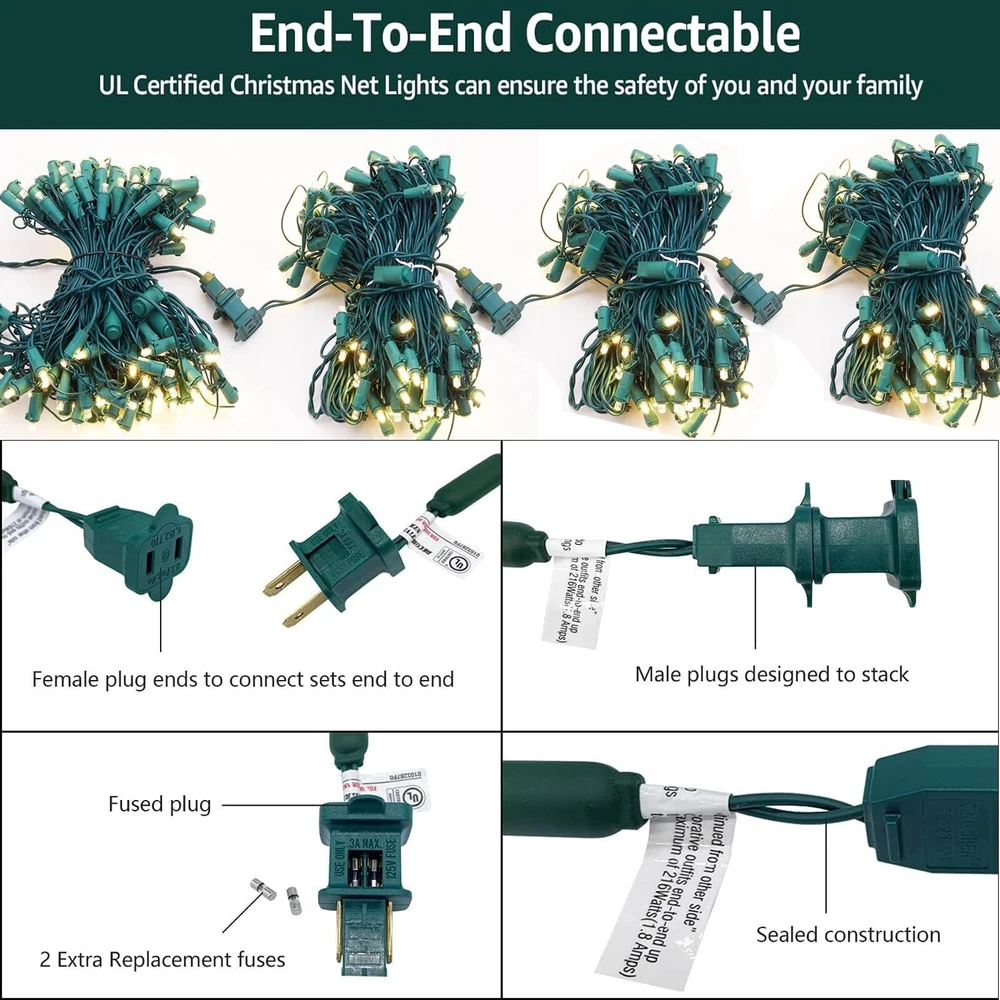 UL Certified Outdoor Christmas Lights: Strictly tested and meets the US requirements of string lights UL standards to ensure & maximize the safety. Whole set string lights including string wire, Led bulbs and plug have been certified by UL. With our 120LED 6ftx4ft net lights, perfect outdoor indoor decorations for Christmas, Thanksgiving, Easter, Halloween, party, yard, balcony, garden, pergola, gazebo, especially for trees and bushes. Durable And Energy Efficient Mesh Net Lights: Our Christmas bush lights adopt new eco-friendly materials and energy-saving Leds to ensure that it can be touched safely without heating after prolonged use. The new PVC material makes our netting lights several times brighter and more energy efficient than traditional mesh lights, as well as being no radiation, low power consumption, and cool to touch. Connectable Christmas Net Lights: Designed with Male and Female Safe Plug,Our net mesh lights can maximum connect with 10 sets lights extended in the mean time for more large scene display that fulfill different decoration needs. What's more, our christmas net lights also designed with a long leading and tail wire, meet your needs to have enough distance to lead the power from indoor to outdoor.These size is perfect to cover the small fence, patio, garden, bushes, trees. Waterproof for Outdoor Christmas Decorations: With IP44 waterproof and can be used indoors or outdoors in any weather condition. This bushes Xmas lights are perfect for courtyards, shrubs, Christmas, Halloween, Valentine's Day, parties, performances, weddings, homes, windows, bathrooms, festivals, balconies, bars, restaurants, hotels, commercial buildings, shopping centers, etc. (Please note: the adapter is not waterproof, if used outdoors, it should be used with a waterproof socket cover.) 【Bright Christmas Net Lights】:Our 4ftx6ft 120 led Christmas net lights string has a length of 9.84ft in front lead and 1.64ft in rear lead,perfect to cover the small fence,patio,garden,bushes,trees.Different from traditional ordinary lamp beads,Our net lights outdoor mesh lights adopts LED Mini lamp beads,these LED Mini bulb will create a 360º sparkling glowing,Illuminate your bushes with our net lights for bushes, designed to radiate light brightly from all angles for a dazzling display. Our clear Christmas net lights for bushes are full wave rectified, eliminating any flickering and ensuring a brighter display than ordinary LED net lights. 【Durable And Energy Efficient Mesh Net Lights】: Our Christmas bush lights adopt new eco-friendly materials and energy-saving Leds to ensure that it can be touched safely without heating after prolonged use. The new PVC material makes our netting lights several times brighter and more energy efficient than traditional mesh lights, as well as being no radiation, low power consumption, and cool to touch. 【End-To-End Connectable Outdoor Christmas Lights 】: Designed with Male and Female Safe Plug,Our net mesh lights can maximum connect with 10 sets lights extended in the mean time for more large scene display that fulfill different decoration needs.What's more, our christmas net lights also designed with a long leading and tail wire, meet your needs to have enough distance to lead the power from indoor to outdoor. 【UL Certified Net Christmas Lights】: Our outdoor christmas net lights Strictly tested and meets the US requirements of string lights UL safety standards.Not only christmas net lights has passed the UL certification as a whole, but its raw materials and accessories (such as wires and plugs) are all UL-certified products. High quality certified products ensure the safety of you and your family. Won't over heat even used for a long time.It has approved for indoor and outdoor christmas decorations. 【IP44 Waterproof Outdoor Christmas Decorations Lights】:Not only made of sturdy and fall-resistant LED material,but also the connection between the bulb and the wire is made of fully sealed rubber material,even if it is stormy,it can be used normally outdoors.Create your own winter wonderland this Christmas! Light up your home with this vibrant christmas bushes lights. Also use it for weddings, birthday or party decor both indoor or outdoor to add the festivity!(CAUTION:The plug is not waterproof, please keep the plug away from water).