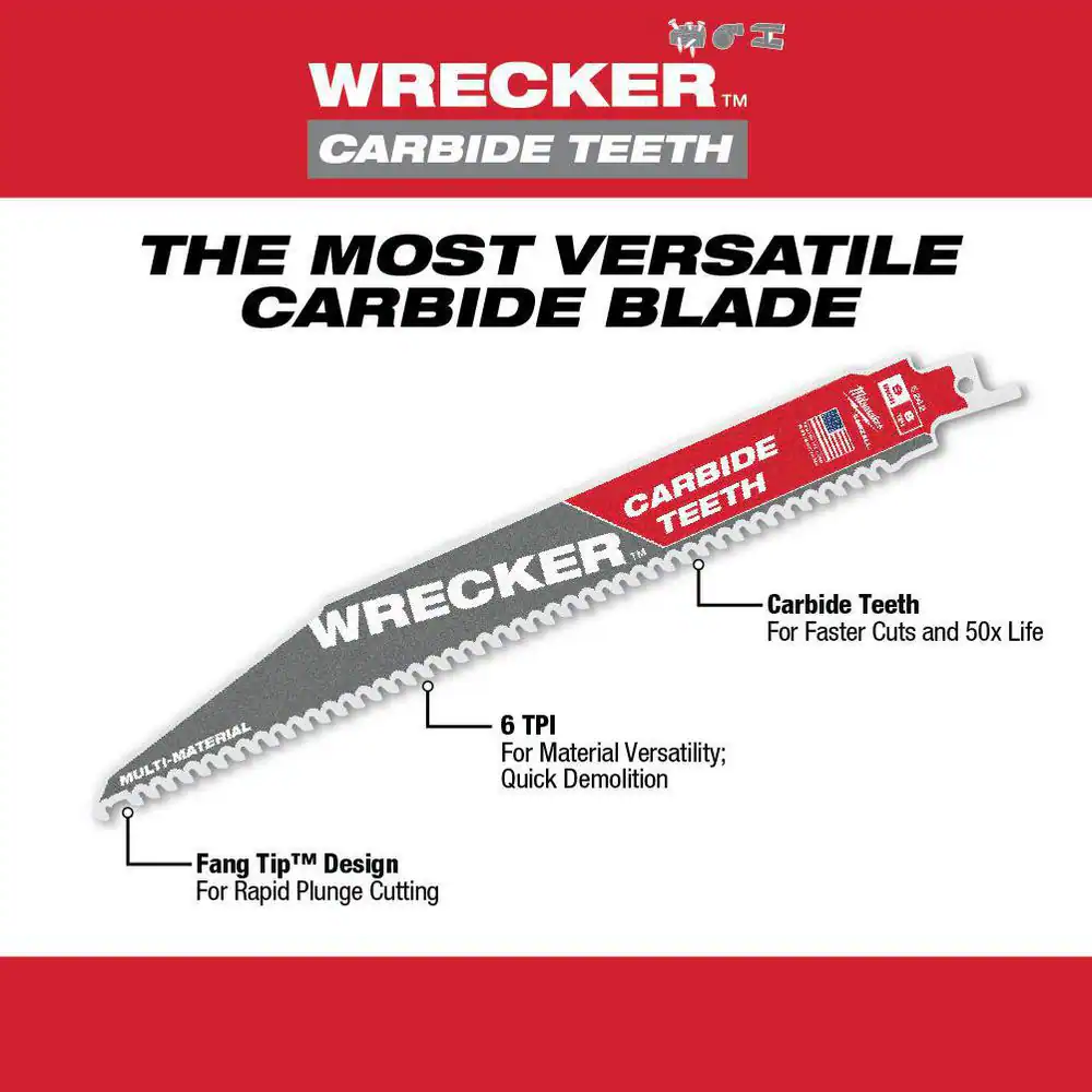 Fast Shipping On All Items 30 Days Money Guarantee Customer Support Excellent Service 100% Satisfaction Satisfaction Guaranteed 6 In. 6 TPI WRECKER Carbide Teeth Multi-Material Cutting SAWZALL Reciprocating Saw Blades (5-Pack) Specification Color Family Red Demolition Yes Material Cut Multi-Purpose Number in Package 5 Number of Teeth 36 Power Tool Accessory Type Reciprocating Saw Blade Returnable 90-Day Saw Blade Material Carbide Teeth Per Inch 6 Tools Product Type Power Tool Blade Length (in) 6 in Blade Width (in) 1/20" 6.0 inches. Item Description The most versatile carbide blade on the market Longer life vs bi-metal blades in clean wood, plastics, and metal Designed to cut materials found in demolition and remodeling The MILWAUKEE® WRECKER™ with Carbide Teeth SAWZALL® Blade cuts longer, cuts more, and cuts faster. Milwaukee® carbide SAWZALL® blades are designed with Carbide teeth for longer life vs. bi-metal blades in clean wood, plastics, and metal applications. Fang Tip™ design for the fastest plunge cutting in nail-embedded wood. The 6TPI design is ideal for material versatility and fast demolition. About us We offer the best prices around on high quality products. Our E-store includes media such as books, movies, music and games while offering electronics, toys, sporting apparel, clothing, tools, general home, garden items and more. Shipping We are always working hard to ensure your package arrives as soon as possible. Please understand that some factors like weather, high postal traffic, and the performance of shipping companies are outside of our control. We offer free shipping to the lower 48 states and ship within 2-3 business days of payment, usually sooner. We do not accept P.O. Boxes. Please provide a physical address. For shipping outside of the continental USA, we only use eBay's Global Shipping Program.The item is shipped to KY and then sent to the rest of the world. International customers are responsible for all duties and taxes. Continue to check out to calculate costs for shipping the item to your country. Messages regarding eBay's Global Shipping Program MUST be directed at eBay EXCLUSIVELY. Returns We offer a 30-Day Return Policy on items in which you are not completely satisfied with. You have the option of a full-refund or an exchange of the item. No returns are available on items shipped outside of the USA Satisfaction We try over very best to make sure every customer is completely satisfied. If there's a problem, message us! We're happy to help. Payment Options Shop With Confidence
