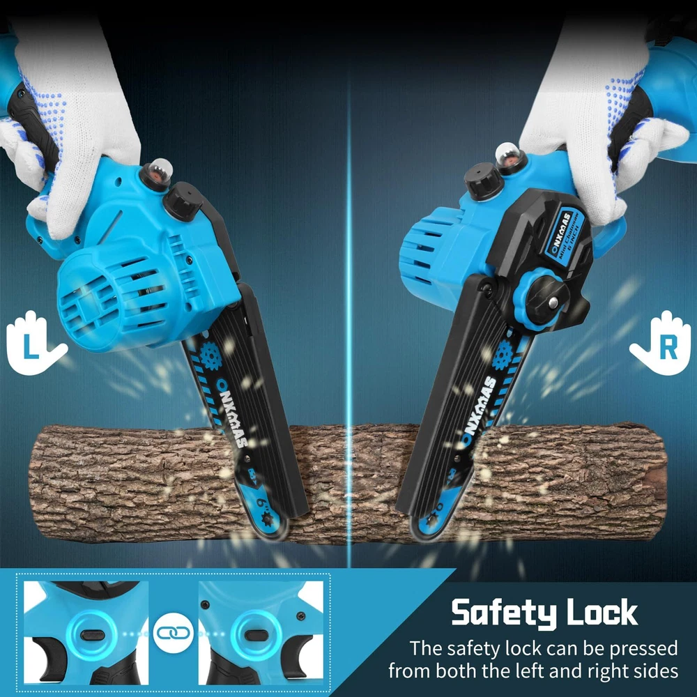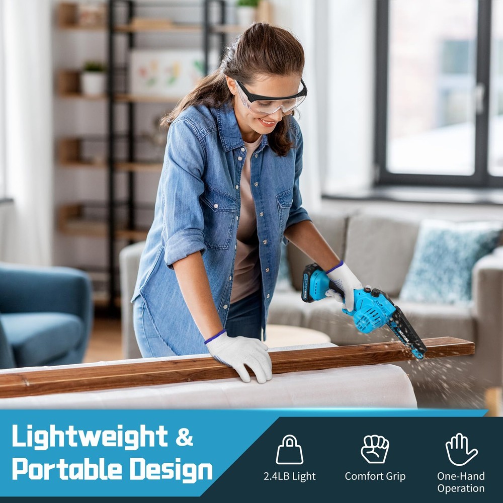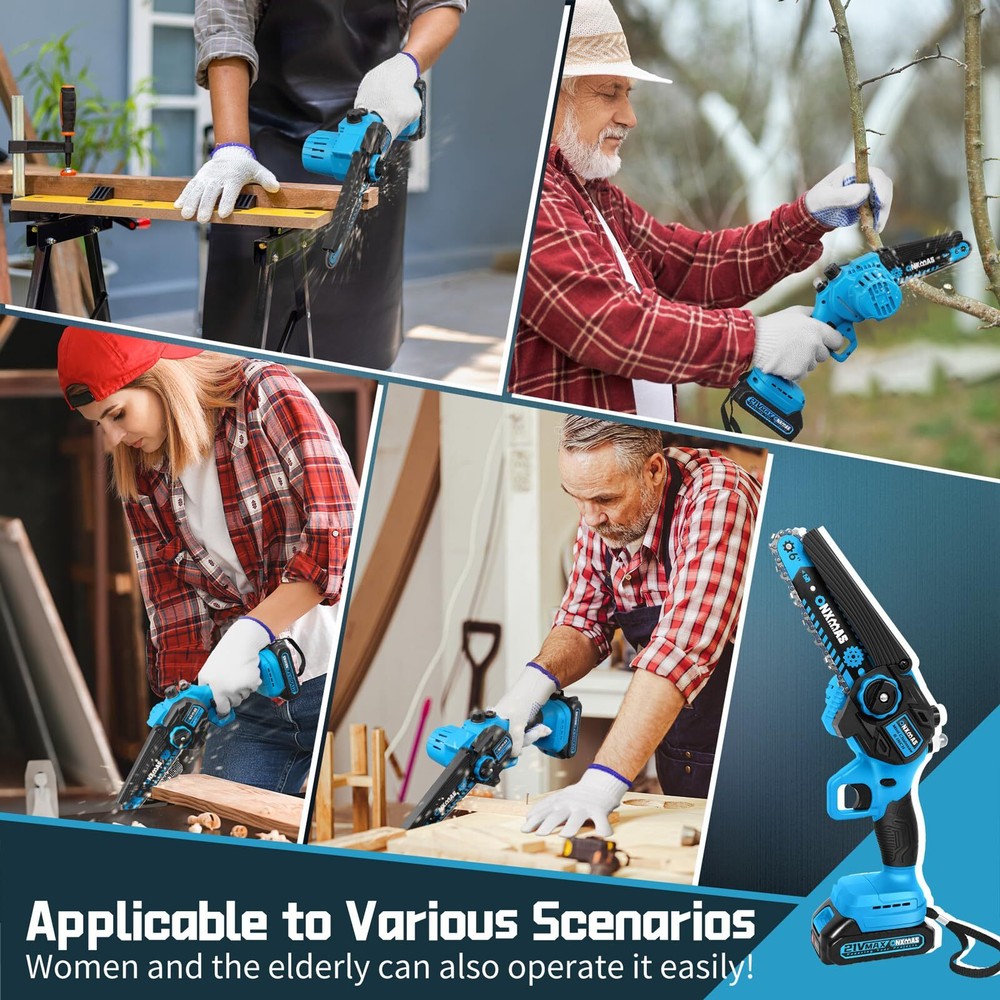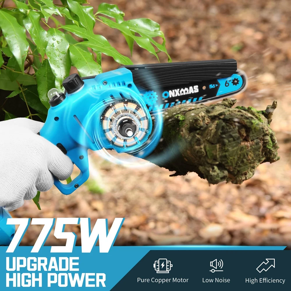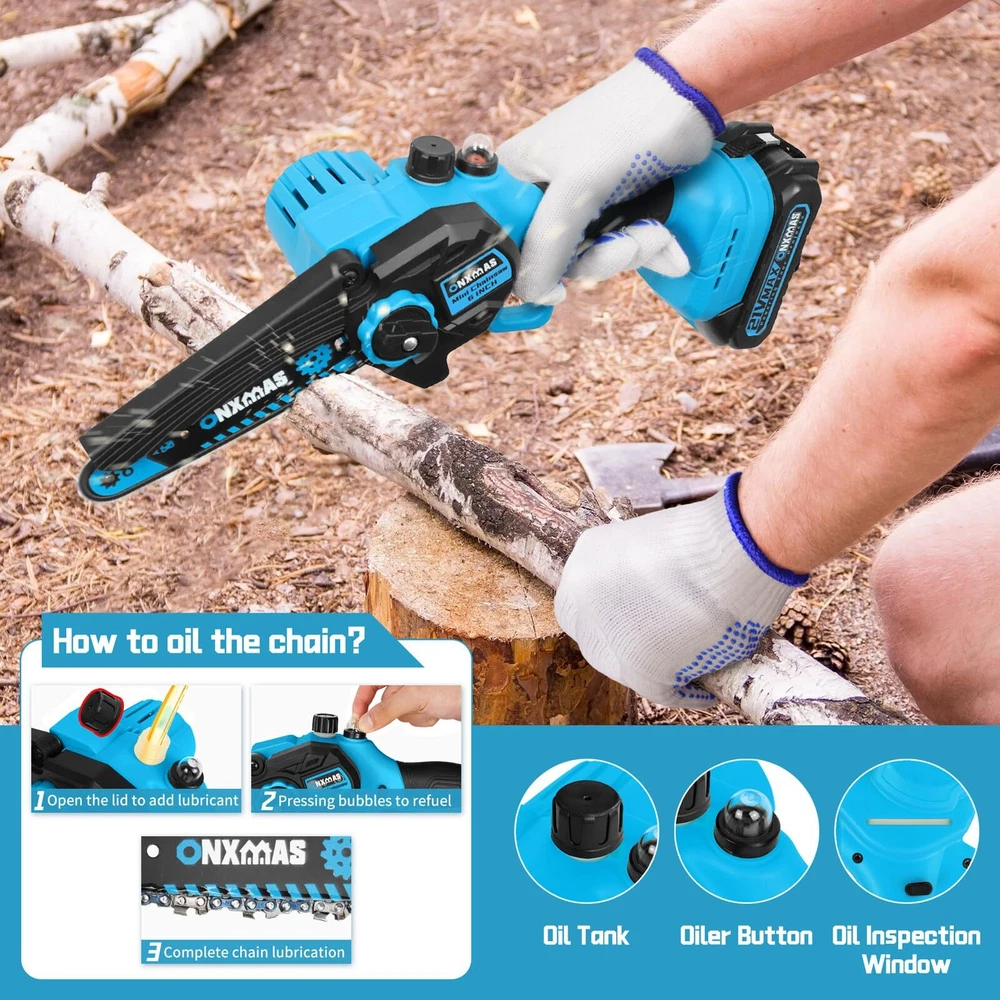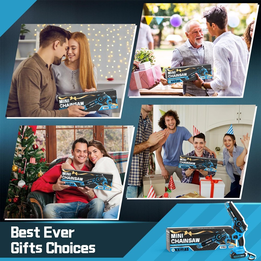Mini Chainsaw 6 inch Cordless, Wood Ranger Mini Chainsaw with 21V 2.0Ah Battery Smooth Cutting Performance: ONXMAS chainsaws are equipped with high-quality, deep-quenched guide chains and an upgraded copper motor, ensuring smooth, efficient, and long-lasting cutting Easy and Convenient Operation: The chainsaw features a push-button oil spray system, and the safety switch is designed for easy use with both hands. The chain can be adjusted tool-free, ensuring smoother branch pruning Lightweight for Easy Handling: At just 3.2 lbs (with battery), this cordless chainsaw is designed for easy one-handed operation, making it manageable for women and reducing fatigue during extended use Enhanced Battery Longevity:This mini chainsaw comes equipped with a 21V removable, rechargeable 2000mAh battery, providing extended performance. You can conveniently recharge the batteries whenever needed, ensuring that your chainsaw is always ready to go Enhanced Safety Mechanisms: To operate the mini chainsaw, engage both the safety lock and switch simultaneously. This dual safety system prevents accidental start-ups, keeping you and your family secure Perfect Gift Idea:This blue and black gardening tool is an ideal gift for carpenters and gardeners. Its sleek design makes it a great choice for Father’s Day, Christmas, Birthday, Anniversary, Thanksgiving, stocking stuffer or any occasion to surprise your men, dad, him, husband Reliable Customer Service: Your satisfaction is important to us! If you experience any issues while using our products or need guidance, don’t hesitate to contact us. Our dedicated support team is available to provide assistance whenever you need it. Are you still struggling with tough and time-consuming branch cutting? Looking for a lightweight yet powerful chainsaw to easily tackle garden pruning and yard maintenance? The ONXMAS 775W Mini Cordless Chainsaw is the perfect solution for you! Equipped with a powerful 775W motor and a high idle speed of up to 20,000 RPM , this 6-inch chainsaw effortlessly cuts branches up to 6 inches (15 cm) in diameter. Whether you’re trimming trees in your garden or preparing wood for camping, this tool ensures your tasks are quicker and more efficient. The ONXMAS chainsaw is not only highly efficient but also designed for ease of use, weighing just 3.49 pounds , making it perfect for one-handed operation. This lightweight design reduces fatigue and increases portability. For enhanced safety, we’ve built in a double safety lock system and an adjustable splash guard to shield you from flying debris during use. Get ONXMAS Mini Chainsaw today and experience hassle-free cutting, making all your outdoor tasks simple and efficient! Package Includes: 1 mini cordless chainsaw, 1 battery, 1 charger, 1 pre-installed chain, 1 Phillips screwdriver, 1 oil bottle, 1 pair of goggles and an instruction manual. Shipping We offer FREE shipping on all orders! We ship within Three business days of payment, usually sooner. We use a selection of shipping services such as UPS, FedEx, USPS etc. We only ship to the lower 48 states, no APO/FPO addresses or PO Boxes allowed. Local pickups and combined shipping options are not provided at this time. Return You can return a product for up to 30 days from the date you purchased it. Any product you return must be in the same condition you received it and in the original packaging. Please keep the receipt. Payment We accept payment by any of the following methods: PayPal Please pay as soon as possible after winning an auction, as that will allow us to post your item to you sooner! Feedback Customer satisfaction is very important to us. If you have any problem with your order, please contact us and we will do our best to make you satisfied. Contact Us If you have any queries, please contact us via ebay. We usually respond within 24 hours on weekdays. Please visit our eBay store to check out other items for sale! Thank you for shopping at our store.