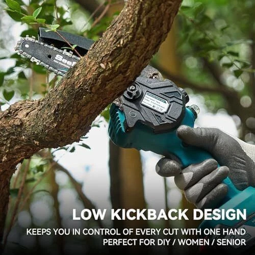 Perfect Companion for Everyday Tasks: Whether you're trimming branches in your garden, cutting firewood for a cozy night, or tackling a DIY project, the 6-inch mini chainsaw is designed to make every task feel effortless. It’s a practical and thoughtful gift for family and friends who love hands-on projects Get the Job Done 3X Faster: No more wasting time on slow, inefficient tools! With its powerful 900W motor and precision-hardened chain, this power chain saw breezes through logs up to 6 inches thick in just seconds—perfect for anyone looking to save time and energy Effortless Control for All Users: Weighing only 2.8 lbs, this small chainsaw is lightweight and easy to handle. Seniors, women, and beginners will appreciate how simple it is to use for pruning branches, shaping bushes, or clearing small logs—no prior experience needed Smooth Cuts Every Time: Say goodbye to frustrating jams or uneven cuts. The automatic chain lubrication system of chain saw keeps the chain running smoothly and prolongs its life, letting you work continuously without interruptions Safety You Can Rely On: Feel confident while you work with electric saw. The dual safety lock prevents accidental starts, while the chain guard protects against debris. The low kickback design adds an extra layer of stability, ensuring safe use for every user, every time Always Ready When You Are: With two long-lasting 21V 2000mAh rechargeable batteries, you’ll have up to 60 minutes of uninterrupted power for even your longest tasks. The fast charger gets you back to work quickly, so you’ll never have to stop mid-project Quiet Operation, Peaceful Work: Enjoy the quiet hum of your mini chainsaw—perfect for early morning or evening tasks without disturbing neighbors or loved ones. It’s the perfect balance of power and peace of mind Power Source Battery Powered Horsepower 900 Watts Item Weight 3.15 Pounds Product Dimensions 3"L x 2"W x 10"H Chain Length 6 Inches Chain Speed 16.5ft/s