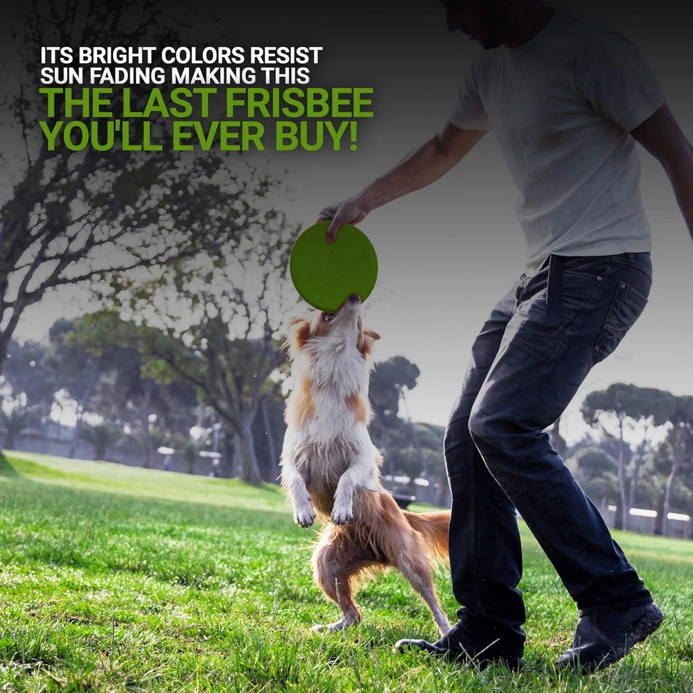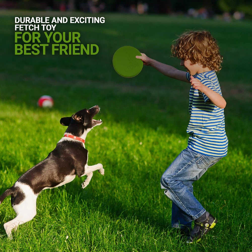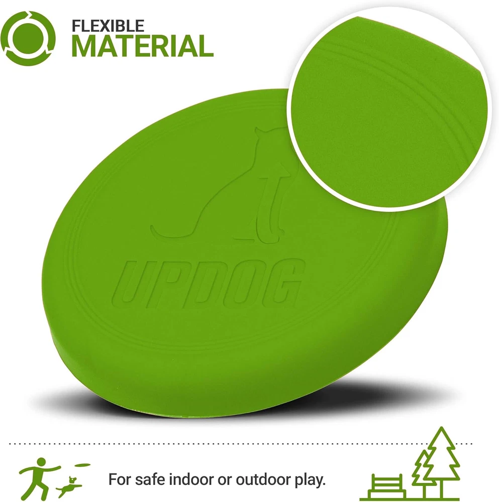 Made in the USA with Pet Safe Materials Flexible for safe indoor/outdoor play Ultra tough and chew resistant Dishwasher safe, easy to clean, no "chemical" scent The UpDog Ultra Tough 6" Flyer is an extremely durable and exciting fetch toy for your best friend. Made out of the highest quality US sourced flexible plastic, this toy won't injure the dog's mouth or owners hand. The design is optimized for long distance throws and stability in flight. Bright colors resist sun fading and are easy to find even in the thickest brush. If you've been unhappy with the quality of other brands, give this flying disc a try, it is the last frisbee you'll ever buy! Proudly made in the USA by dog owners, for dog owners.