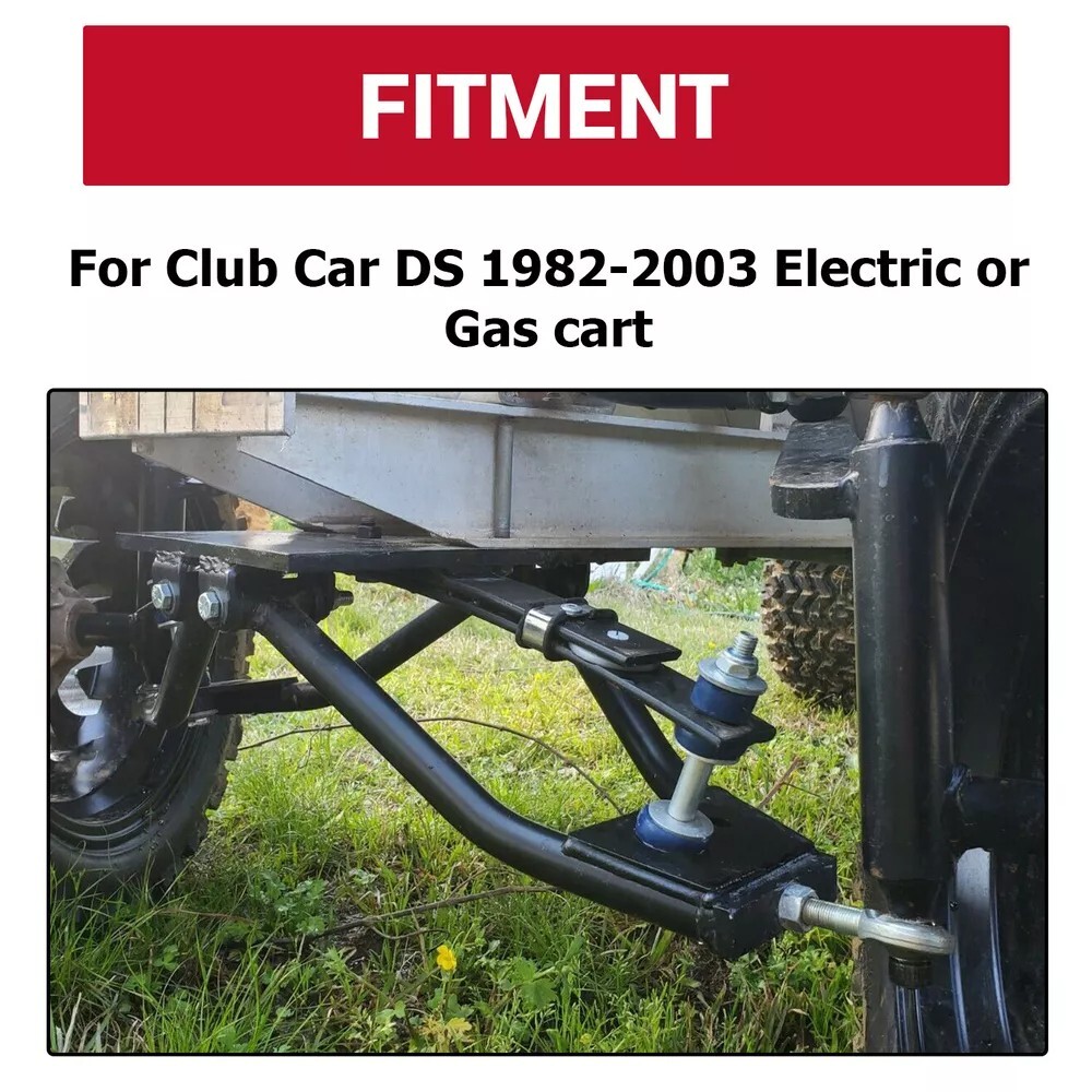 Description This is a 6" lift kit, you can install up to a 23" tire on your cart (Heavy duty rear springs are recommended if the cart is heavily weighted to prevent rubbing with 23" tires). It will work on gas and electric DS model carts (with STEEL HUB COVERS). Specification Color: Black Material: Steel Replaces stock front axle with double A-Arm design Made of powder coated black steel. All high strength hardware included. Includes front and rear lift. Bolt on kit with no any modification. Fits For Club Car DS 1982-2003 Electric or Gas cart NOTE: THIS LIFT KITS CANNOT BE MOUNTED ON PRECEDENT OR CARRYALL MODELS. Package Included 1 Set 6" Double A-Arm Lift K