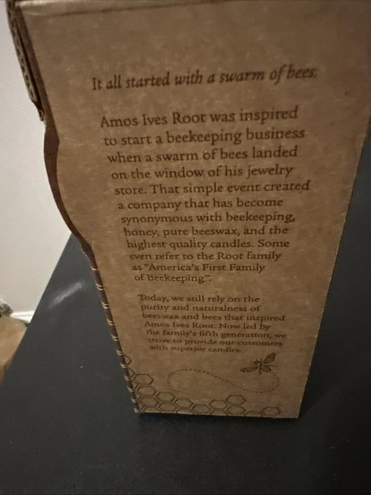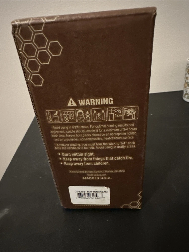 Elevate the ambiance of any room with this elegant Root Beeswax Pillar Candle. The candle has a French Vanilla scent that will fill your home with a warm and inviting aroma. The ivory color of the candle will complement any decor, making it a perfect addition to your living room, bedroom, foyer, or dining room. There is a small dent on the top side of the candle (see photos), also the box states Buttercream but the candle states French Vanilla (see photos) Crafted from high-quality beeswax, this single wick candle has a burning time of 17 hours per inch and measures 6 inches in height and 3 inches in width. The candle is made in the United States and comes in a pack of one. Perfect for those who love nature-inspired themes, this candle will add a touch of elegance to any indoor space.