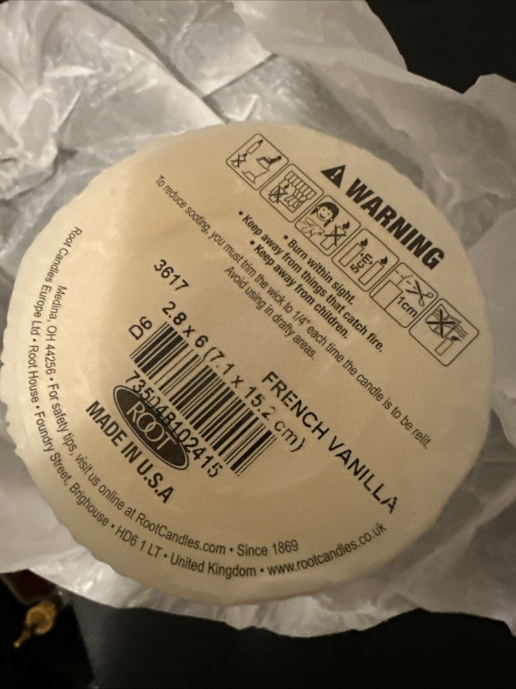 Type: CANDLE Features: Single Wick MPN: Does not apply Scent: French Vanilla Theme: Nature gtin13: Does not apply Burning Time: 17 hrs per inch Item Height: 6 in Size: 6-Inch Shape: Pillar UPC: Does not apply Color: ivory Brand: Root Candles Item Width: 3 Inches Number in Pack: 1 Material: Beeswax Country/Region of Manufacture: United States Room: Bedroom, Dining Room, Foyer, Indoor, Living Room