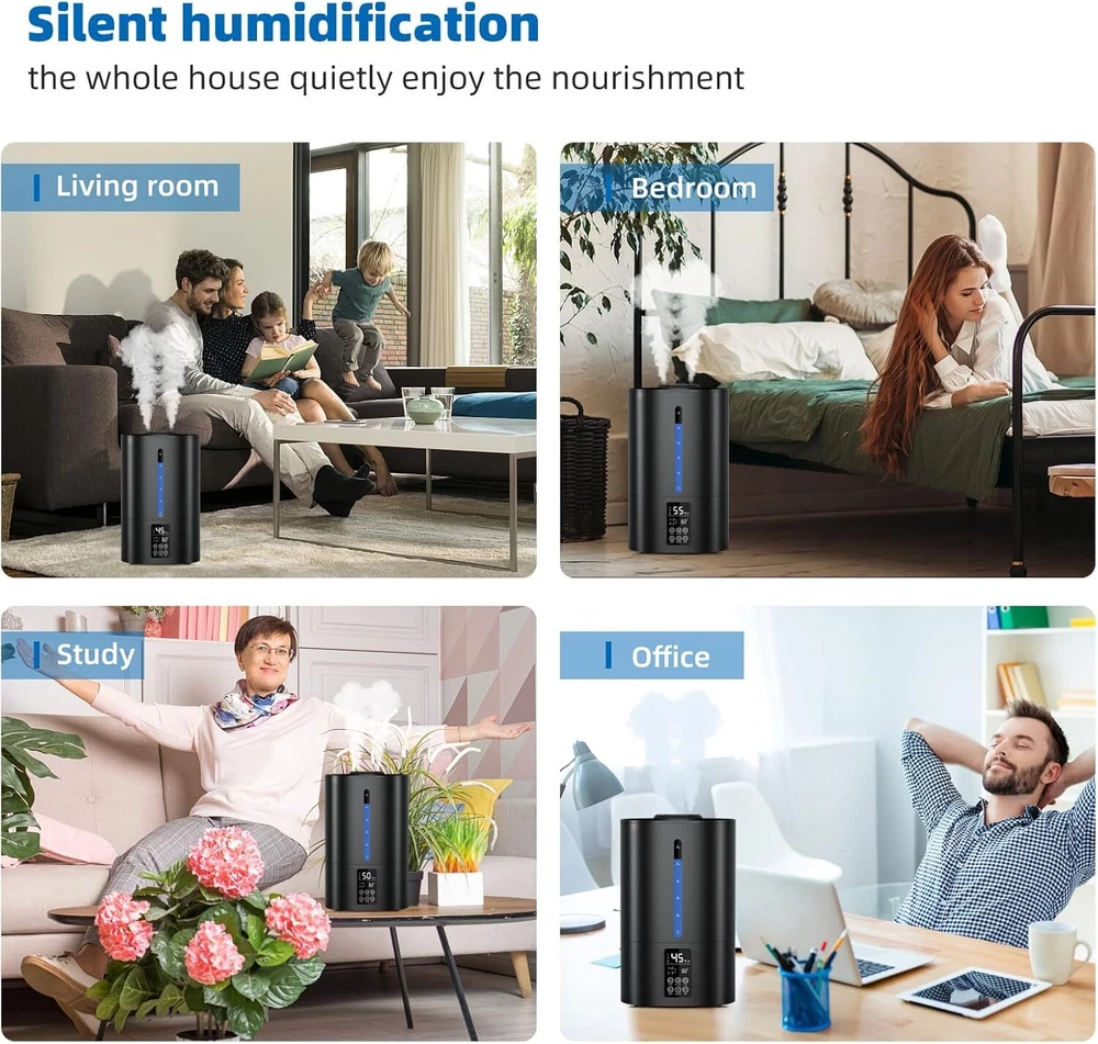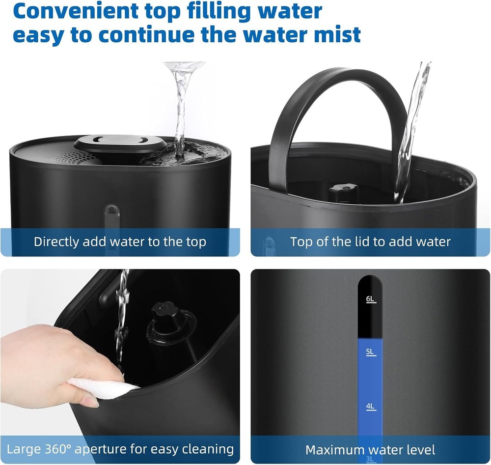Brand Coolfiqu Special Feature Adjustable Humidity Control, Low Water Indicator, Manual, Auto Shut Off, Aroma Diffuser Color C-Midnight Black Filter Type Pre Filter Floor Area 500 Square Feet About this item Warm and Cool Mist Humidifiers:Our ultrasonic humidifiers offers both cool and warm mist options, switchable with a single touch. The strong cool mist humidifier the dry room air for improved sleep. The warm mist humidifier is ideal for moisturizing the skin and easing discomfort.Note: Remove the white foam from the base before use Top-Fill Design for Convenience:Top fill humidifiers design revolutionizes refilling, letting you easily pour water directly into the tank. No tricky angles or tough openings, just pure convenience and a seamless experience.The 6L humidifier for bedrooms, large rooms,nursery, offices, indoor plant humidifiers, that is an ideal choice Humidifiers for Large Room:Our 6L humidifiers operates 60 hours per fill for extended use. Ideal for large homes, it reduces refills for uninterrupted, consistent humidity. 360° rotating nozzles disperse mist in any direction, providing even humidity and creating a soothing environment,It‘s good for humidifiers for home and humidifiers for plants 3 Levels of Mist Adjustment:Smart humidifier’s sensor automatically regulates for optimal humidity, offering three settings to match your preferences. This feature caters to your specific humidity needs, whether you require a light mist humidifier for small room or a heavy mist humidifier for larger home Sleep Mode for Bedroom Humidifiers:In sleep mode, the LED screen turns off to ensure undisturbed rest, while the humidifier continues to operate normally, emitting a quiet, soothing cool mist and warm mist. It maintains a steady humidity level in your bedroom throughout the night.warm humidifiers for bedroom,it's good warm humidifiers for bedroom Smart Humidifiers for Safety:Our 6l humidifiers includes an anti-dry burn function to maximize safety. If the water level drops too low, a red indicator light activates to signal that a refill is necessary.Simultaneously, the device shuts off to prevent any risk of dry burning On Feb 20, 2025 at 00:52:59 PST, seller added the following information: