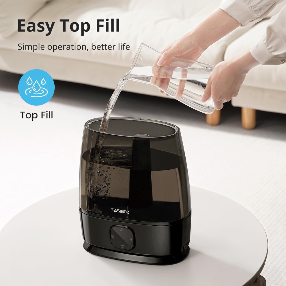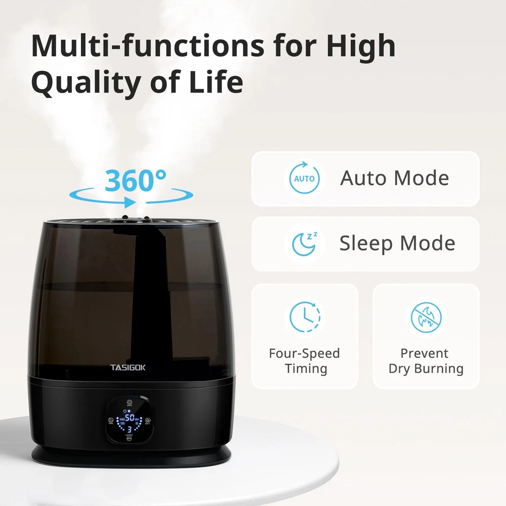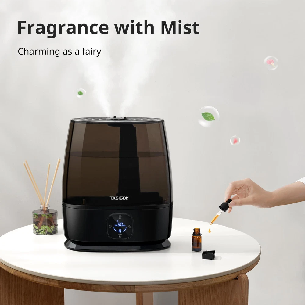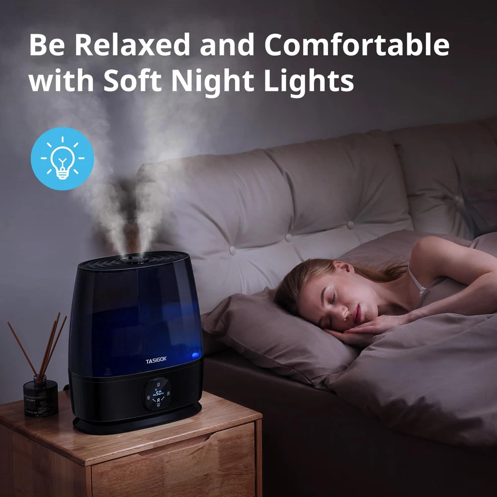 Large Room Whole House Humidifiers: 6L Large capacity, runs up to 50H, covering an area of 500 ft², provides your family members the whole home humidification, quickly relieves discomfort caused by dry air, is suitable for office desk, living room Ultrasonic Cold Mist Humidifier: 360° rotating nozzle, 4-speed timing, can meet the use of different scenes, 280ml/h mist, relieves congestion, sinus, cough, is suitable for skin care and indoor plants growing Quiet Smart Humidifier: -key auto regulation air humidity at 40~60%, noise Level: ≤28db, sleep mode can close all display, provides your baby a comfortable sleeping environment, is suitable for adults bedroom nightstand, baby nursery, small room 3 in 1 Portable Humidifier: Bedroom humidifier + essential oil diffuser + soft night light, provides steam treatment and aromatherapy, meets all your expectations, gives you a comfortable life Easy Top Fill and Clean Design: Plant humidifier is equipped with a detachable and spacious opening tank, is easy to move, avoids getting your desktop wet for a hassle-free cleaning experience Safety First Design: Baby humidifier with precision induction and waterless auto shut off function, eliminates the fire risks, is certified by FCC and TUV standards, provides you 1 year service Note: Auxiliary heating can improve the low TEMP environment humidification efficiency 15%. After cooling by mist tube, the TEMP of the mist outlet is about 88℉ which is still cold mist