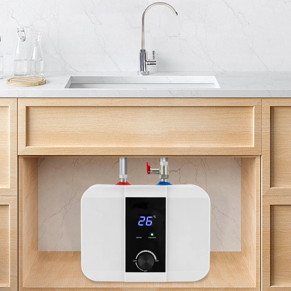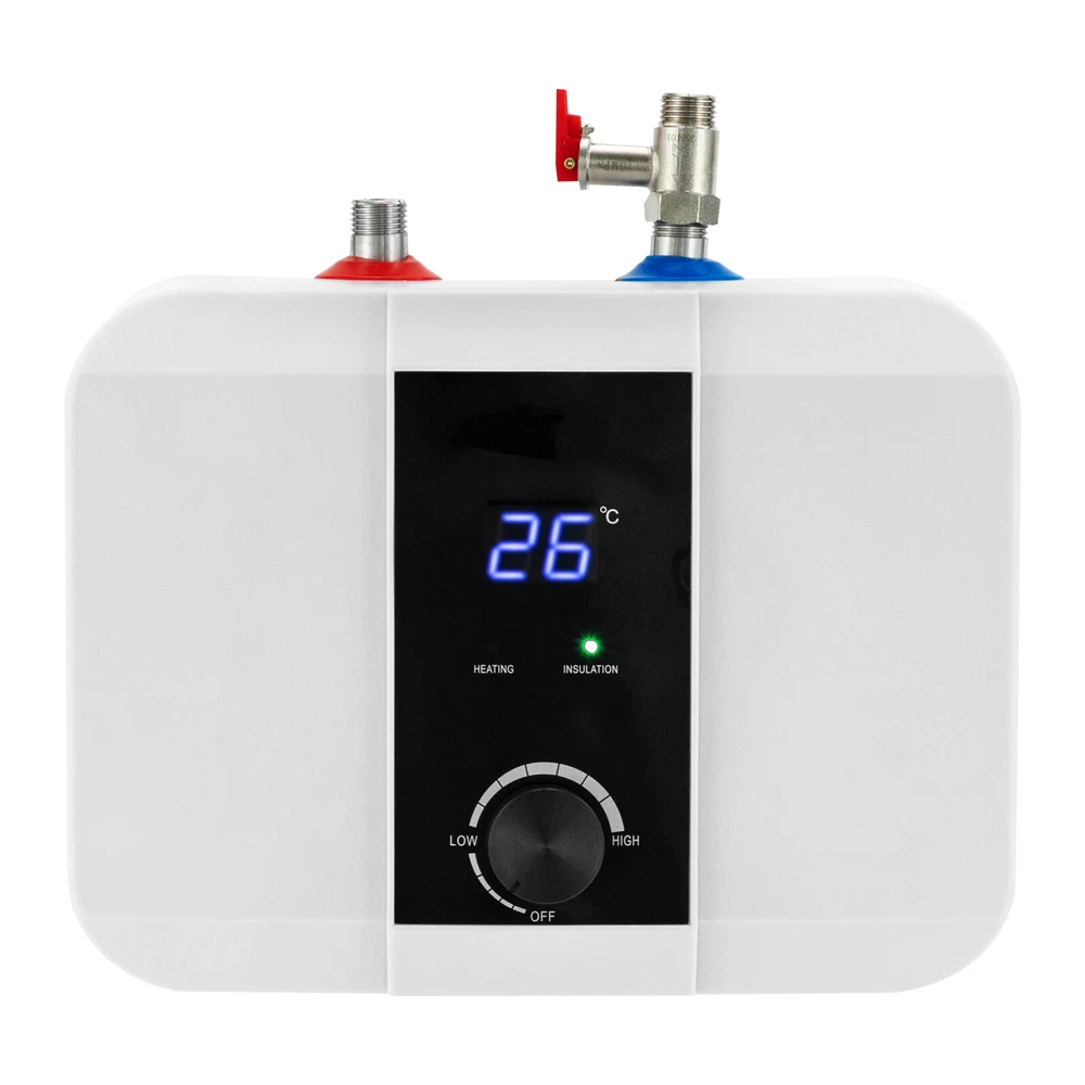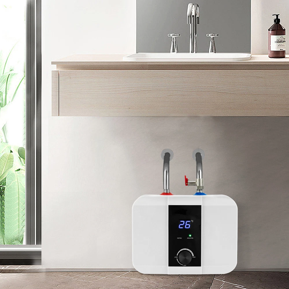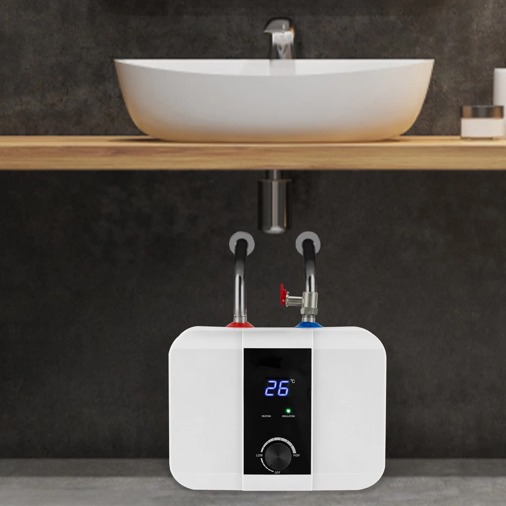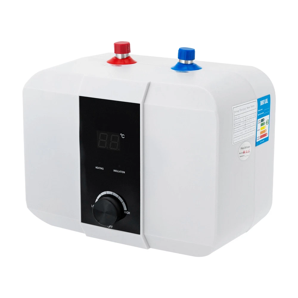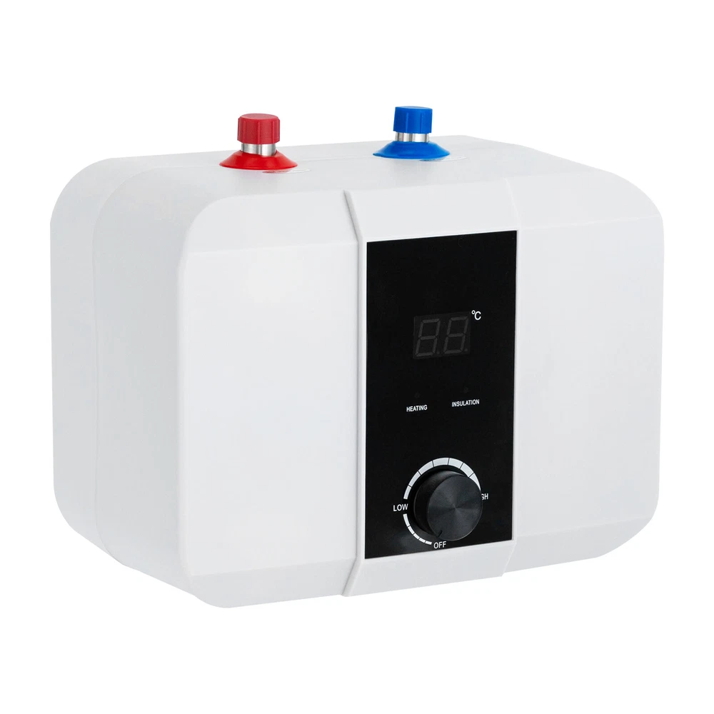 Specifications Color: White Material: ABS, 304 Stainless Steel, 316 Stainless Steel Process: Injection Mold Power Source: Corded Electric Plug Type: US Standard Assembly Required: Yes Mount Type: Wall Mounted, Floor Standing Screen Type: LED Control Method: Knob Water Outlet/Inlet: Upper Water Heating Time: 15-30min Temperature Range: 0-65℃/32-149℉ Interface Standard: G1/2" Wire Cross Section: 1.5mm² Start Water Flow: 0.4Mpa Rated Voltage: 110V Rated Frequency: 60Hz Rated Power: 1500W Rated Capacity: 6L/1.59Gal Nominal Pressure: 0.75Mpa Waterproof Grade: IPX4 Power Cord Length: 1-1.3m/3.28-4.27ft Product Size: 33*23*24cm/12.99*9*9.45in Packaging Size: 42*29*20cm/16.54*11.42*7.87in Gross Weight: 3.5kg/7.72lbs Package Included 1*Electric Water Heater 6L Mini Tank Water Heater Electric Tank Hot Water Heater Bath Under Sink 1500W Description This electric water heater features a compact size, fast heating, and easy installation, which makes it a great hot water solution for washing hands and dishes in your kitchen without taking up much space. The 304 stainless steel inner liner, 1500W high power, 1.59gal capacity, 316 stainless steel heating tube, LED display, controllable temperature knob, and pressure relief valve allow for simple operation while ensuring the health, safety, and convenience of your daily water use. Key Features High-quality Materials: Made of ABS, 304 stainless steel, and 316 stainless steel, the product is sturdy, durable, and highly resistant to corrosion, rust, high temperature, and deformation. Efficient Heating: With 1500W high power and 316 stainless steel heating tubes, the product ensures quick heating to eliminate the long wait. Safe&Healthy to Use: The 304 stainless steel is pressure-resistant, durable, and can ensure your water health. In addition, the product is equipped with a safety relief valve to ensure the safety of the product and you during use. Adjustable Temperature: The product comes with an LED display and temperature control knob, allowing you to easily control the temperature of the liner(32-149℉) to meet your daily washing needs such as brushing your teeth and washing dishes/vegetables/fruits/clothes/face/hands. Large Capacity: The 1.59gal capacity allows you to wash multiple sets of tableware at once and can meet the daily hot water supply needs of ordinary households. Thoughtful Design: The high-efficiency heat transfer liner will save you more electrical energy and its liner is smooth to reduce scale accumulation and extend its service life. The exquisite white appearance is suitable for various styles of kitchens. Compact Size: Compared to the traditional water heater, this product has a compact size(12.99*9*9.45in) that can be installed under the sink with a small footprint and save you more space. Simple Installation: The product can be hung on the wall or stand on the floor. The English instruction manual and accessories needed in the package make it easy for you to install and use the product. Protective Packaging: The foam can better protect your product during transportation so that it can be delivered to you completely to the greatest extent. Details Integrated Mounting Bracket: The one-piece high-strength hanging bracket is firm and anti-aging, making your installation more convenient and stable. IPX4 Protection Grade: The product is dustproof and moisture-proof, and prevents water splashed from different angles from entering, thus ensuring that it can work properly in a humid environment. Application It can be mounted on the wall or underneath the sink in your kitchen. Specifications Color: White Material: ABS, 304 Stainless Steel, 316 Stainless Steel Process: Injection Mold Power Source: Corded Electric Plug Type: US Standard Assembly Required: Yes Mount Type: Wall Mounted, Floor Standing Screen Type: LED Control Method: Knob Water Outlet/Inlet: Upper Water Heating Time: 15-30min Temperature Range: 0-65℃/32-149℉ Interface Standard: G1/2" Wire Cross Section: 1.5mm² Start Water Flow: 0.4Mpa Rated Voltage: 110V Rated Frequency: 60Hz Rated Power: 1500W Rated Capacity: 6L/1.59Gal Nominal Pressure: 0.75Mpa Waterproof Grade: IPX4 Power Cord Length: 1-1.3m/3.28-4.27ft Product Size: 33*23*24cm/12.99*9*9.45in Packaging Size: 42*29*20cm/16.54*11.42*7.87in Gross Weight: 3.5kg/7.72lbs Package Included 1*Electric Water Heater 1*Safety Relief Valve 1*Hose 1*English Manual Other Needed Accessories Notes Please check the size carefully before ordering. Please note that the product is not suitable for showering. Please read the operating manual completely before use. And pay particular attention to the safety instructions included. Installation conditions: 1) Tap water with a water pressure of 0.4MPA; 2) Hot and cold faucets; 3) The installation position of the water tower for water supply should have a height difference of more than 5m/16.4ft from the water tower. There must be a floor drain with sufficient drainage capacity near the installation site, and the installation space should be sufficient. The product is for the top water outlet, so please install it under the faucet. Please note that the product itself can not adjust the water temperature, the product needs to be used with a hot and cold mixer faucet to install and adjust the temperature. It is not recommended to use a single cold faucet. It is not recommended to use a one-way faucet, otherwise, the water temperature will be too high and may lead to scalding. The usage effect will also be poor. Please do not install this product horizontally, flat, or upside down. The water outlet can only be parallel to the wall. The installation position should be close to the faucet and the water pipe you prepared should not be too long, otherwise, the hot water outlet will be slow. When installing the machine for the first time, it is necessary to first connect the water and then power it on. (Turn the mixed water faucet switch to the hot water side, when the air is exhausted and water is