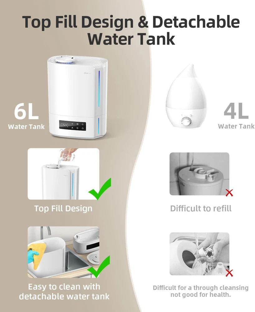 Product Description 6L Humidifiers for Bedroom Large Room & Essential Oil Diffuser, Ultrasonic Top Fill Cool Mist Humidifiers for Baby, Plants, Nursery Last up to 60 Hours, Smart Humidistat Control, Quiet, White POWERFUL HUMIDIFICATION, PERFECT FOR BEDROOM & BABY ROOM: Our ultrasonic humidifier has a 6L (1.6 gallon) large tank that works great in large rooms up to 500 sq feet. It allows a long lasting humidification for up to 60 hours. DIFFUSER & HUMIDIFIER 2 IN 1: Add your favourite essential oils to the built-in aromatherapy tray, the cool mist humidifier can mix your favourite aroma with the moist air and fill your room with relaxing aroma. AUTOMATICALLY CONTROL THE HUMIDITY LEVEL: Our humidifiers for bedroom is designed with a intelligent humidistat which helps to maintain the pre-set humidity level and allows you to check the real time humidity level. Just setup your preferred humidity level and let our humidifier do the rest. CONVENIENT TOP FILL DESIGN: Easily clean the water tank under running water with a detachable tank. It’s never been easier to maintain water in the tank. Just open the lid and directly add water into the working humidifier. WHISPER-QUIET & SAFE: Designed with a quiet sleep mode, our humidifier can work in low noise to protect your undisturbed good sleep. It would automatically shut off when water runs out. Safe for you and your whole family. About Us We are a reputable seller with many years of experience selling on eBay. Our goal is to provide high-quality products and excellent customer service. Shipping Items will be shipped within 1-3 business days when we received payment. (Orders are not processed on weekends & holidays) Tracking information will be sent once item is shipped. Delivery time depends on destination and other factors Item is shipped to ebay address. Leaving correct address can minimize delay. For international shipping and shipping to Guam, Hawaii and Alaska, Please contact us before placing the order. International buyers please note: Import duties, taxes and charges are not included in the item price or shipping charges. These charges are buyer’s responsibility. We will try our best to reduce the risk of the custom duties. Local pick-up is unavailable at the moment. Contact Us We reply any email messages within 1 business / working days(off-duty at weekend). If you do not get a response from us, then please check your junk or spam mailbox. Our Business hours: Mon-Fri 9:00-18:00, UTC/GMT +8 hours. Please contact us either by clicking "contact seller" in the "purchase history" section or simply click "ask a question" at the bottom of this page. If you are unsatisfied with our item or service, please contact us before leaving any feedback. We are committed to resolve all issues in a friendly and satisfactory manner.