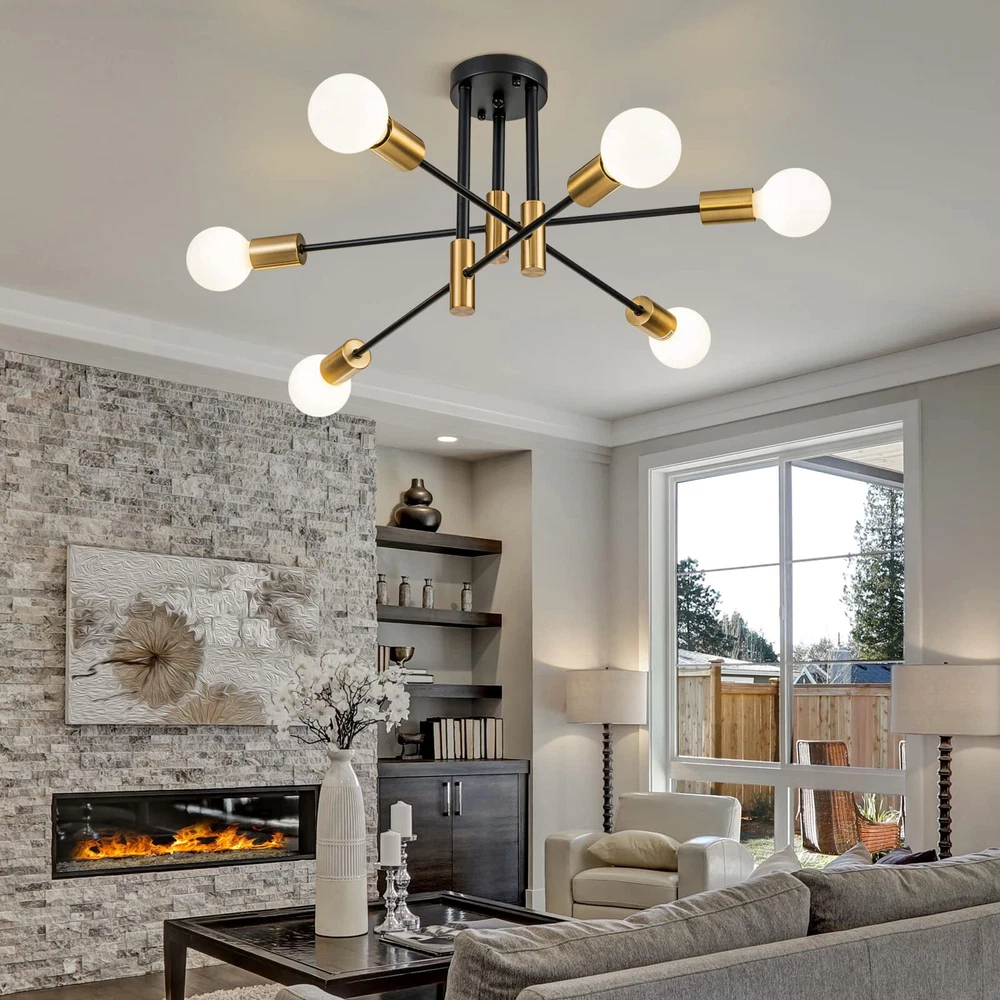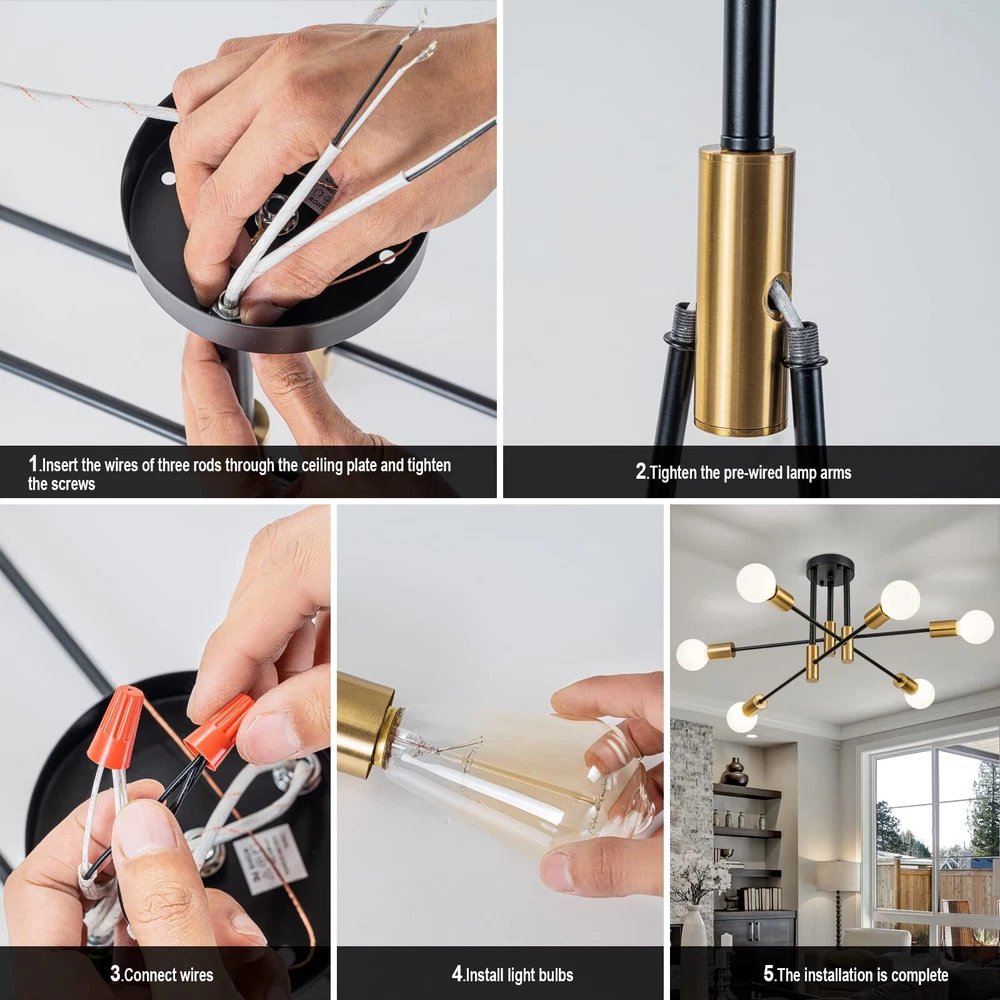 【MODERN DESIGN】- The ceiling light fixture is made of high-quality metal, strong and durable. Chandelier's arms are black, the interface and E26 base is gold, adopts advanced electroplating technology, antiseptic and anti-rust. Contrasting colors and geometry create a fashion feel for your room. 【Specification】- Arms length 24.41 inches/62cm, ceiling light height 11 inches/28cm, ceiling plate diameter 5.91 inches/15cm. The rod can be rotated 180 degrees horizontally, and you can find the shape you like by adjusting the direction of the light arm. 【Bulb Requirement 】- E26 Base, compatible with LED, CFL, halogen or incandescent (Maximum 60W, Bulbs Excluded). This semi flush mount chandelier is dimmable if you using dimmable switch and bulbs. 【Easy to Install 】- The arm of the sputnik light fixture has been pre-wired, and there is no need to wire inside the light, including all installation hardware, which can be installed quickly and easily (detailed installation instructions are attached). 【Wide Application】- The collision of modern luxury and retro texture, This pendant lighting will perfectly embellish your home living room, bar, coffee , dining room, kitchen island, bedroom, corridor, entrance passage, Foyer, Etc. 【After-Sale 】- Rustic chandelier comes with a 1-year on parts and professional & technical support. Please feel free to us if you have any problem.
