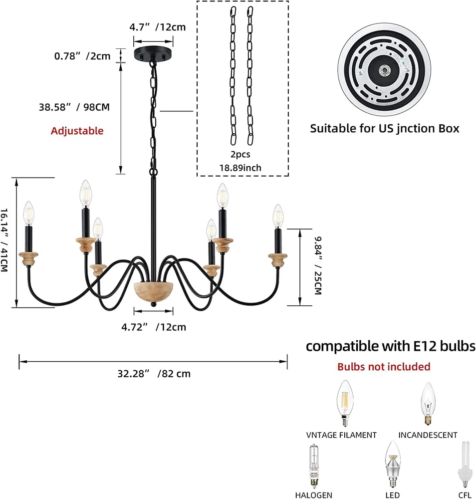 Store New Arrivals Add to Favorite View Feedback Contact 6-Light Wood Chandelier for Dining Room, Black Farmhouse Chandelier, Modern Light Fixtures over Table, Rustic Candle Ceiling Chandelier for Living Room Bedroom Entryway Kitchen, 32.5" Diameter Description Item model number A004 01 Light Source Type Halogen, LED, Fluorescent, Incandescent Style δΉ‘ζ Number of Items 1 Power Source Corded Electric Fixture Type Non Removable Number of Light Sources 6 Control Method App Warranty Type Limited Theme Farmhouse Batteries Included? No Lighting Method Multiple Controller Type Push Button Unit Count 1.0 Count Room Type Lobby, Kitchen, Bedroom, Living Room, Hallway, Dining Room Assembly Required Yes Switch Type Dimmer Product Dimensions 32.5"L x 32.5"W x 54"H Material Wood Installation Type user-installation Model Name A004 01 Finish Type Lacquered Specific Uses For Product Home Indoor/Outdoor Usage Indoor Brightness 1500 lumen Country of Origin China Light Color White Water Resistance Level Not Water Resistant Batteries Required? No Item Weight 5.99 pounds Light fixture form Ceiling Special Features Dimmable Special Feature Dimmable Part Number A004 01 Shade Color black Mounting Type Ceiling Mount,Over Table Color Wood Wattage 60 watts Bulb Base E12 Voltage 1.1E+2 Volts (AC) Shade Material Wood Finish types Lacquered Included Components Mounting Hardware Size 6 Light π‘γ Farmhouse Candle Style Chandelier γ - This black chandelier with 6 vivid candle-shaped bulb socket adds a wooden element, that has a modern touch while adding a farmhouse atmosphere. It is bright enough to illuminate the whole space well and give your home a warm aesthetic. π‘γ E12 Base & Dimmable γ - Compatible with any LED/CFL/or other bulbs with E12 Base ( max 60W ), can be fully dimmable when used with dimmable bulbs and dimmer switch (Bulbs & Switch NOT Included). You can choose different style bulbs and color temperatures to create the atmosphere you want. π‘γ Adjustable Height γ- Adjustable Chain's length: 2 IN - 40 IN, you can adjust the length easily according to your needs. Lamp's diameter: 32.5β, Lamp's height: 15.7β. The black chandelier can be applied to all ceilings including flat, slanted, vaulted or sloped ceiling. π‘γ Ideal & Wide Application γ-This farmhouse chandelier is simplistic but distinctive, will fit well with dining table, living room, bedroom, kitchen island, farmhouse, foyer, hallway, cafe, bar, restaurant, and etc. It is definitely the best choice for your home lighting and decoration. π‘γ Super Easy to Install γ- The chandelier comes with all installation accessories and instruction manual. You can complete the installation by guidance easily and quickly. Product Description ABOUT US We offer the best prices around on high quality products. Our E-store includes media such as books, movies, music and games while offering electronics, toys, sporting apparel, clothing, tools, general home, garden items and more. SHIPPING We are always working hard to ensure your package arrives as soon as possible. Please understand that some factors like weather, high postal traffic, and the performance of shipping companies are outside of our control. We offer free shipping to the lower 48 states and ship within 2 business days of payment, usually sooner. We do not accept P.O. Boxes. Please provide a physical address. For shipping outside of the continental USA, we only use eBay's Global Shipping Program.The item is shipped to KY and then sent to the rest of the world. International customers are responsible for all duties and taxes. Continue to check out in order to calculate costs for shipping the item to your country. Messages regarding eBay's Global Shipping Program MUST be directed at eBay EXCLUSIVELY. RETURNS We offer a 30-Day Return Policy on items which you are not completely satisfied with. You have the option for a full-refund or an exchange of the item. No returns are available on items shipped outside of the USA. PAYMENT We accept PayPal. CONTACT US This page content is yet to come Please ad us to your favorite seller and visit again later Thank You CUSTOMER SATISFACTION We try our very best to make sure every customer is completely satisfied. If there's a problem, message us! We're happy to help. WE ACCEPT Copyright Β© 2021 AutoDS. | All Rights Reserved