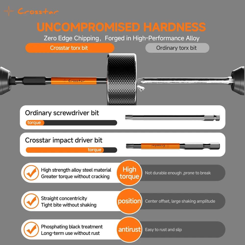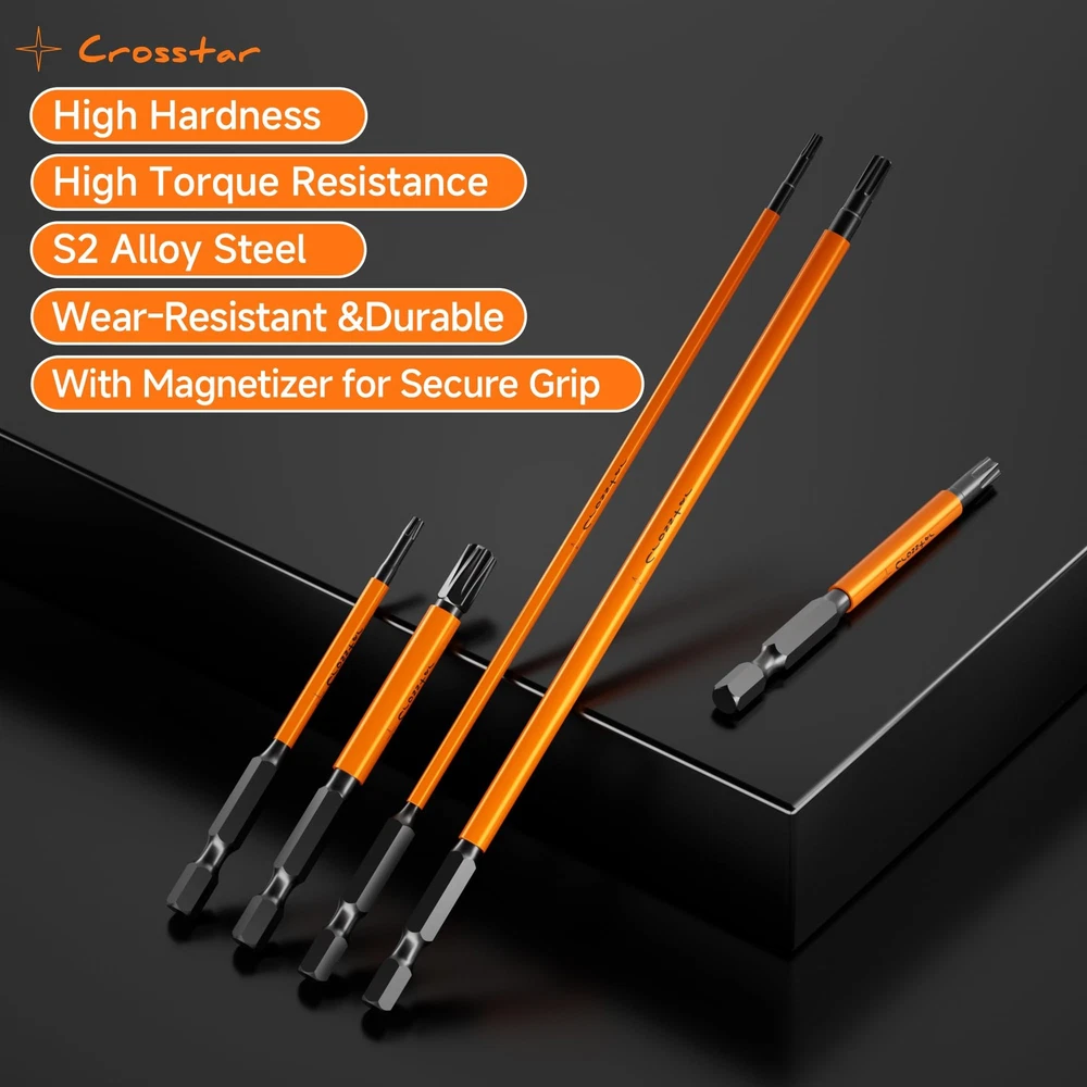 【14 Commonly Used Drill Bits, 1 Magnetizer】This product is 6 inches long, about 15.24 cm, carrying T7, T8, T9, T10, T15, 2 T20, 2 T25, 2 T27, T30, T35 and T40 models with 1 magnetizer. The product is suitable for use with tools such as impact drivers, drills and screwdrivers 【High-quality S2 steel, CNC precision manufacturing】The main body of this product is made of high-strength and high-toughness S2 steel, wear-resistant and high-temperature resistant, not easy to be corroded, which greatly extends the service life of the drill, and is equipped with eye-catching orange paint, the product model number is clearly marked, and can be quickly detected.CNC machine tooling ensures that the accuracy and overall quality of the drill, can excellently complete a variety of work tasks 【Tamper-resistant torx bits and magnetic design of the bits】 The tamper-resistant design of the bits allows them to be used in work environments where enhanced security is required. The drill is equipped with a magnetic function to hold small parts, nails and other objects during work, ensuring that parts are not easily lost 【Magnetic add/drop function and slim size design】You can use the magnetizer to magnetize or demagnetize the drill bit according to your actual use, in order to better complete your work. 6 inches long drill bit makes this product can be used in more work scenarios 【Easy to Store and Carry, Suitable for Multiple Scenarios】Transparent storage box design, you can visualize the drill accessories inside. The storage box is small and lightweight, can be put into the pocket, carry with you. This product can be used for furniture assembly, maintenance of household appliances, etc., but also can be used to repair electronic equipment, driving tools, precision instruments, etc