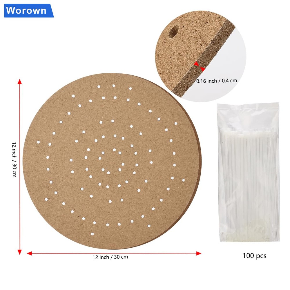 6-Pack 12-Inch WreathBoards, Wreath Forms, Wreath Frames with Holes for Crafting Wedding Wreath Decorations, Christmas Ornaments, Halloween Accents, Thanksgiving Day Accessories, and Wall Mountable Artworks Package Includes: 6 round wreath boards Approximate Size: each wreath board has a diameter of 12 inches Material: Wood wreath boards and nylon ties These wreath boards are ideal for creating floral hoop wreaths, macrame crafts, plant hangers, and other diy projects. they are perfect for decorating wedding wreaths and crafting wall hangings. Package included: 6 pieces of wooden wreath boards and 100 self-locking zip ties Size(approx.): Each round wreath measures 12 inches in diameter, while the zip ties are 6 inches / 15cm in length, making them ideal for DIY wedding wreaths and wall hanging crafts Material: Our round wreath boards are constructed from high-quality density boards and come with nylon ties known for their durability, flexibility, and eco-friendliness Applications: Featuring a number of guide holes, these wooden wreath boards make crafting floral hoop wreaths, dream catchers, macrame crafts, plant hangers, and other decorations easy. They are great for weddings, wreath decoration, and wall hanging crafts Compatibility: The wreath boards work well with a range of materials, such as cotton, fabric, curtains, ribbons, and other materials that can be used to create different types of exquisite crafts