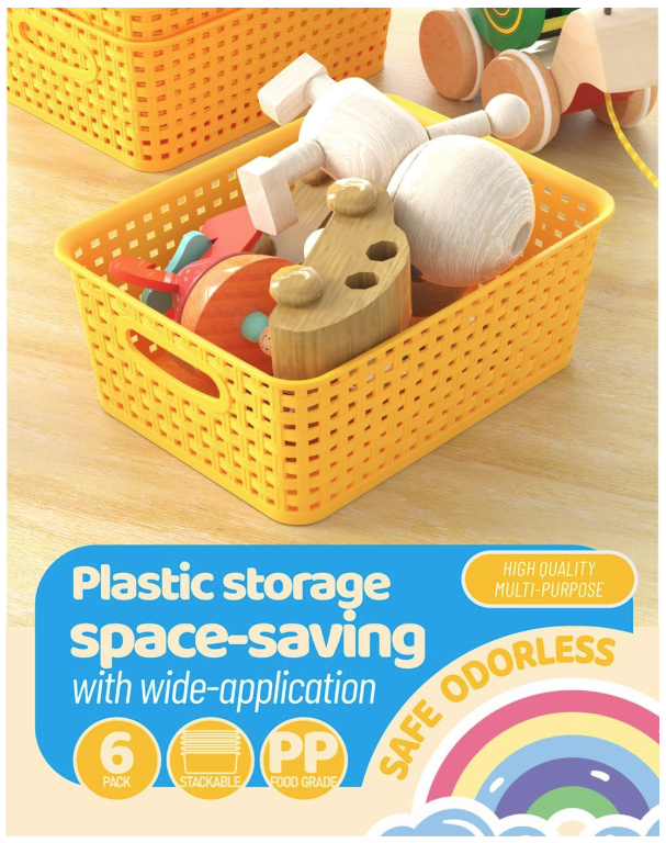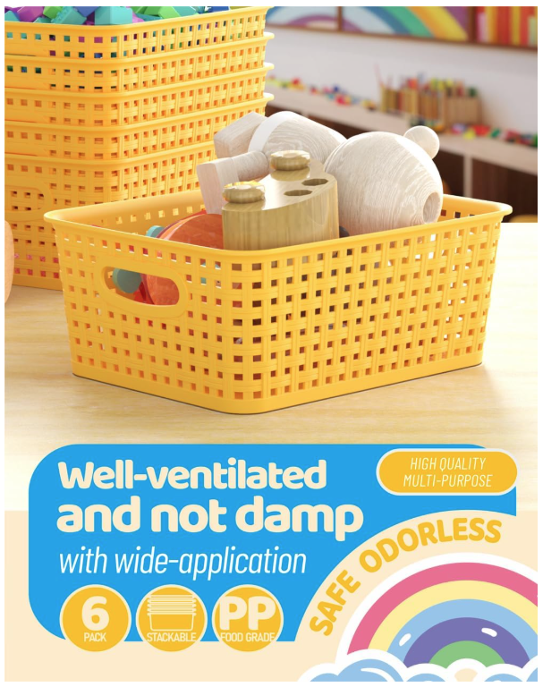 6-Pack Yellow Plastic Storage Baskets for Shelves Cabinets Pantry