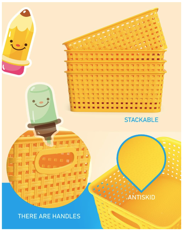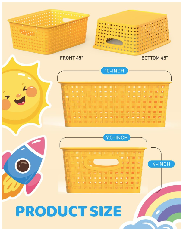 Assembly Required: No Material: Plastic Country/Region of Manufacture: Unknown Shape: Rectangular Item Length: 10" Type: Storage Basket Item Width: 7.5" Number in Pack: 6 Number of Compartments: 1 California Prop 65 Warning: No Item Height: 4" Brand: Unbranded Item Weight: Less Than 2 lb gtin13: Does not apply Color: Yellow Style: Modern UPC: Does not apply MPN: Does not apply