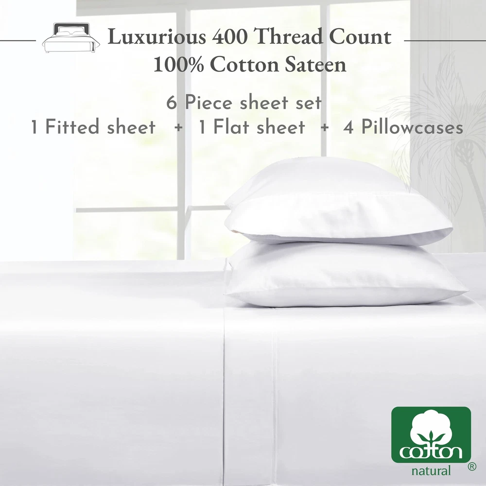 6-Piece Sheet Set with 4 pillowcases - 100% Cotton 400 Thread Count long-lasting white Queen size bed sheet set includes 1 Flat Sheet (90" W x 102" L), 1 Fitted Sheet (60" W x 80" L + 16" Deep Pocket), and 4 Roomy Pillowcases (21" W x 30" L with envelope closure). Our cotton sheets feature an all-around elastic for a perfect snug fit and are durable to withstand fading, pilling and wrinkling. Savor Your Sleep - Experience the softest, coolest, and most breathable 100% pure, long-staple cotton. Our cooling fine linen 400 thread count cotton bed sheets set are carefully handcrafted and firmly stitched for perfection. Hotel Quality Comfort - Fitted deep pocket cotton sheets for Queen size beds promise a snug fit, and feature smart head & footer tags to save time. The hotel signature sateen weave makes this your most comfortable bedding set. NO HARMFUL SUBSTANCES & EASY TO MAINTAIN: It’s easy to take care of our 100% cotton sheets. Toss them in a machine for a quick wash. These queen sheet sets become softer with every rinse—and do not shrink, , and fade. They are also independently tested and certified as STANDARD 100 by OEKO-TEX® to be free from harmful chemicals. OUR COMMITMENT: In 2022 & 2023, we donated over 22,000 pieces of bedding to local charities in the USA. We do not use plastic in our packaging, and our sheets are produced in our family-owned and operated factory in India. Each piece is inspected for quality, and we promise to replace any defective products at no cost to you. Buy with confidence with our 30-day return policy, even if you've washed or used our product.