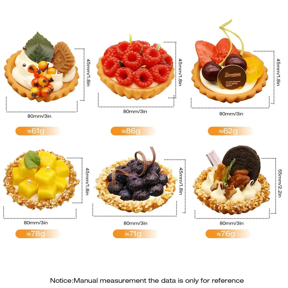 6Pcs Fake Desserts Artificial Egg Tart Models Realistic Simulated Fake Cake Artificial Food for Display Fake Fruit Egg Tart for Photography Props Kitchen Home Decoration Description and features 【Material】The Artificial Egg Tart is crafted from PU and PVC, so it is safe to handle and will never spoil, you can use them for years to come! 【Size】The Egg Tart Model is exactly the same size as most real ones, its bottom diameter is 8cm/3.15 inch and the height is 5.5 cm/2.17 inch. 【Realistic】These fake desserts look extremely realistic, bright colors and clever design make these Simulated Fruit Egg Tarts look delicious and squishy. 【Widely Used】These fake cakes are perfect for restaurant bakery display, home decoration, model room display, you can also use them for props and photo shoots. 【A Nice Gift】We have 6 fake cakes in the package, If you have friends who are in baking or photography, this would be a great gift for them. Description 6Pcs fake desserts Artificial Egg Tart Models Realistic Simulated fake cake artificial food for display Fake Fruit Egg Tart for Photography Props Kitchen Home Decoration Realistic: These fake desserts look extremely realistic, bright colors and clever design make these Simulated Fruit Egg Tarts look delicious and squishy. Material: The Artificial Egg Tart is crafted from PU and PVC, so it is safe to handle and will never spoil, you can use them for years to come! Size: The Egg Tart Model is exactly the same size as most real ones, its bottom diameter is 8cm/3.15 inches and the height is 5.5 cm/2.17 inches. Widely Used: These fake cakes are perfect for restaurant bakery display, home decoration, model room display, you can also use them for props and photo shoots. A Nice Gift: We have 6 fake cakes in the package, If you have friends who are in baking or photography, this would be a great gift for them. Return Policy ⦿ All our products come with a 30-Day Return Policy. If you would like to return your item and you are within 30 days of the purchase, and it is still in its original condition, you can return the item by contacting us through eBay messaging. ⦿ If you are not 100% satisfied, please let us know the Detailed Problem,We will give you a 100% satisfactory solution ⦿ If you received an incorrect, damaged, defective, or item not as described, contact us for a partial/full refund or replacement on our cost. ⦿ Free Shipping and Free Return 30-Days Money Back Guarantee. ☎ For all returned products, buyers MUST contact us for the returning address. Shipping ⦿ We do not ship to a different address. we will ship to the address you provide on the ebay only. Please check your address before purchase. ⦿ It should take 2-4 business days for the product to reach your destination. ⦿ If the product doesn't reach your destination within the time limit, please give it an additional 1-2 business days in case of postal delays and/or possible technical issues. ⦿ We use a selection of shipping services such as UPS, FedEx, USPS etc. ⦿ We ship only to the 48 contiguous states of America. We do not ship to Hawaii, Alaska, US Protectorates, APO/FPO addresses. Local pickups are not offered. ☎ If it takes any longer than that, please do not hesitate to contact us to resolve the issues. Contact us ☎ Please contact us via eBay message. And your message will be replied within 1 business days. For any queries, please feel free to contact us, we will get back to you as quickly as possible. Customer 100% satisfaction is our first priority and goal. We are always working hard for maintain high standards of excellence and resolve your problem in best way. So your POSITIVE FEEDBACK is very important. If you have any problem of the item, please feel free to let us know before leaving your feedback. We will try our best to solve your problem. About us We are here to give you quality products, competitive pricing and amazing service in order to make sure you get the best deal online, Thank you for your business and the opportunity to serve you.