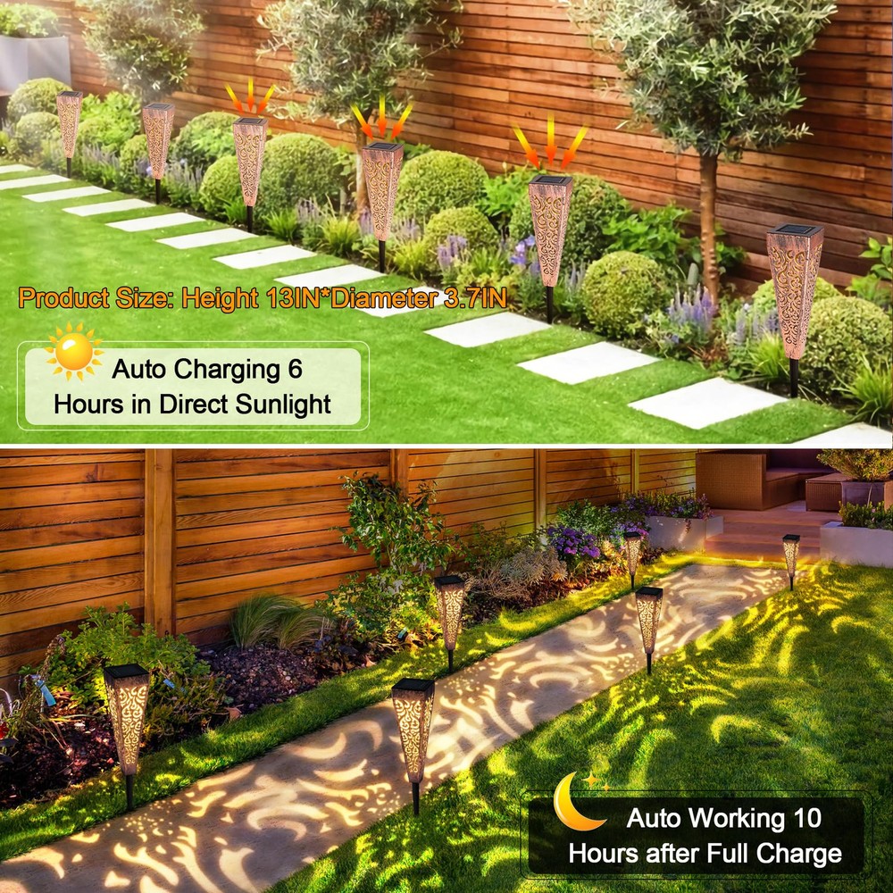 8 Lumens: the solar powered garden lights charge during the day ( under direct sunlight) and turn on automatically at night for up to 8 hours when full charged.The lights provide a great touch and a warm ambience in the evening. Weather-resitant: The outdoor solar yard lights made with quality material ensure long lasting performance under most weather conditions. No worries about rain, snow. (Winter tips: keep debris and snow off the solar panel to allow the battery to recharge). Size: Diameter 7cm* Height 33.5cm. The soalr walkway lights display a fantastic flame pattern and add great accent to backyard/ frontyard. Satisfaction : If you have any issue on the solar path lights, please seller () directly to get replacment or (360- day ) Features: Easy to assemble and install into the ground, no wiring need, rechargle battery included, save energy. The LED solar landscape lights is a nice garden gift for your friends.