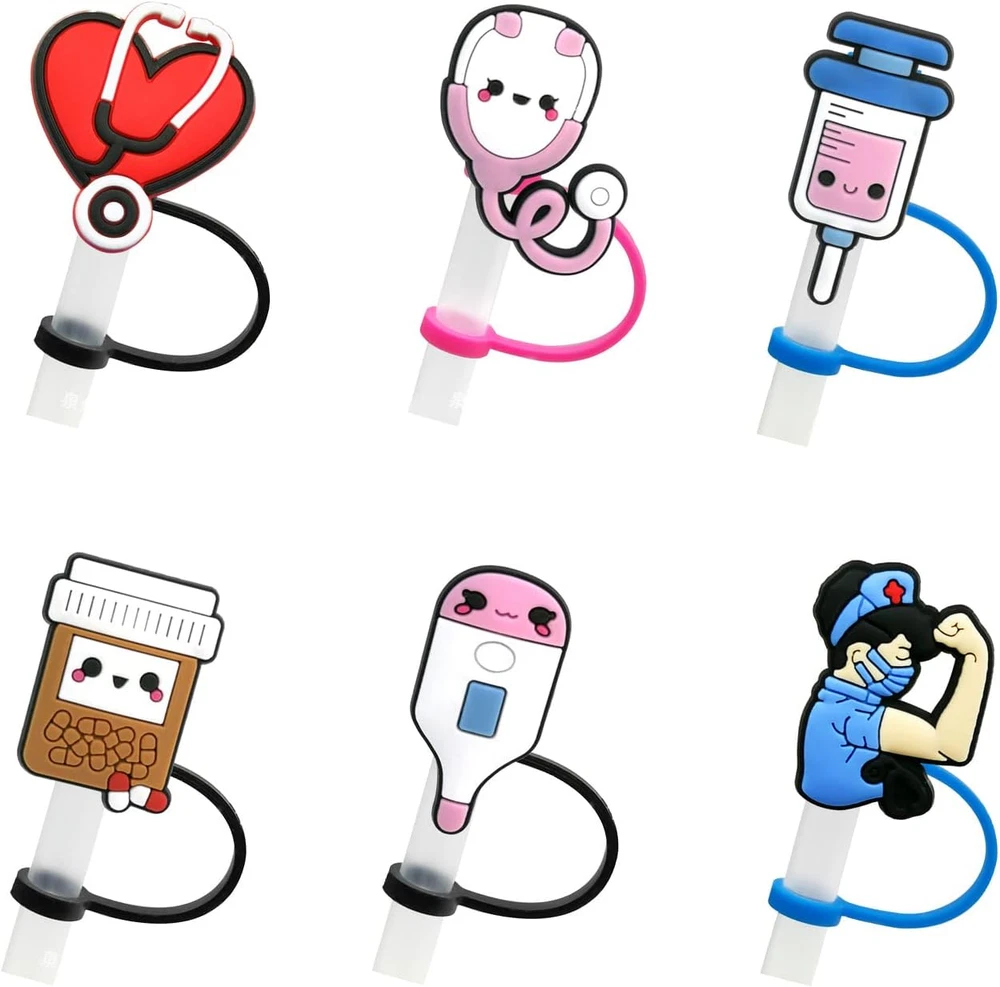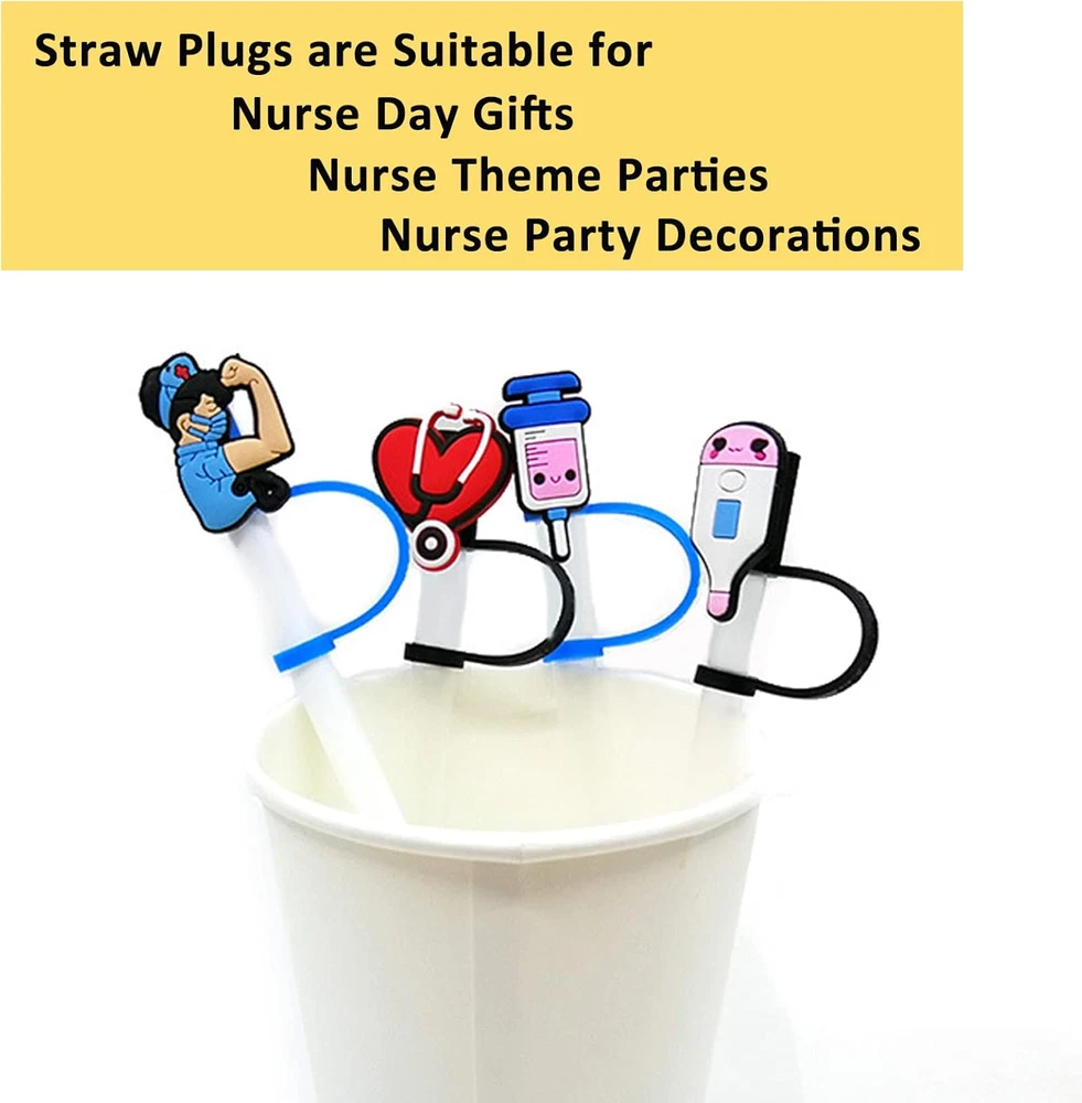 【Reliable Material】---Our silicone straw covers cap are made of food grade silicone, durable, reusable, BPA free, non-toxic and odorless. Made of high quality silicone, which is safe and durable for a long time use. 【Suitable Size】---Our straw tips covers are very suitable for all types of straws from 7 to 8 mm. Compact and appropriate for you to use, bringing you a nice and satisfying experience. 【Practical Gifts】---These straw tips covers are great for decorating your straw cup. You can give it to your loved ones and friends, they will love it when they receive the gift. 【Easy to Operate】---These straw toppers can be fixed on straws directly, and can be directly removed when using the straw, the plug will hang on the straws, not easy to fall off, and practical for protecting your straws away from dust. 【 Cute and Fun】--- Our silicone straw tip lids are decorated with nurse themed patterns, decorated with various nurse party styles, such as heart shaped stethoscope, needles, hearts, and so on, stylish and clever. 6 pcs Silicone Straw Plug Drinking Dust Cap Cute Splash Proof Straw Tips Reusable Cartoon Plugs Cover Cup Accessories Features: These straw plugs are suitable for nurse theme parties, nurse party decorations, Nurse Day gifts, etc. These cute straw caps are dust and splash resistant, making them ideal for outdoor activities. Size: 7-8mm Color: assorted color Material: silicone Package Include: 6pcs Reusable Silicone Straw Cover Please Note!!! We only have silicone straw plugs in our package, not including straws!