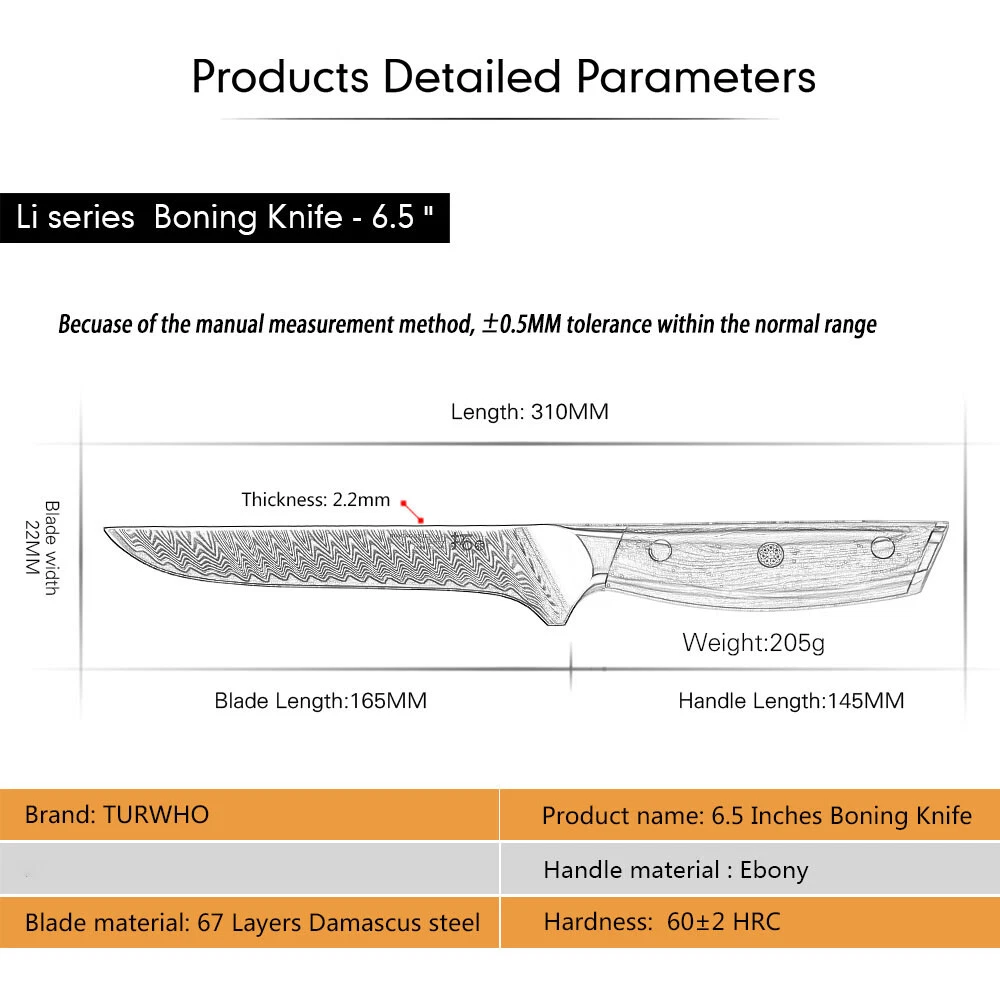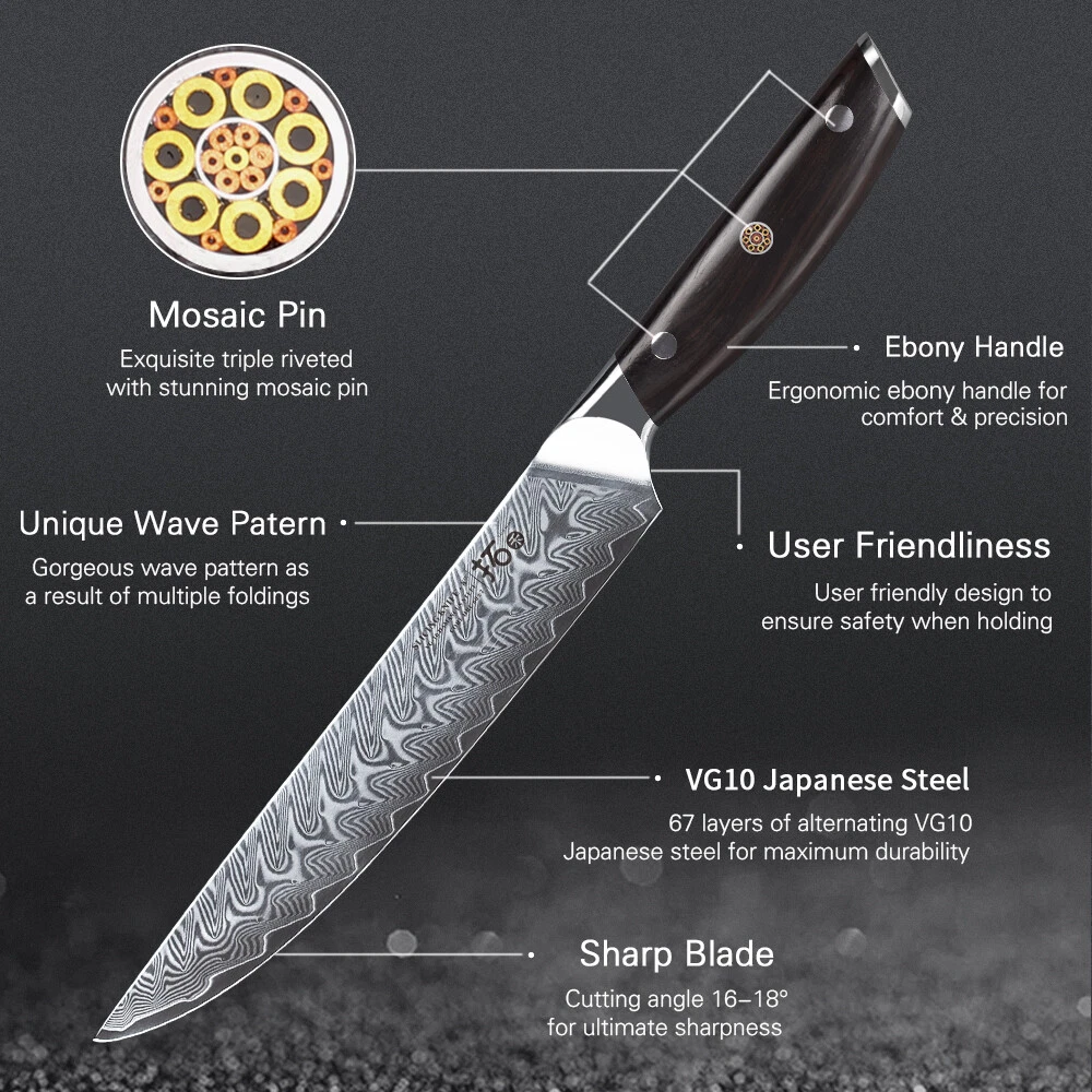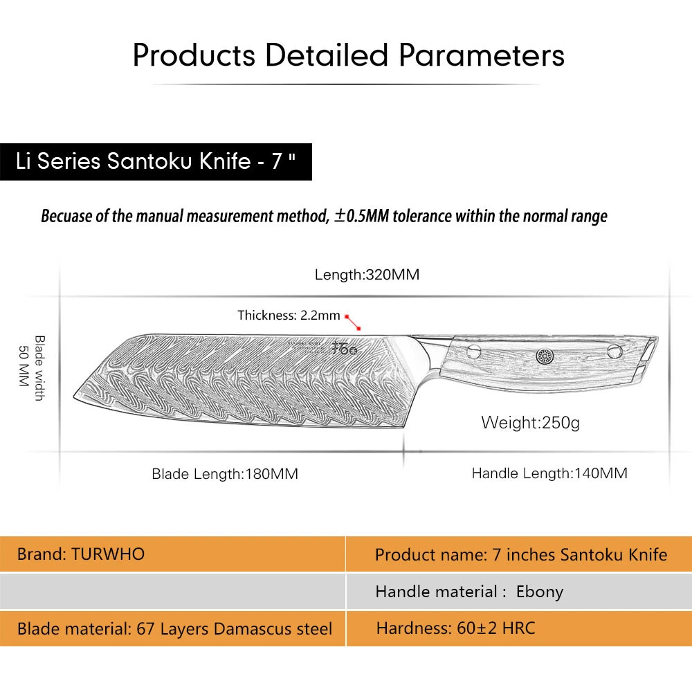 Number of Items in Set: 6 Handle Material: Ebony Blade Edge: Straight gtin13: Does not apply Features: Easy Clean, Well Balance, Very Sharp, Gift Box Type: Knife Set Manufacturer Warranty: Lifetime Food Compatibility: Universal UPC: Does not apply Brand: TURWHO Blade Length: 6.5in, 7in, 7in, 8in, 8in, 8.2in Room: Kitchen Making Method: Hot Air Color: Black Bundle Description: 6x Knives in Gift Box Set Includes: Knife Set Material: Japanese VG10 Damascus Steel MPN: EB1116-6P Cutting edge: 16-18 degrees